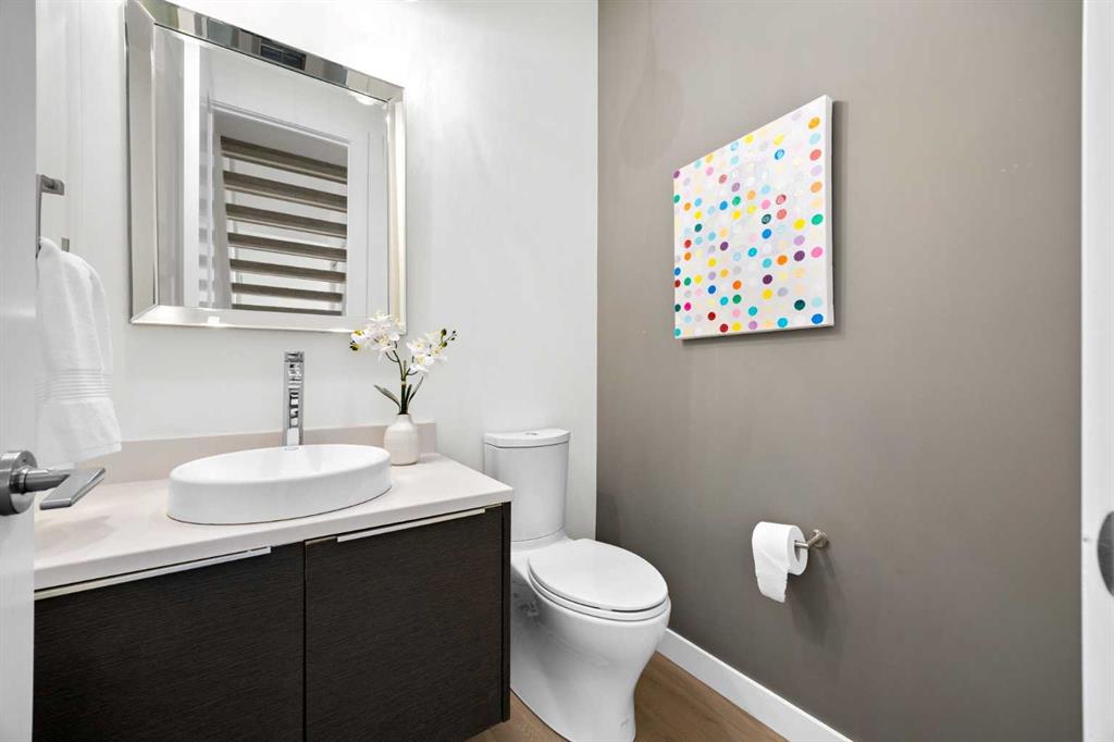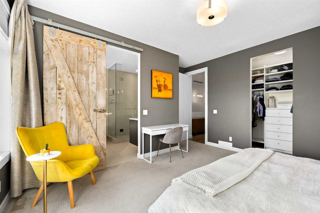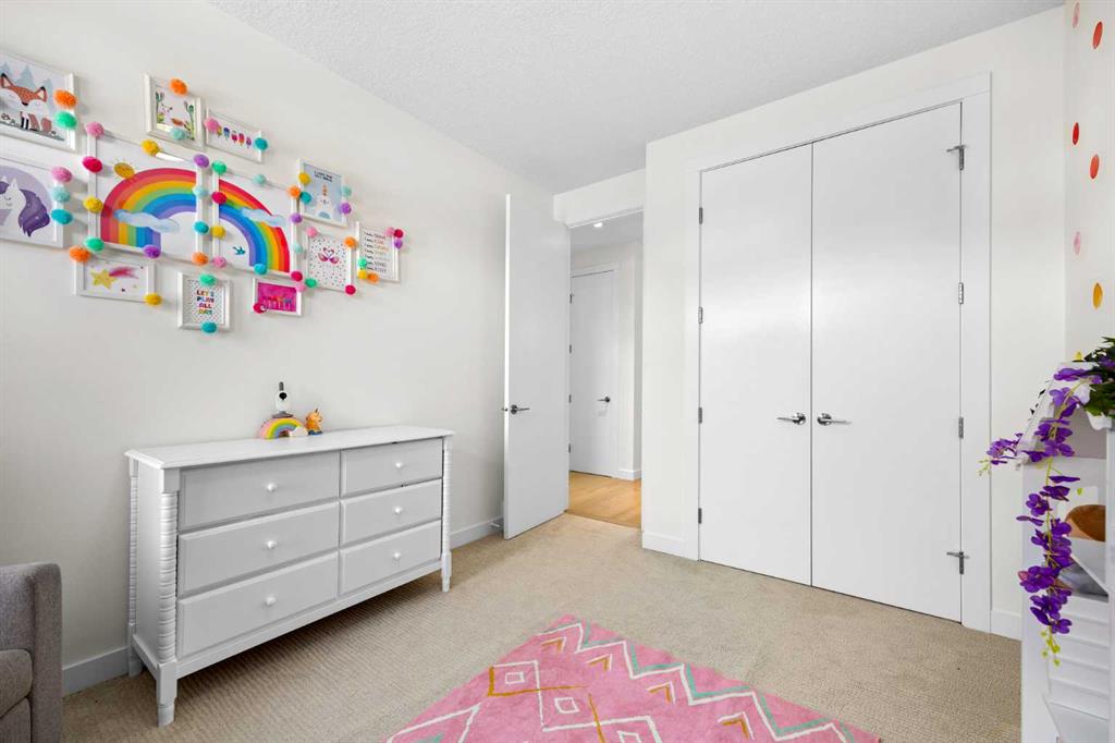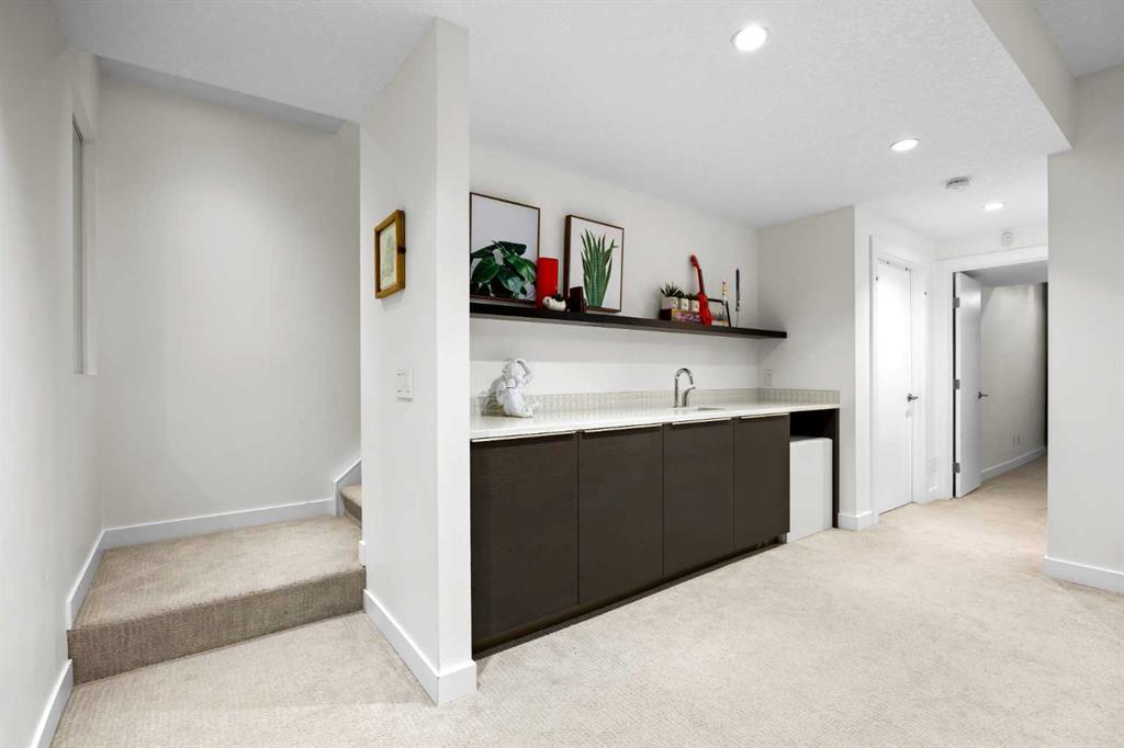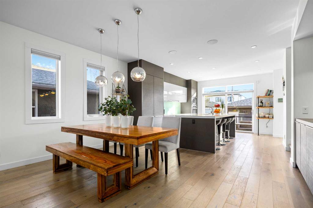 The bright open-concept main floor is filled with natural light and features engineered wide-plank white oak hardwood flooring throughout. The designer kitchen showcases two-tone cabinetry, quartz countertops, a large island with seating, glass backsplash, and stainless steel appliances. The spacious living room is anchored by a cozy gas fireplace, creating a warm and inviting space for both entertaining and everyday living. A custom glass feature wall seperates the main floor to the upper level along with open riser stair case letting in an abundance of natural light, custom built-in cabinetry allows for extra storage to keep everything organized, and a convenient powder room add both seemless living and practicality. Upstairs, the primary suite offers a private retreat with a large walk-in closet and a spa-inspired ensuite complete with a glass shower, deep soaker tub, dual vanities, heated floorrs and modern finishes. Two additional generously sized bedrooms, a full bathroom, and an upper-level laundry room with additional storage provide excellent functionality for growing families or busy professionals. The fully finished basement expands the living space with a large recreation or media room with wet bar, a fourth bedroom ideal for guests, a home office, or gym, and a full four-piece bathroom. The home is also complete with central Air Conditioning and heated floors in all full bathrooms. Step outside to enjoy the private backyard and patio located just off the kitchen, perfect for seamless indoor-outdoor living and summer entertaining. The outdoor space is complete with a gas BBQ line, sandbox and access to a detached double garage. Situated in the desirable inner-city community of Killarney, this home offers exceptional walkability to neighbourhood parks, the Killarney Aquatic & Recreation Centre, local shops and cafés, and favourites like Luke’s Drug Mart. Enjoy quick and convenient access to downtown, major routes, and Mount Royal University. With ongoing redevelopment, strong community character, and excellent amenities, Killarney continues to be one of Calgary’s most sought-after inner-city neighbourhoods.