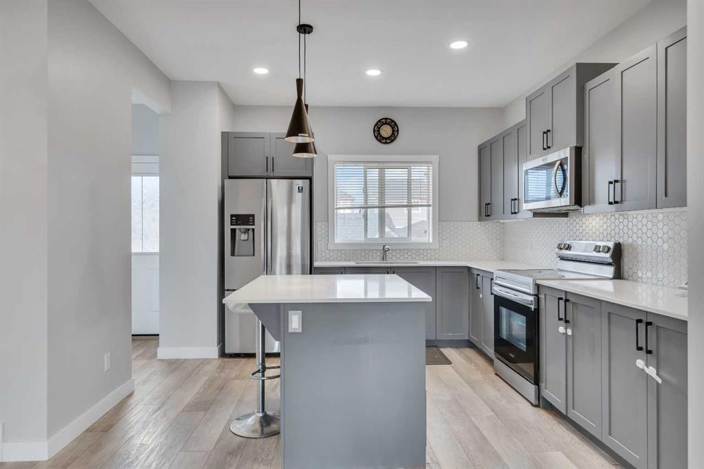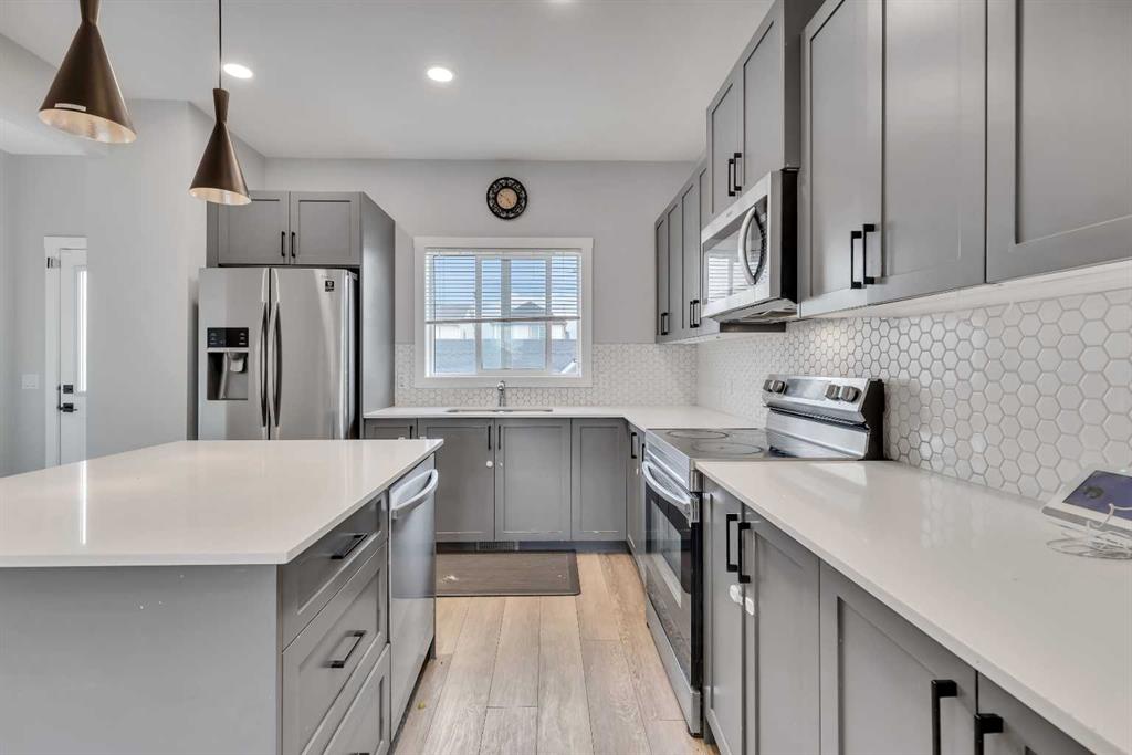 Introducing this MAGNIFICENT lane home located in the highly desirable community of Hillcrest in Airdrie. This exceptional property offers a spacious and well-appointed living space, perfect for those seeking comfort and convenience. The kitchen is a true centerpiece, featuring an island with QUARTZ COUNTERTOPS, ADDITIONAL KITCHEN LIGHTING, 42” UPPER CABINETS, a built in microwave, STAINLESS STEEL appliances, and plenty of pan drawers.