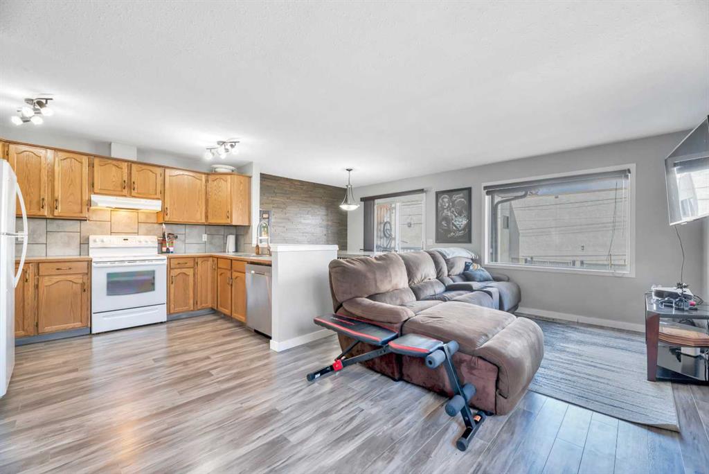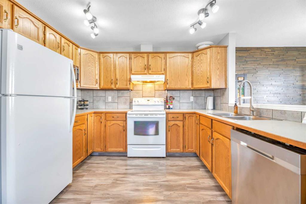Welcome Home! Bright and spacious townhome with over 1000 sq ft is located in the heart of Strathmore and just a few minutes walk to Kinsmen Park. The main floor boasts an open floor plan with new laminate flooring, a well appointed kitchen with plenty of cabinets and counter space, large living room with computer nook and newly renovated 2 piece bath. The dining room with patio doors leading to your covered balcony and access to your fully fenced and private courtyard complete this level. The finished basement has 2 good sized bedrooms, recently updated main bath, laundry room and still plenty of storage space. There are no monthly condo fees! Located close to the many amenities that Strathmore has to offer and an easy to commute to Calgary. This home is not to be missed. Call today for a viewing!
