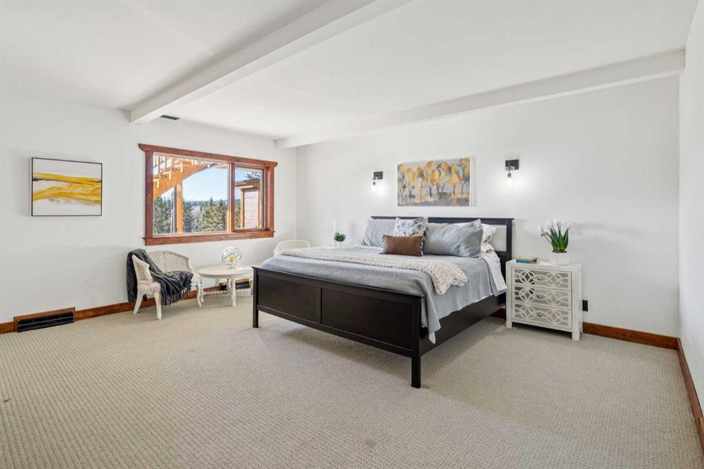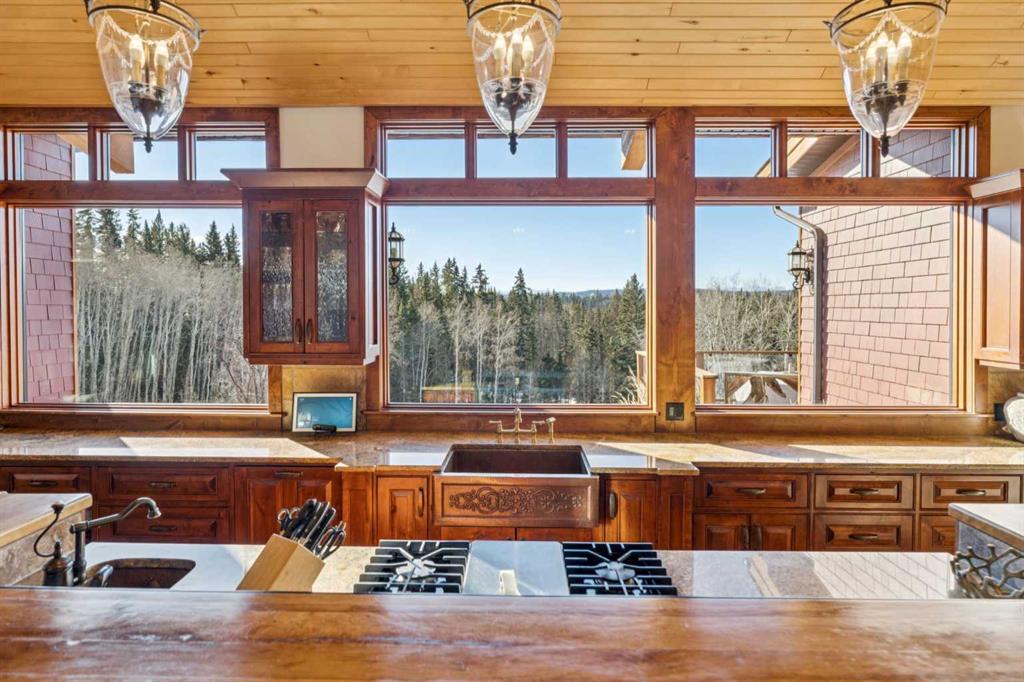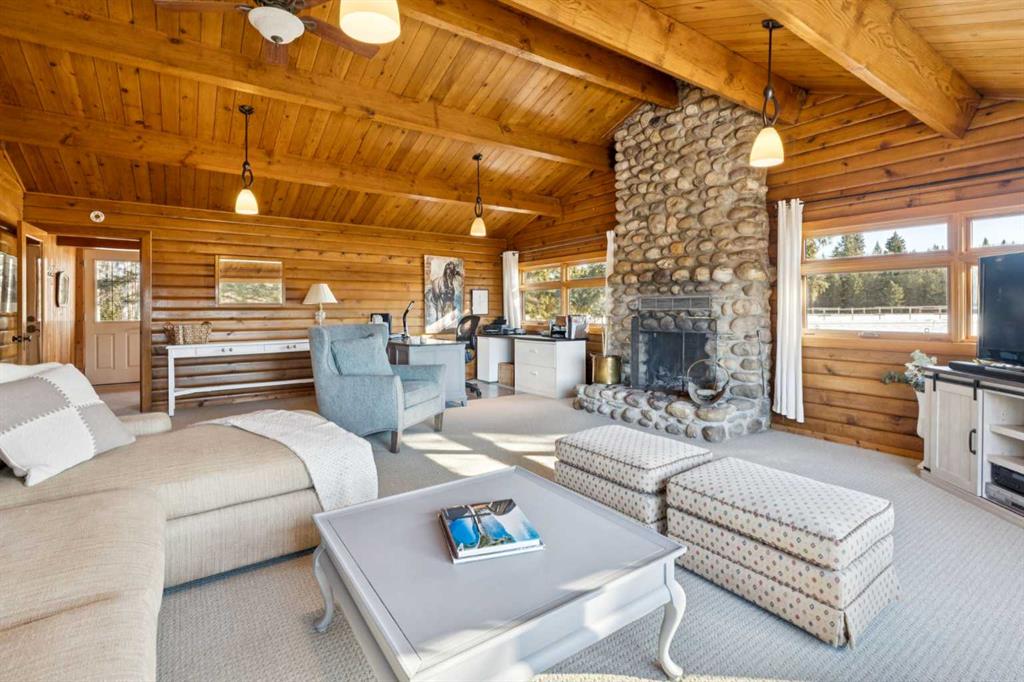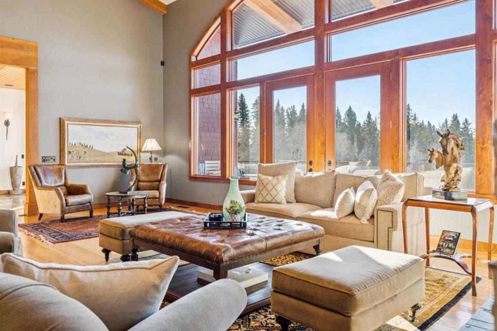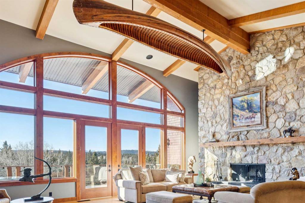 This is a property defined by lifestyle. From the moment you arrive at the secure electric gate and begin the gentle journey down the winding, tree-lined driveway, the outside world quietly fades away. Take a deep breath—what awaits is a rare sense of calm, privacy, and connection to nature. Perched above Fish Creek, this remarkable 7,222 sq. ft. bungalow commands breathtaking views of the creek below, open fields, rolling foothills, and distant mountain vistas. A wraparound deck spanning the south and west sides of the home invites you to fully embrace the outdoors—whether watching wildlife pass by, listening to the soft sounds of the creek, or enjoying sunsets that never disappoint. Step through the dramatic front entrance and you are immediately greeted by soaring vaulted ceilings, a stunning wall of windows, and uninterrupted views beyond. Custom stonework and timeless timber-frame construction define the home’s architectural character, creating a seamless blend of natural materials and refined craftsmanship. The expansive living spaces are perfectly designed for entertaining—whether hosting intimate gatherings or larger celebrations, indoors or out. This is a residence where the outdoors is intentionally brought in, offering warmth, scale, and a true sense of place. The gourmet kitchen features a generous dining area, an abundance of cabinetry and counter space, and a beautiful screened summer dining room—ideal for seasonal entertaining. Enhancing the lifestyle experience is an attached pool house complete with a 16′ x 30′ indoor heated pool, hot tub, games area, and a cozy sitting space with fireplace for year-round enjoyment. The primary retreat features soaring vaulted ceilings, a wood-burning fireplace, and two sets of patio doors leading to the deck and pool area. The luxurious ensuite offers a two-person air tub, double vanities, walk-in shower, and a spacious walk-in closet with floor-to-ceiling built-ins. The main floor office showcases distinctive copper ceiling details, a charming pot-belly stove, and two sets of custom built-in drawers and cabinetry. An attached private cabin provides ideal accommodations for children, a nanny, or staff, complete with its own kitchen, two bedrooms, living area, and full bathroom. The fully developed lower level offers a spacious recreation room with wood-burning fireplace and walkout to a covered patio. Additional features include a wet bar, sauna, cedar closet, generous storage, a four-piece bathroom, and a large bedroom.