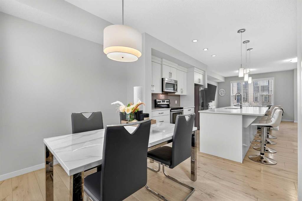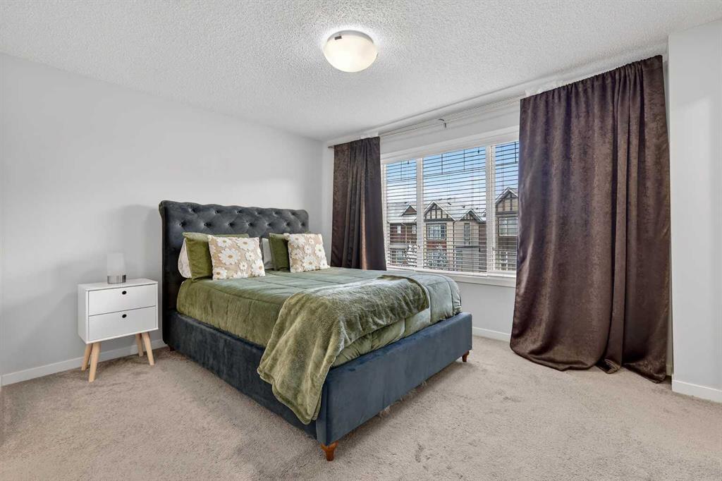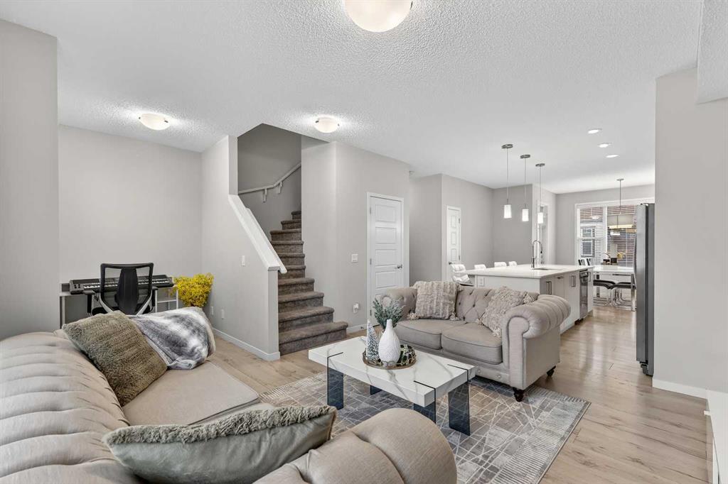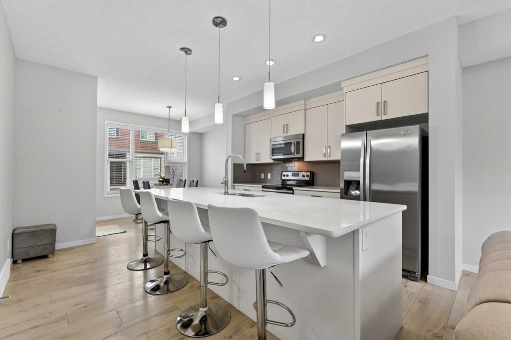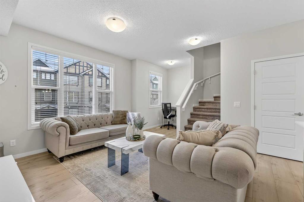 DOUBLE ATTACHED GARAGE with PARKING PAD, and green space. 1600 sq/ft TOWNHOME in the upscale community of New Brighton. The front patio area faces a sunny green space and walkway providing the perfect space for you to sit and relax. Upon entering you are greeted with a LARGE foyer with TONS of storage, a separate laundry room and access to your attached double garage with a full double driveway to allow for extra parking. Upstairs on the second level is a bright airy common space with lofty 9 FT CEILINGS. The spacious bright kitchen features white QUARTZ countertops, full upper cacbinets, a pantry and an OVERSIZED 10 FT ISLAND – perfect for entertaining! The dining area provides ample seating space. while the bright living room flows seamlessly onto the covered balcony with a gas line BBQ hookup. Adjacent to the living area, you’ll find a handy office nook. A 2-piece guest bath adds extra convenience. Third level is the Master Bedroom with WALK-IN closet and 3 pce ENSUITE bathroom. Two additional Bedrooms and another 4pce bathroom complete the upstairs. Don’t miss this opportunity to live in this beautiful area. This home has everything you or your young family needs. Close to Parks, Schools, South Trail Crossing Shopping, Transit, New Brighton Community Center and Athletic Park with Skating, Water Park, Tennis & more!