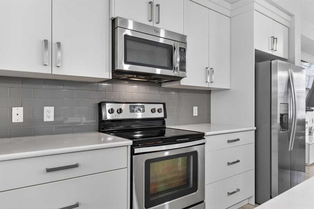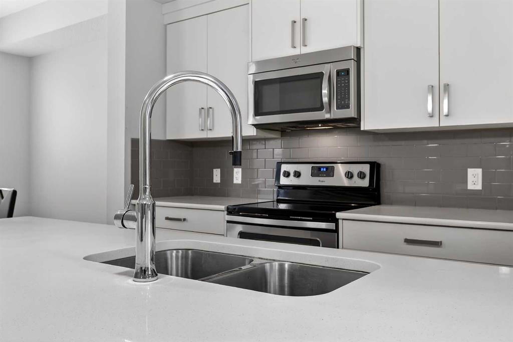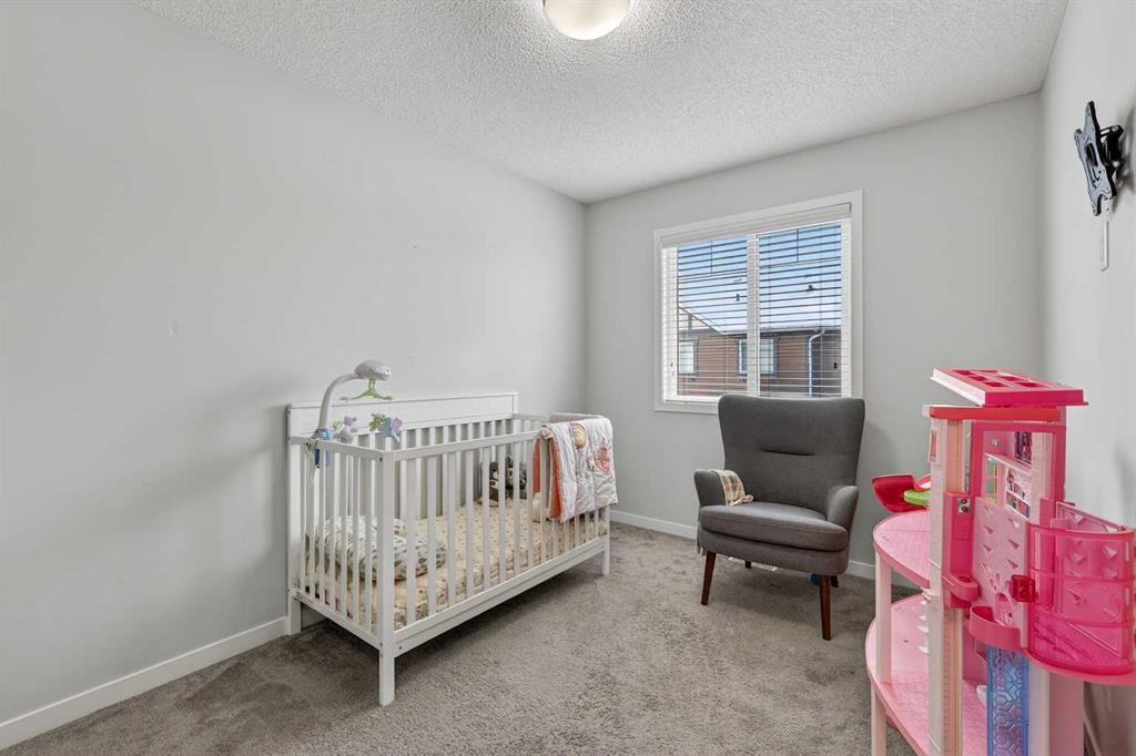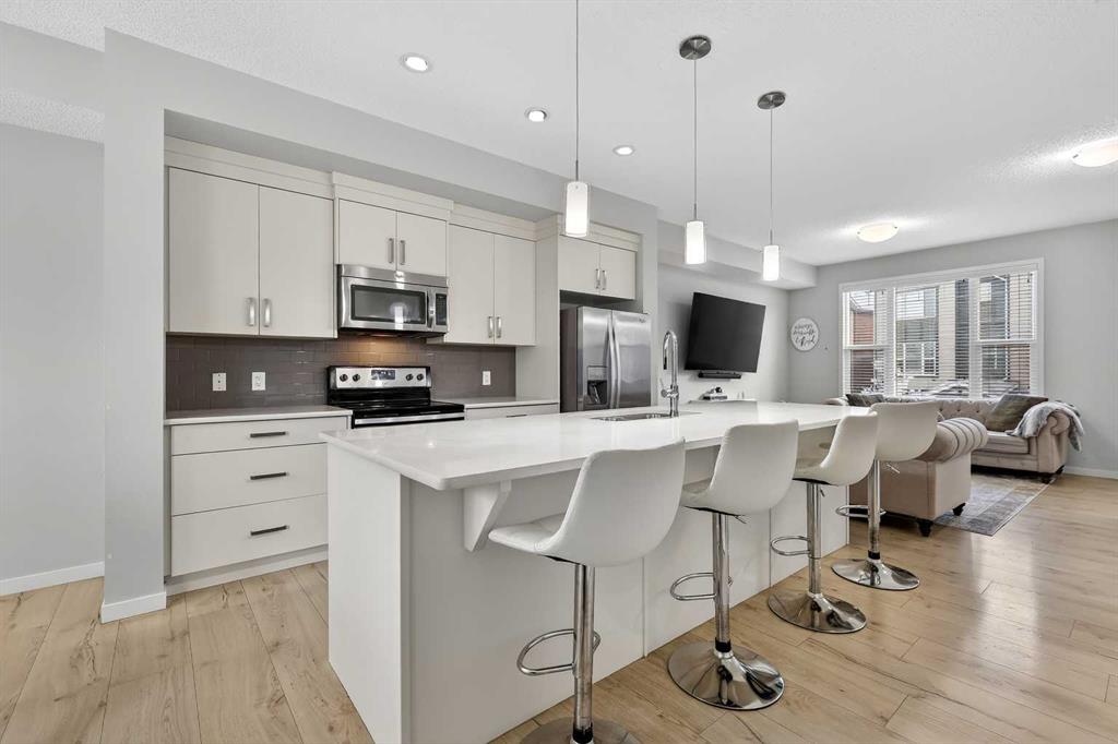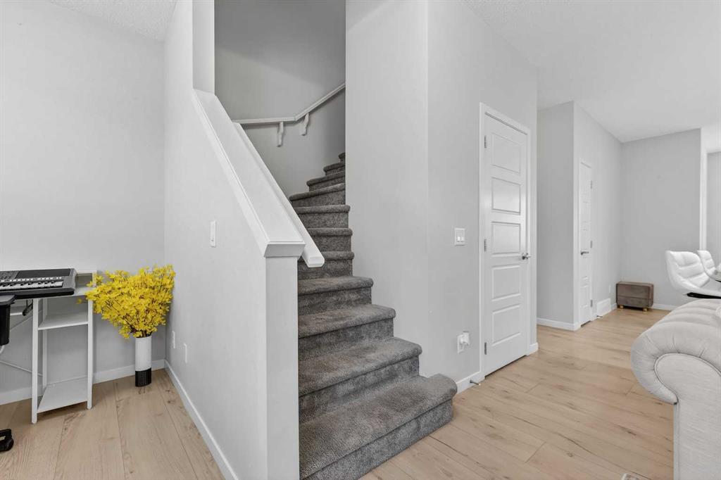 DOUBLE ATTACHED GARAGE with PARKING PAD, and green space. 1600 sq/ft TOWNHOME in the upscale community of New Brighton. The front patio area faces a sunny green space and walkway providing the perfect space for you to sit and relax. Upon entering you are greeted with a LARGE foyer with TONS of storage, a separate laundry room and access to your attached double garage with a full double driveway to allow for extra parking. Upstairs on the second level is a bright airy common space with lofty 9 FT CEILINGS. The spacious bright kitchen features white QUARTZ countertops, full upper cacbinets, a pantry and an OVERSIZED 10 FT ISLAND – perfect for entertaining! The dining area provides ample seating space. while the bright living room flows seamlessly onto the covered balcony with a gas line BBQ hookup. Adjacent to the living area, you’ll find a handy office nook. A 2-piece guest bath adds extra convenience. Third level is the Master Bedroom with WALK-IN closet and 3 pce ENSUITE bathroom. Two additional Bedrooms and another 4pce bathroom complete the upstairs. Don’t miss this opportunity to live in this beautiful area. This home has everything you or your young family needs. Close to Parks, Schools, South Trail Crossing Shopping, Transit, New Brighton Community Center and Athletic Park with Skating, Water Park, Tennis & more!