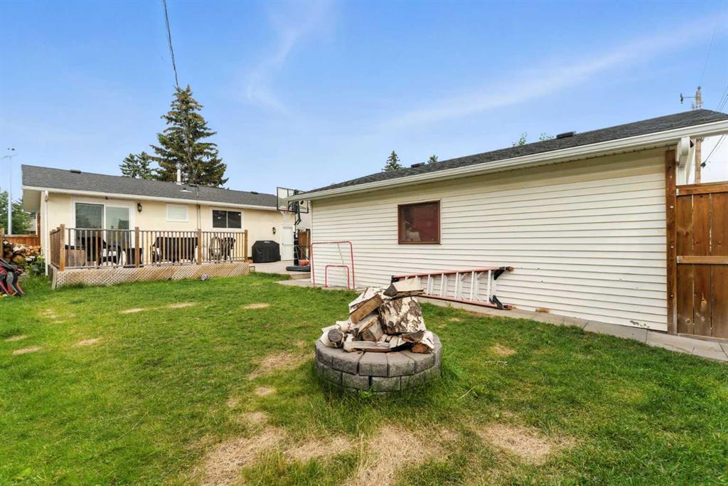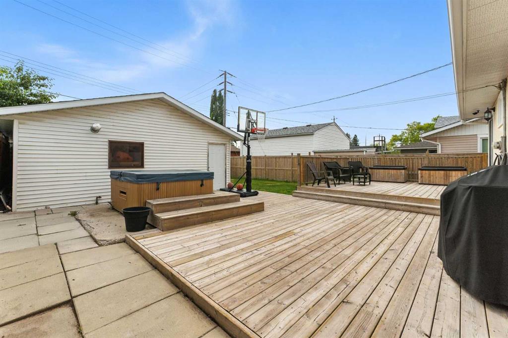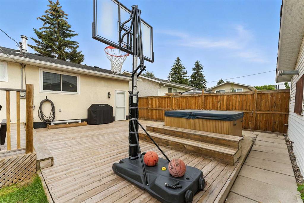 Enjoy outdoor living in your private backyard oasis, featuring a large deck, hot tub, and firepit area.