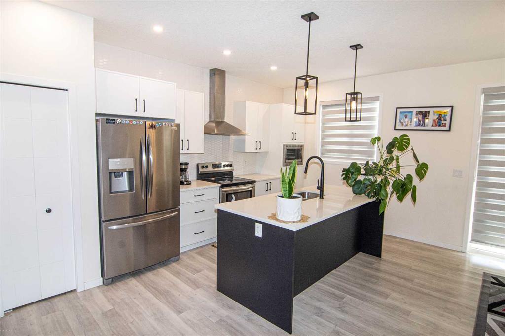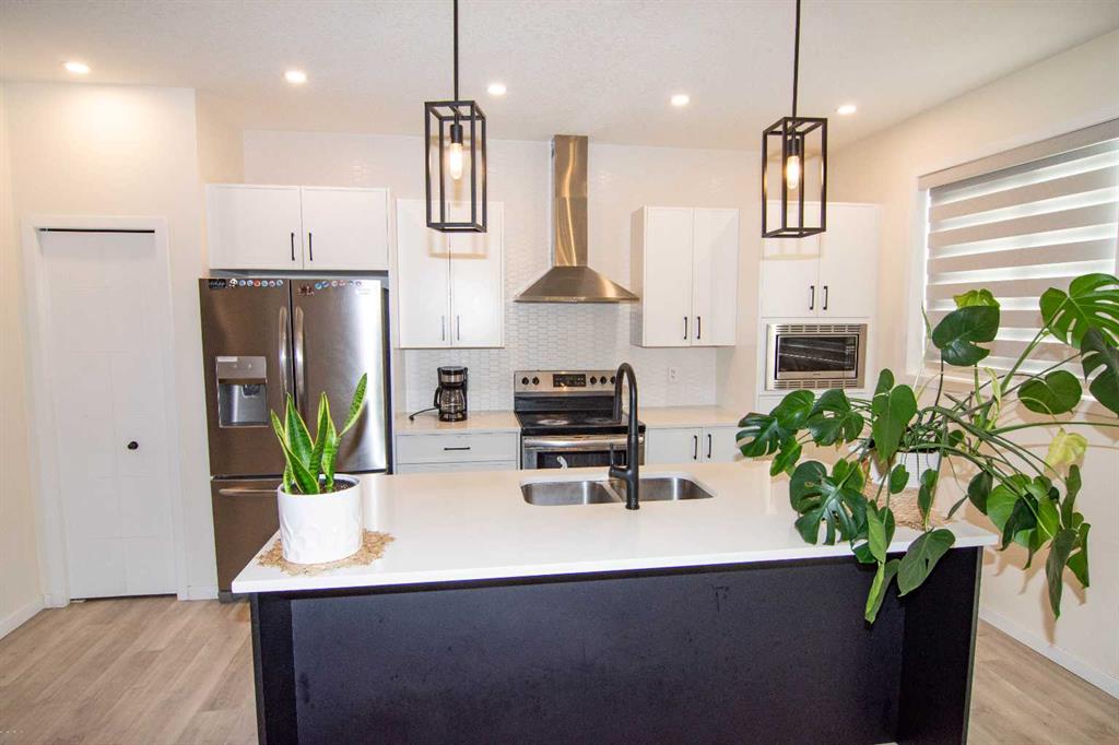 The main level showcases beautiful vinyl plank flooring throughout and an effortless flow between living spaces. At the heart of the home is a stunning white kitchen accented with striking black finishes. Designed with both form and function in mind, it features a generous centre island, sleek stainless steel appliances, quartz countertops, and a dramatic full-height tile backsplash. Ample cabinetry and counter space make this kitchen perfect for everyday living and hosting gatherings alike.