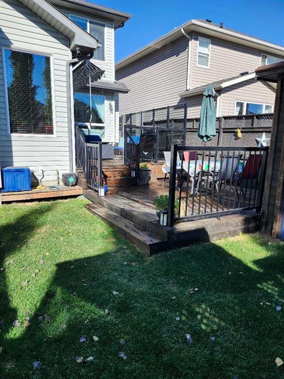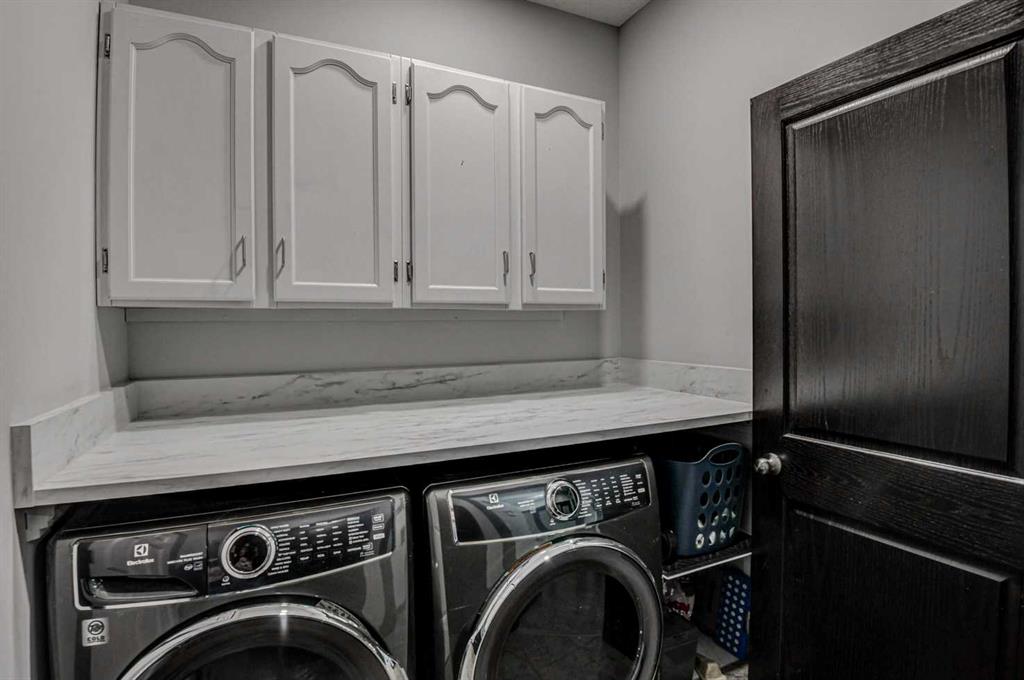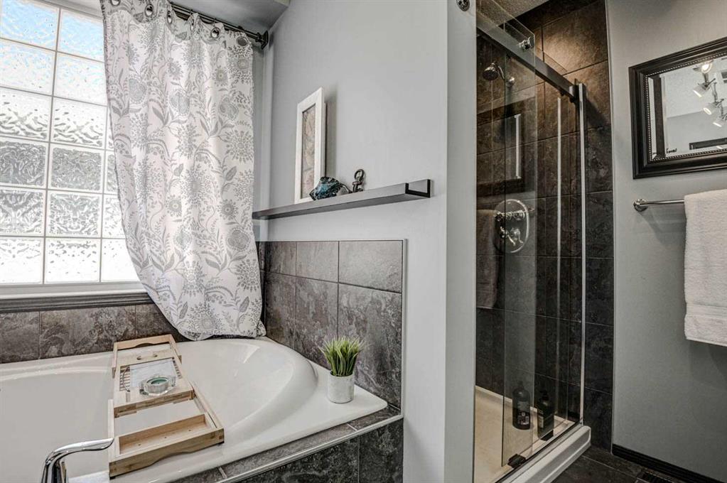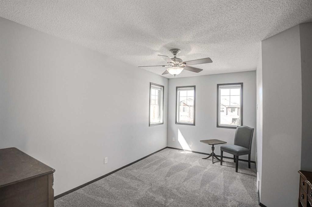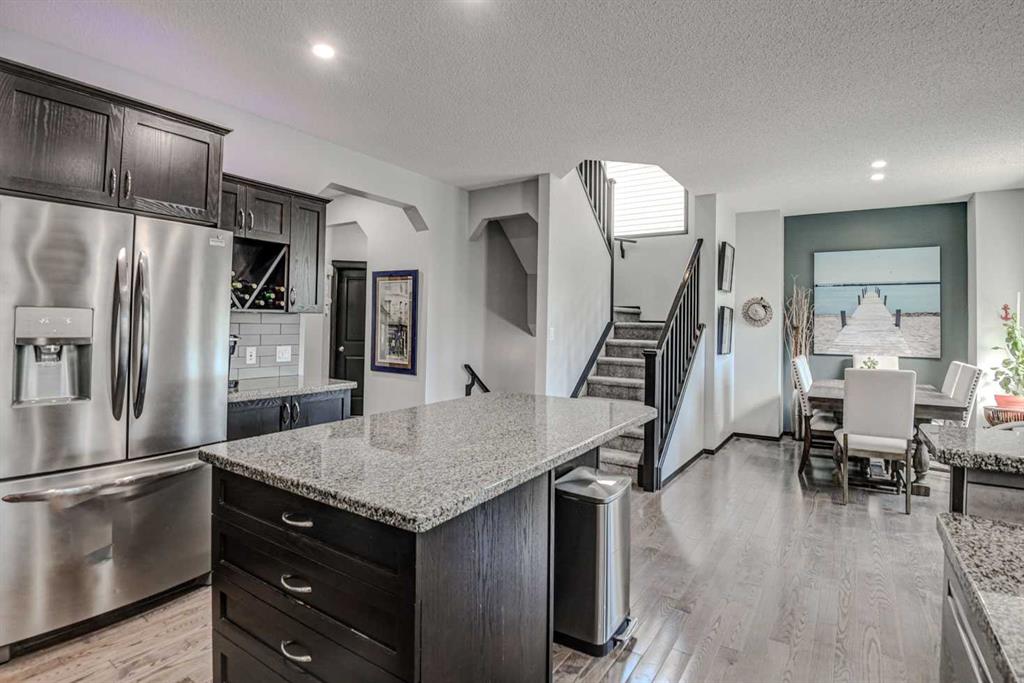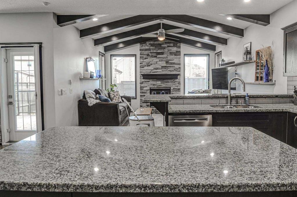Welcome to 23 Cranberry Circle S.E.—a beautifully appointed and fully developed 2-storey home offering over 3,000 sq. ft. of thoughtfully designed living space in the highly sought-after community of Cranston. This impressive 4-bedroom home is loaded with upgrades and perfectly suited for both everyday living and entertaining. The main floor features a bright, open-concept layout with 9-foot ceilings, rich 3/4″ ash hardwood flooring, and solid oak doors. A spacious front office overlooks the streetscape, while the inviting living room showcases vaulted ceilings with wood beams, a stunning floor-to-ceiling stone gas fireplace with log mantle, built-in shelving. The kitchen is sure to impress with quality granite countertops, extended-height oak cabinetry, abundant drawers, a centre island with storage, corner pantry, stainless steel appliances, and ambient cabinet lighting. The adjoining dining nook opens to a sunny south-facing rear deck—perfect for summer entertaining. Upstairs, you’ll find three generously sized bedrooms, including a luxurious primary retreat complete with vaulted ceiling, walk-in closet, built-ins, window bench seating, and a spa-inspired 4-piece ensuite featuring a large soaker tub, and a separate tiled shower. The two additional bedrooms each offer walk-in closets and share a convenient Jack-and-Jill bathroom with private sink areas. The fully developed basement continues to impress with 9-foot ceilings, a large recreation space anchored by a second stone gas fireplace, wet bar, flex room or 4th bedroom, and a stylish 3-piece bathroom with heated floors. Additional highlights include a heated, oversized double attached garage with an 8’ door and ceiling height suitable for car lifts, main floor laundry and mudroom, a newer high-efficiency furnace, central air conditioning and ample built-in storage throughout. Outside, enjoy a low-maintenance yard with extensive decking, a retractable awning, two storage sheds, and paved rear lane access with space for RV or trailer parking—or keep the existing sea-can for added storage. Hot and cold running water in both the back yard and garage! Ideally located within walking distance to Cranston’s many amenities including most levels of schooling, the community centre, Calgary South Health Campus and more, this home offers exceptional value in a family-friendly neighbourhood. A true turnkey property with space, style, and function—this one is a must-see!