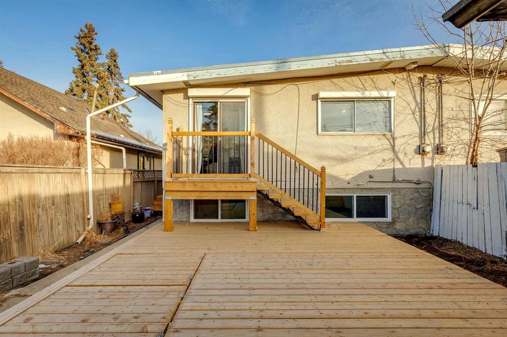 Welcome to this thoughtfully updated semi-detached bi-level home with a detached garage and convenient lane access (parking for 3), ideally located in the established community of Dover. The fully fenced front and backyard offer privacy and functionality, highlighted by a brand new, large rear deck with direct access to the home, perfect for entertaining or everyday living, along with a freshly painted front fence and raised front balcony that enhance curb appeal. The front covered raised deck is located directly off the dining room, creating an inviting outdoor extension ideal for year-round enjoyment. Inside, the home has been refreshed with fresh interior paint, a newly updated knock-down ceiling, a new front door, and new interior doors. The upper level features new flooring installed within the last five years, hardwood floors in both upstairs bedrooms, and one bedroom with direct access to the backyard, a rare and versatile feature. The full upper bathroom includes a tub/shower combo, new paint, and a new light fixture. The kitchen is well-appointed with stainless steel appliances, including a stainless steel appliances, all approximately five years old, plus shutters on the kitchen window for added function. The fully developed basement offers excellent flexibility with 2 additional bedrooms and a spacious recreation room that could also be used as a bedroom, complete with a large walk-in closet, along with a large laundry room and a full basement bathroom with a tub/shower combo. Major exterior upgrades include new roof shingles on the home in 2024 and on the garage in 2025, as well as an upgraded overhead garage door. Parking is abundant with space for 2 vehicles out back off the alley beside the garage, plus the garage itself, offering parking for 3 vehicles total. Situated in Dover, this home is close to numerous parks and greenspaces, playgrounds, schools, shopping, and everyday amenities, with convenient access to major roadways and downtown Calgary, making it a move-in-ready property that combines extensive updates, functional living space, and a strong sense of community.