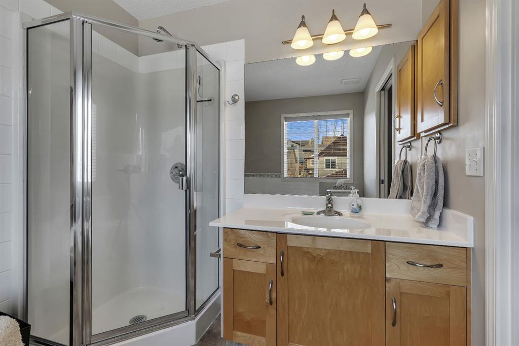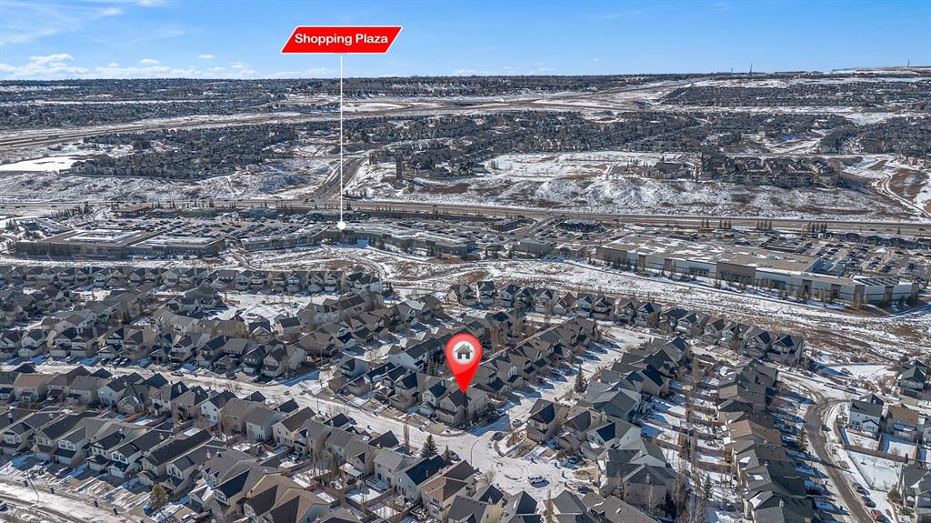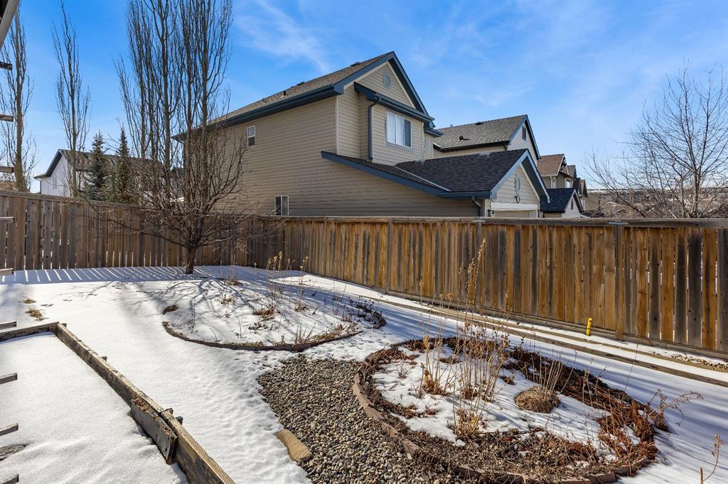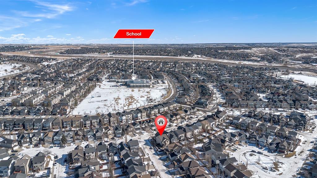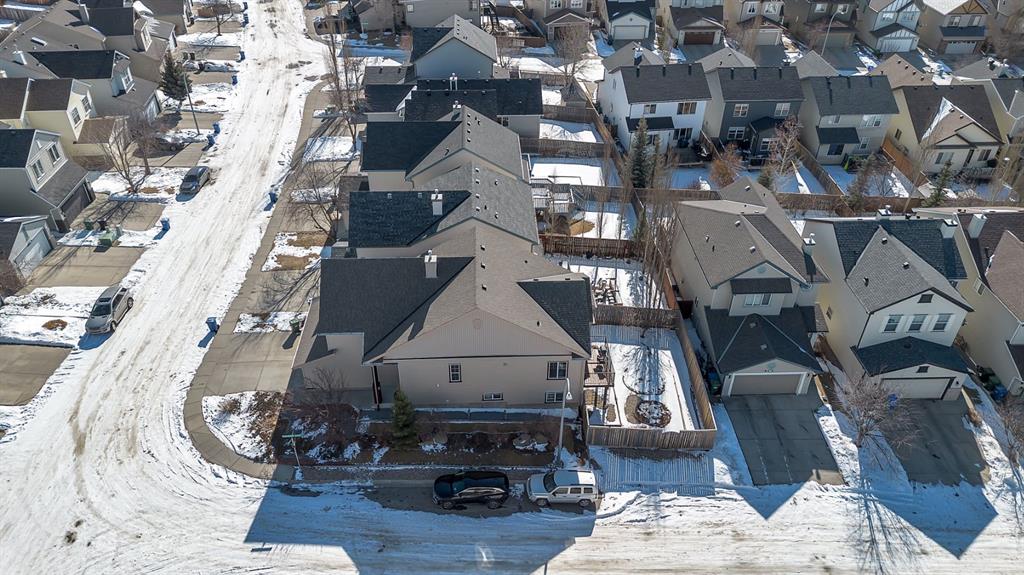 Prime location in Evanston! Situated on a desirable corner lot, this architecturally unique bi-level offers breathtaking, unobstructed views and a spectacular raised loft-style primary retreat. Move-in ready and exceptionally well cared for, this home reflects true pride of ownership throughout. The thoughtfully designed open-concept layout is enhanced by soaring vaulted ceilings and an abundance of natural light that fills the home with warmth. A spacious front entry welcomes you inside, leading to a generous wraparound kitchen complete with extensive cabinetry, a central island, granite countertops, stainless steel appliances, and a convenient corner pantry. The dining area offers plenty of space for gatherings and overlooks the backyard, with direct access to the sunny BBQ deck, complete with a gas connection. The inviting living room showcases a beautiful stone gas fireplace with a maple wraparound mantle. A versatile flex room on the main level can serve as a formal dining area, home office, or be converted into an additional bedroom. This level also features a second bedroom, a full 4-piece bathroom, main-floor laundry, and direct access to the double attached garage. Upstairs, retreat to your private and spacious primary suite, complete with a walk-in closet and a full 4-piece ensuite featuring a corner soaker tub and separate glass shower.
