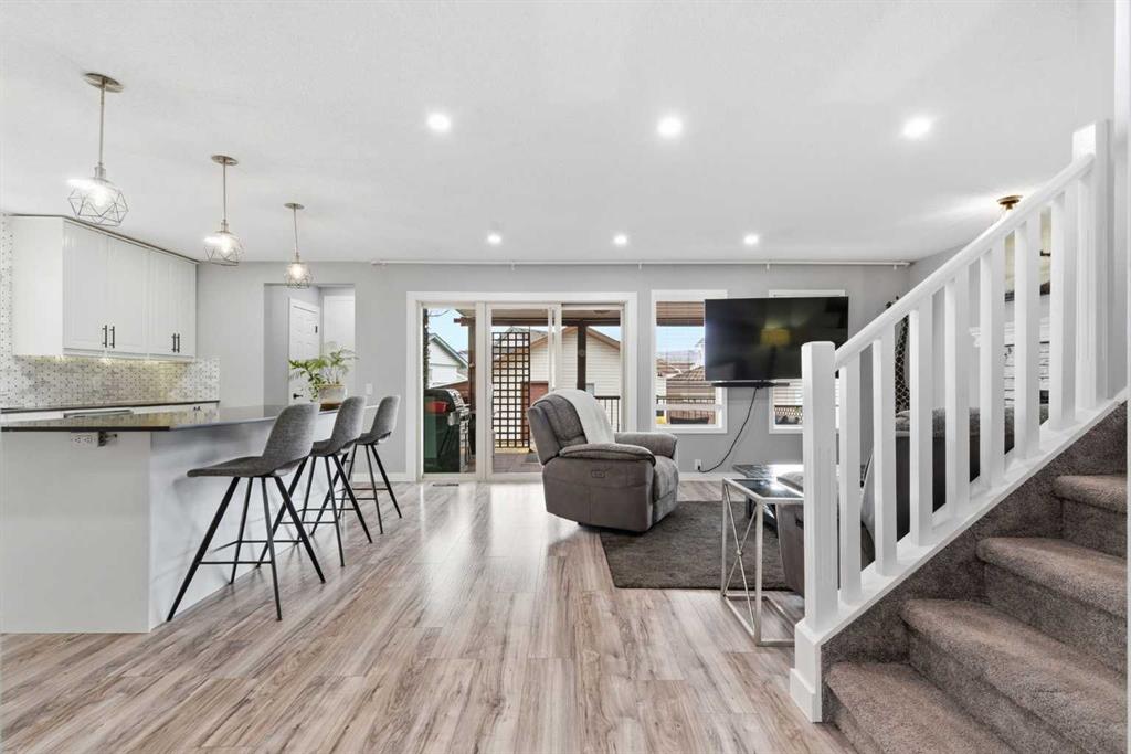 The main floor offers a bright and open-concept layout, featuring an updated kitchen with modern finishes, white cabinetry, and ample workspace. The spacious living room is filled with natural light from large windows and anchored by a cozy gas fireplace. You’ll also find a private front office, a separate dining area, and a convenient 2-piece bathroom on the main level. Laminate flooring throughout the main floor, along with updated railings, adds a fresh and modern feel.