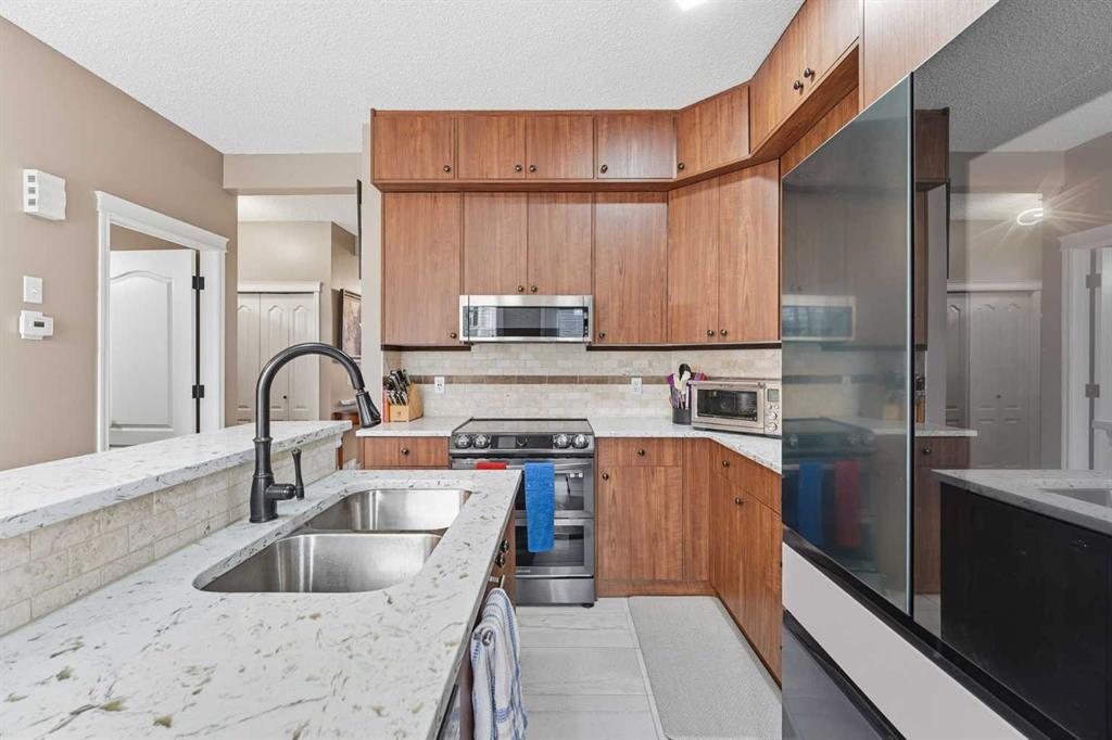 This beautifully updated end-unit townhouse is a must-see, featuring 3 bedrooms, 3.5 bathrooms, a fully finished basement, a sunny southwest backyard, and a private single-car garage. Recently renovated throughout, this home features a brand-new kitchen with stainless steel appliances, Stone countertops, new lighting, stunning porcelain tile flooring, and plush new carpet for a fresh, modern feel from top to bottom. Step inside to an abundance of natural light pouring through large windows, creating a warm, inviting atmosphere. The spacious living room is perfect for relaxing or hosting guests, complete with a cozy fireplace as the focal point. The newly renovated kitchen offers ample cabinetry, a functional island with seating, awesome Samsung appliances and a bright breakfast nook. Upstairs, the primary suite is your private retreat with a generous sitting area, a full ensuite, and a large closet. An additional upper-level bedroom also features its own ensuite bathroom, along with a conveniently located laundry room. The lower level offers fantastic flexibility with a spacious rec/flex room perfect for a gym, play area, or secondary living space, plus a third bedroom, a full bathroom, and plenty of storage. Outside, enjoy a fully fenced yard and a deck updated in 2022, and astro turf really makes the yard pop. A convenient gas line for your BBQ, plus low-maintenance living thanks to condo-managed grounds. The single heated garage will keep your car warm all winter. Nestled in desirable McKenzie Towne, you’re steps from a green space and playground, and just a short stroll to vibrant McKenzie Towne Centre, home to shops, restaurants, grocery, fitness, and transit options, including Park & Ride with express service downtown. Easy access to Deerfoot Trail, Stoney Trail, and nearby amenities ensures ultimate convenience. This one is move-in-ready and truly turnkey. Book your private showing today!