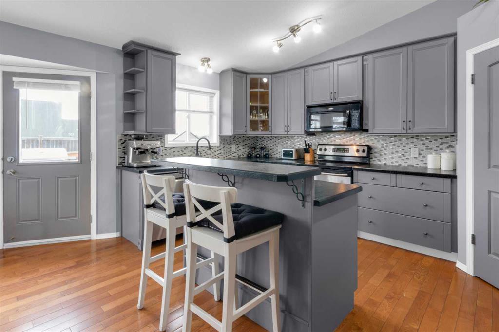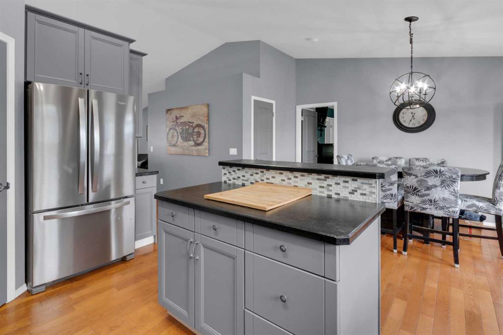 HOME SWEET HOME! This is your AMAZING opportunity to enjoy the perks of small town living in a wonderfully maintained, move-in ready bungalow in the heart of charming Strathmore backing on to a school/green space! This stunning home offers 3 bedrooms, 2.5 bathrooms, 2,183+ fully developed SQFT throughout and a double attached garage. The inviting curb appeal and front porch leads in you inside where you will find your gleaming hardwood flooring, vaulted ceilings and an abundance of windows flooding the home in natural sunlight. The main floor offers a spacious and large living room perfectly complimented by a cozy gas fireplace, a foyer, formal dining area, a wonderful 4 piece bathroom, convenient laundry room and the gourmet chef’s kitchen complete with custom cabinetry, center island with built-in storage, corner pantry, stainless steel appliances and a garden door that leads you to the rear deck. Completing this floor is a great-sized bedroom and the magnificent primary retreat with a large walk-in closet and an elegant 4 piece ensuite bathroom. The fully finished basement features a huge recreation room/living room perfect for a growing family, a 3rd bedroom, a 2 piece vanity bathroom (roughed in for a shower) and the all the storage space you could require. The hot water tank is newer and 60 gallon. Outside, there is the double attached garage with 2 additional driveway parking spots and the fully fenced, low-maintenance backyard providing you with your own private oasis with a pergola, large deck and shed. Located close to all major amenities including steps from a school, playground and park, shopping, walking paths, Strathmore Lake and a quick 30 minute drive to Calgary. This is the opportunity you have been looking for, book your private viewing today of this GEM!