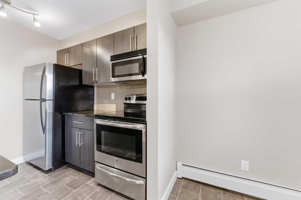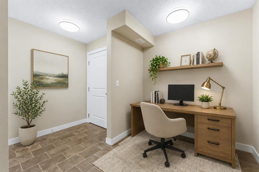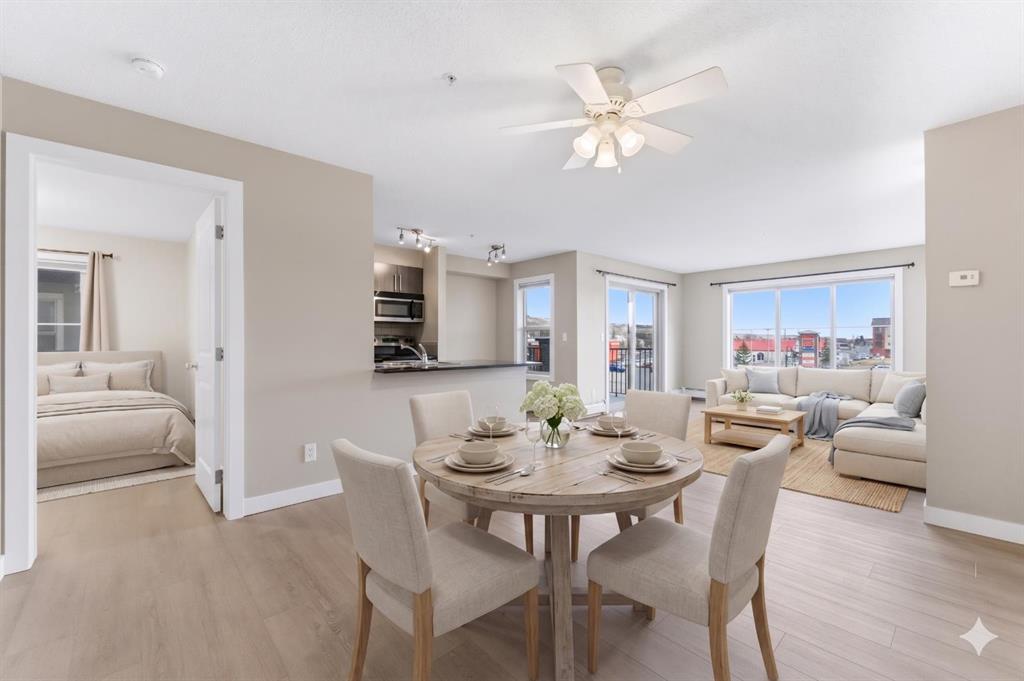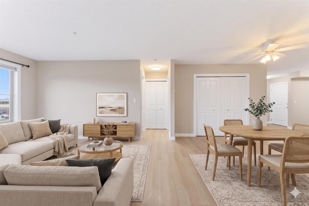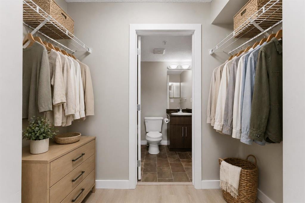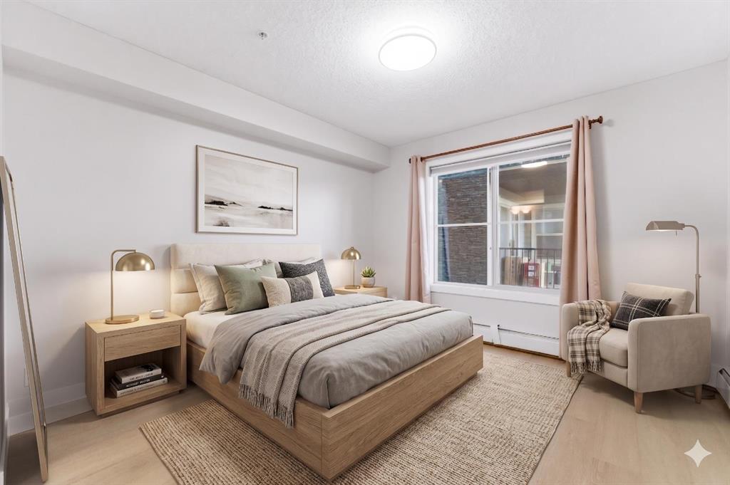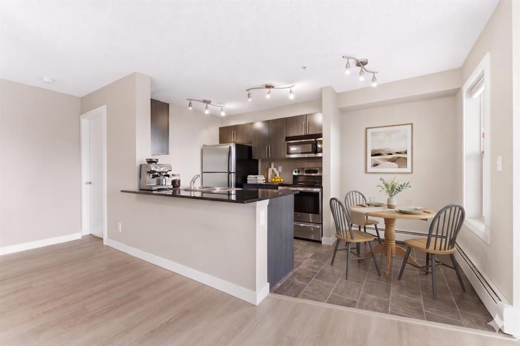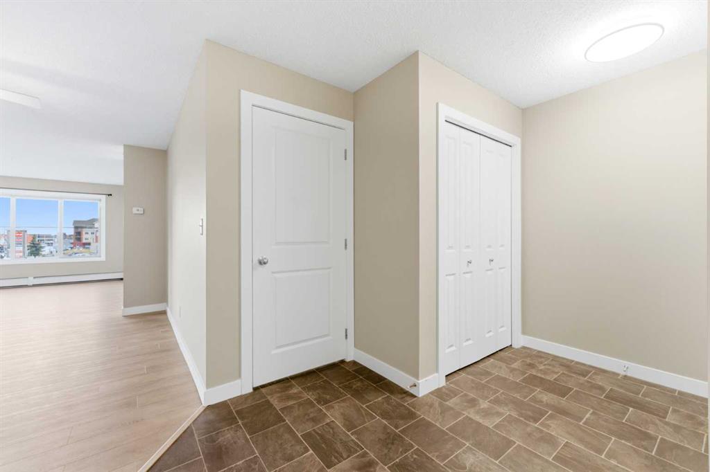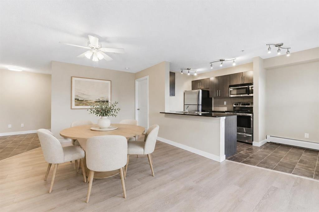 Welcome to Glenmore Landing! Experience the best of both worlds in this stunning third-floor corner unit with 2 beds, 2 baths + open office, nestled in the heart of Cochrane. This meticulously maintained residence offers an unparalleled lifestyle for those who crave the vibrant energy of a downtown core while cherishing the serene beauty and proximity of the Canadian Rockies. Positioned at the quiet end of the hallway for maximum privacy and minimal foot traffic, this end unit benefits from additional natural light, enhanced airflow, and a more spacious balcony—perfect for enjoying fresh mountain air. The suite is ideally situated for effortless living with both elevator access and a convenient stairwell nearby. Step outside your door and find yourself within two to three blocks of Cochrane’s historic Main Street, where you can soak in the atmosphere at a local western saloon, hit the fitness club, or run daily errands at grocery stores, pharmacies, restaurants, and banks. For the outdoor enthusiast, the location is a dream; one block west, meandering walking paths lead toward the river, while the complex itself backs onto the local rodeo grounds and park land, hosting spirited community events throughout the year. When the mountains call, a scenic 40-minute drive delivers you to the world-class peaks of Canmore, with Ghost Lake only 20 minutes away for boating and camping. Upon entering the suite, you are greeted by a functional foyer featuring a large closet and an expansive storage room with full-sized washer/dryer. To your left, a generous open area provides the perfect footprint for a dedicated home office, leaving the two bedrooms—strategically located on opposite sides of the suite for maximum privacy—entirely for rest. The heart of the home is a bright living and dining area featuring brand-new flooring that flows through the bedrooms, perfectly complementing the faux slate tile in the entrance, kitchen, and bathrooms. As a desirable Building 2000 unit, this suite boasts 33% larger windows than most other units, flooding the space with natural light. The kitchen is a chef’s delight with granite countertops and upgraded stainless steel appliances, while the primary ensuite offers a walk-through closet and a soaker tub. Both bathrooms feature granite counters and upgraded tiling to the ceiling. Modern touches include new 2-stage LED lighting with adjustable tones, and the large, covered corner balcony is thoughtfully positioned to provide protection from westerly mountain breezes—perfect for a BBQ or relaxing outdoors. Complete with a titled underground parking stall and bicycle storage in the parkade, this condo is a rare find for downsizers or professionals seeking a small-town pace with urban convenience.