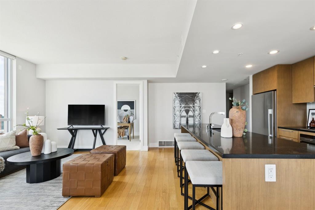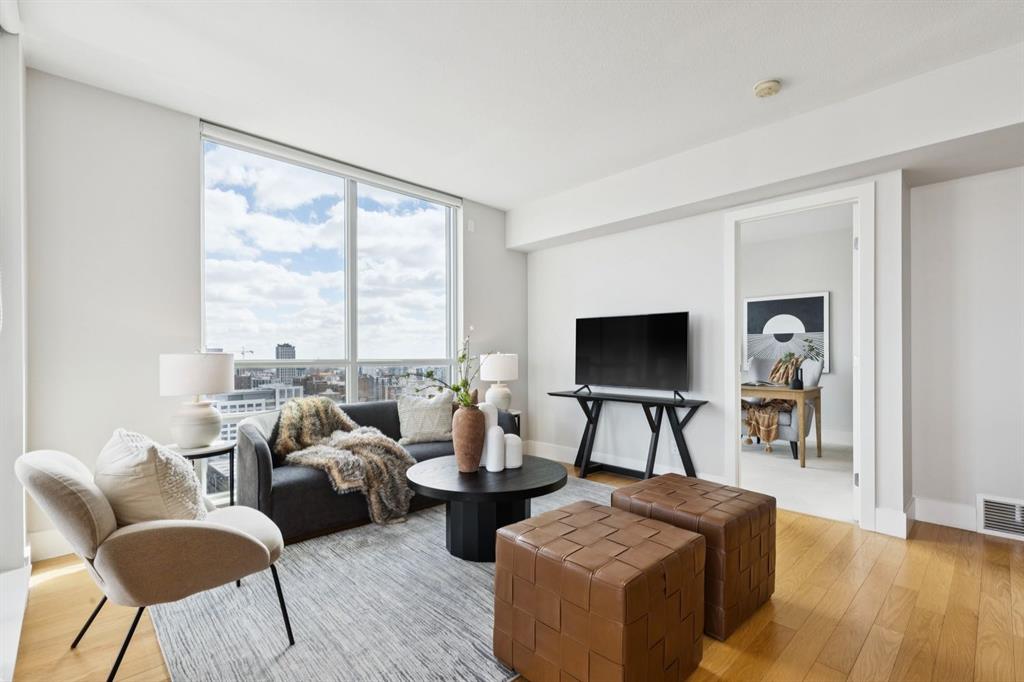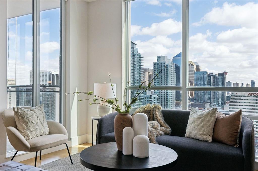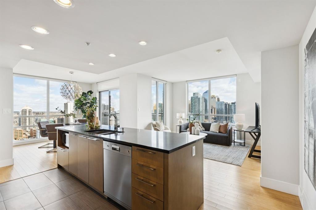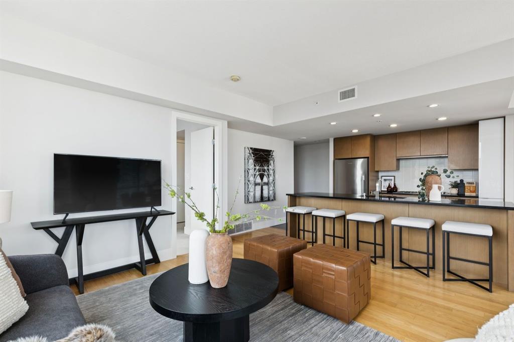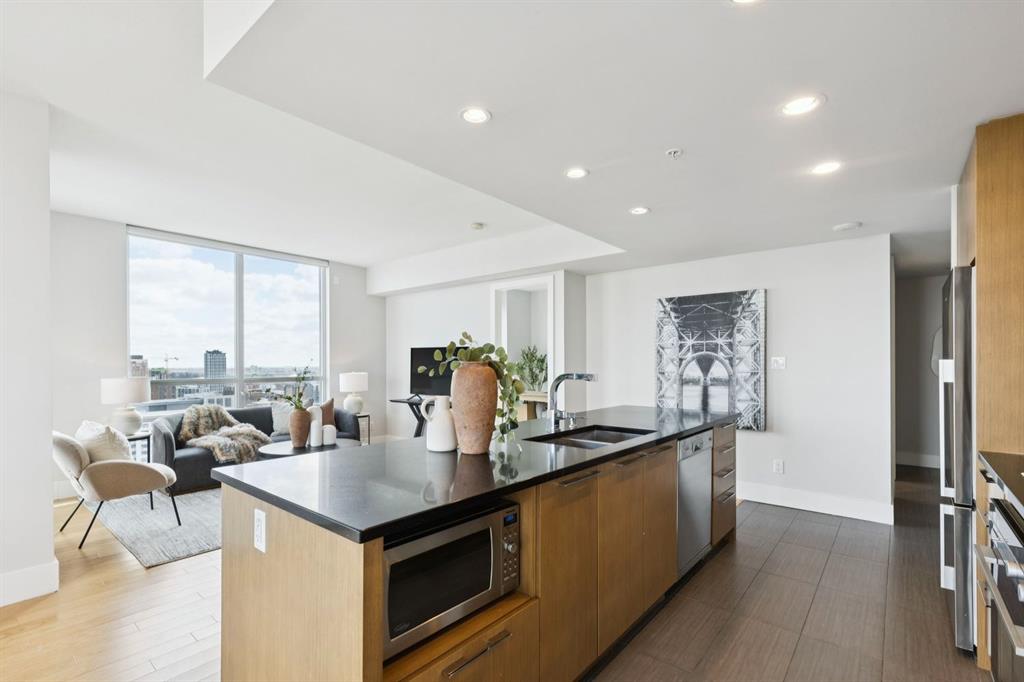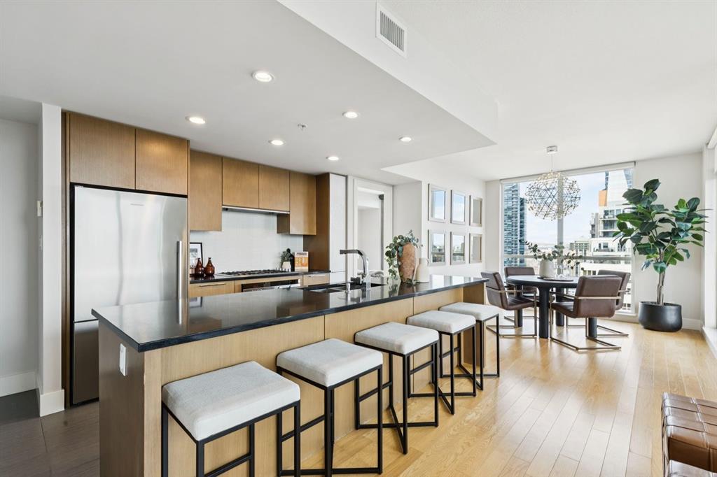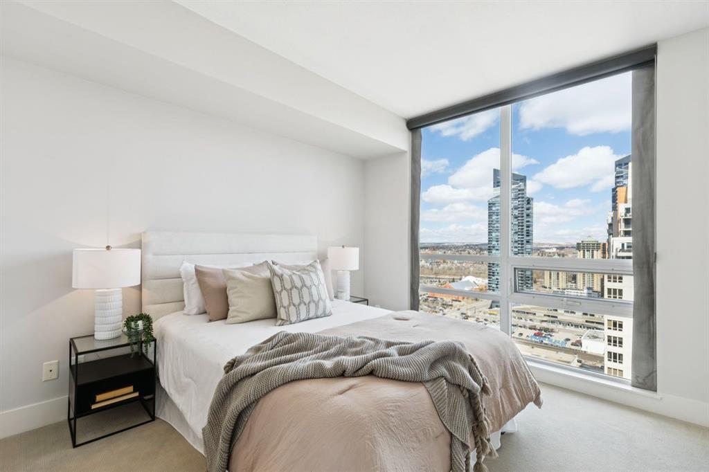 Experience elevated urban living in this stylish LUNA residence, where panoramic views stretch from the dazzling downtown skyline across North Hill, the Bow River valley, C.O.P., and out to the Rocky Mountains. Designed with one of the most sought after layouts, this bright and modern 2 bed/2 bath suite places the bedrooms on opposite sides for optimal privacy, with an open concept kitchen, living, and dining area at its heart. Flooded with natural light from floor-to-ceiling windows, the home exudes warmth while maintaining a sleek, contemporary aesthetic. The well equipped kitchen showcases warm wood cabinetry, black quartz counters, a glass backsplash, and premium stainless steel appliances including Fisher & Paykel refrigerator, gas cooktop, and oven, and a Blomberg dishwasher. A spacious island with seating flows seamlessly into the dining area, which opens onto a glass-railed balcony that’s perfect for soaking in breathtaking panoramic views. The primary retreat offers a custom walk-through closet leading to a luxurious 5pc ensuite featuring in-floor heating, a deep soaker tub, and a separate shower. The second bedroom is equally well appointed with dual closets and convenient access to a 3pc cheater ensuite. Thoughtful touches like custom blackout blinds, air conditioning, in-suite laundry, and additional in-suite storage ensure everyday comfort and convenience. Residents of LUNA enjoy an exceptional array of amenities including a fully equipped gym, yoga studio, steam spa, party room, guest suites, concierge service, visitor parking, and a serene outdoor zen garden with fireplace. Located in the heart of the vibrant Beltline, you’re just steps from shopping, dining, the Bow River pathways, and everyday essentials. Complete with a storage locker (Level 3 #316) and underground parking (P1 #L28) this home offers the perfect blend of luxury, functionality, and unbeatable inner-city lifestyle.