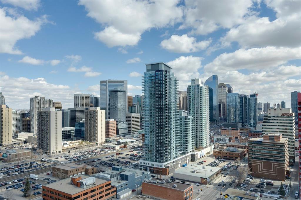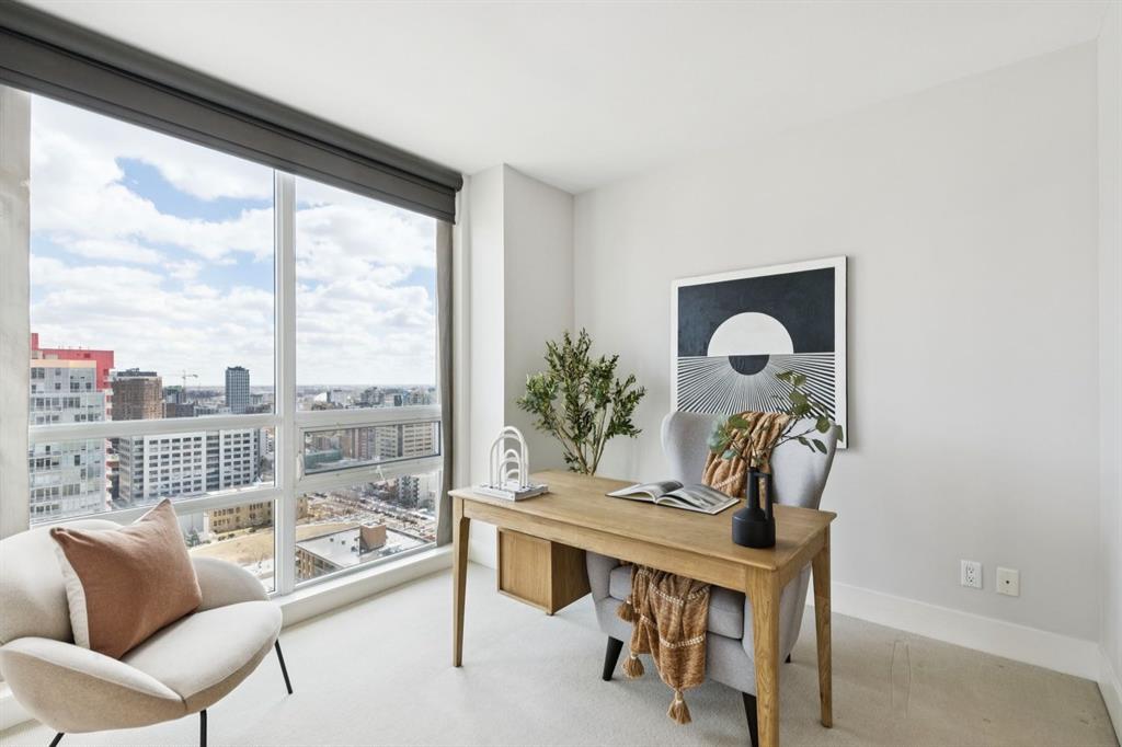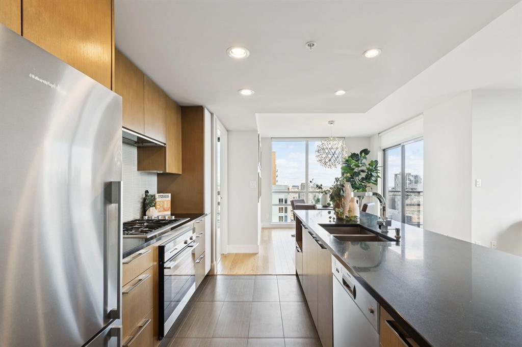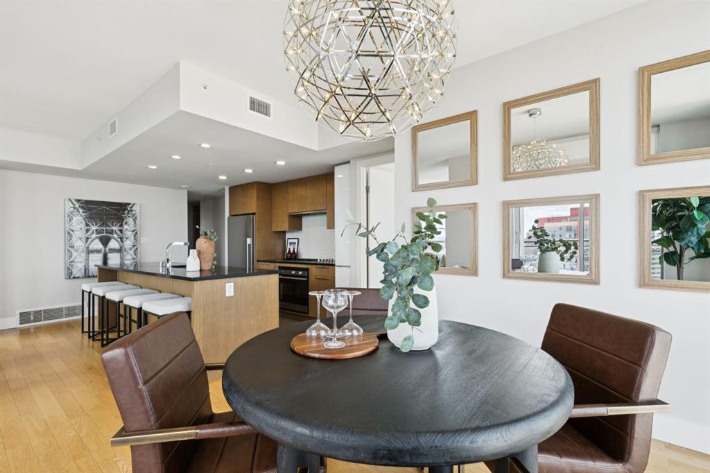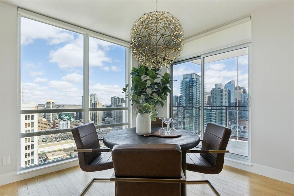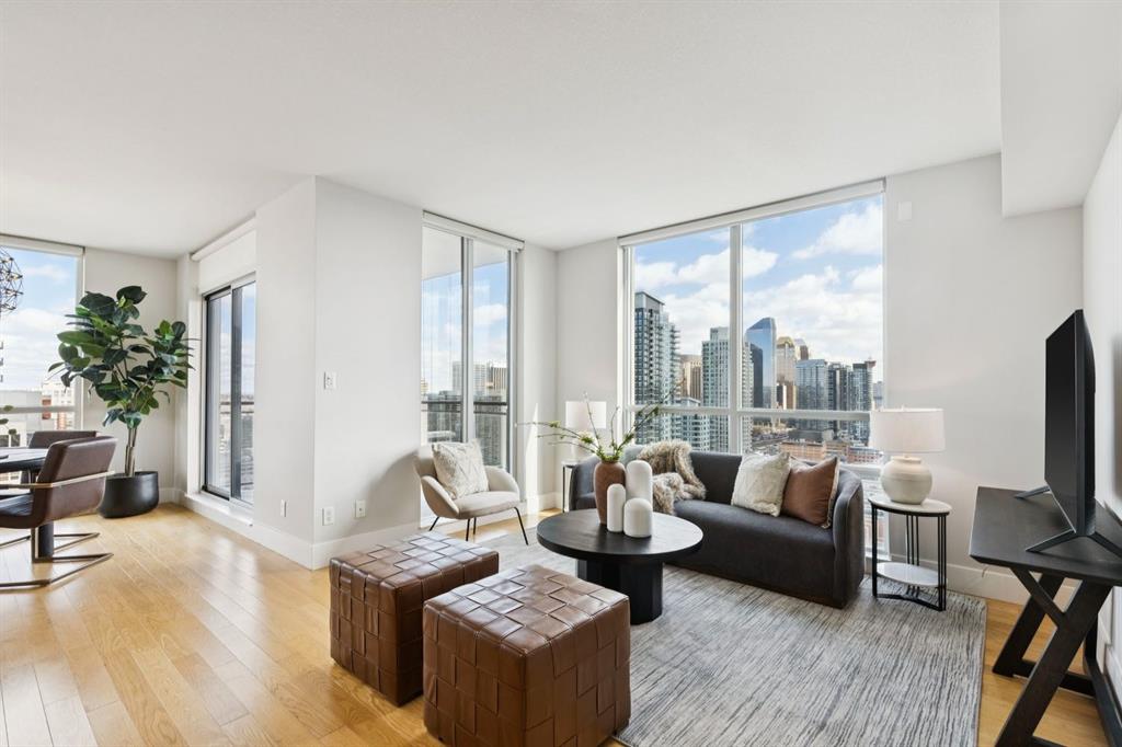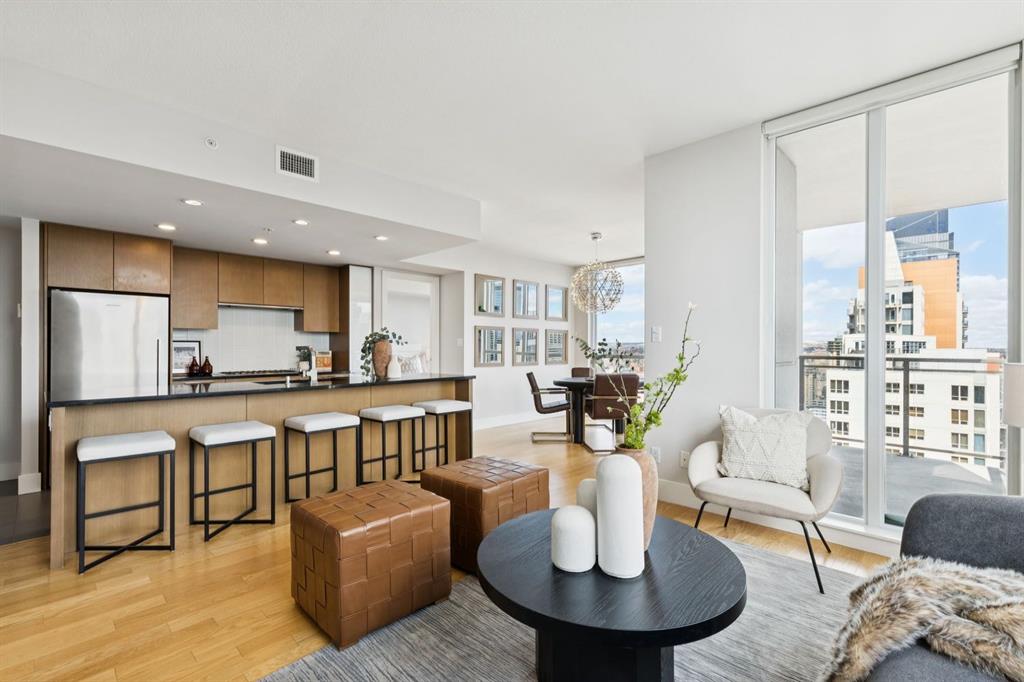 Experience elevated urban living in this stylish LUNA residence, where panoramic views stretch from the dazzling downtown skyline across North Hill, the Bow River valley, C.O.P., and out to the Rocky Mountains. Designed with one of the most sought after layouts, this bright and modern 2 bed/2 bath suite places the bedrooms on opposite sides for optimal privacy, with an open concept kitchen, living, and dining area at its heart. Flooded with natural light from floor-to-ceiling windows, the home exudes warmth while maintaining a sleek, contemporary aesthetic. The well equipped kitchen showcases warm wood cabinetry, black quartz counters, a glass backsplash, and premium stainless steel appliances including Fisher & Paykel refrigerator, gas cooktop, and oven, and a Blomberg dishwasher. A spacious island with seating flows seamlessly into the dining area, which opens onto a glass-railed balcony that’s perfect for soaking in breathtaking panoramic views. The primary retreat offers a custom walk-through closet leading to a luxurious 5pc ensuite featuring in-floor heating, a deep soaker tub, and a separate shower. The second bedroom is equally well appointed with dual closets and convenient access to a 3pc cheater ensuite. Thoughtful touches like custom blackout blinds, air conditioning, in-suite laundry, and additional in-suite storage ensure everyday comfort and convenience. Residents of LUNA enjoy an exceptional array of amenities including a fully equipped gym, yoga studio, steam spa, party room, guest suites, concierge service, visitor parking, and a serene outdoor zen garden with fireplace. Located in the heart of the vibrant Beltline, you’re just steps from shopping, dining, the Bow River pathways, and everyday essentials. Complete with a storage locker (Level 3 #316) and underground parking (P1 #L28) this home offers the perfect blend of luxury, functionality, and unbeatable inner-city lifestyle.