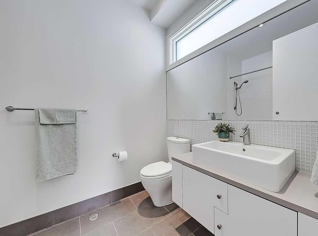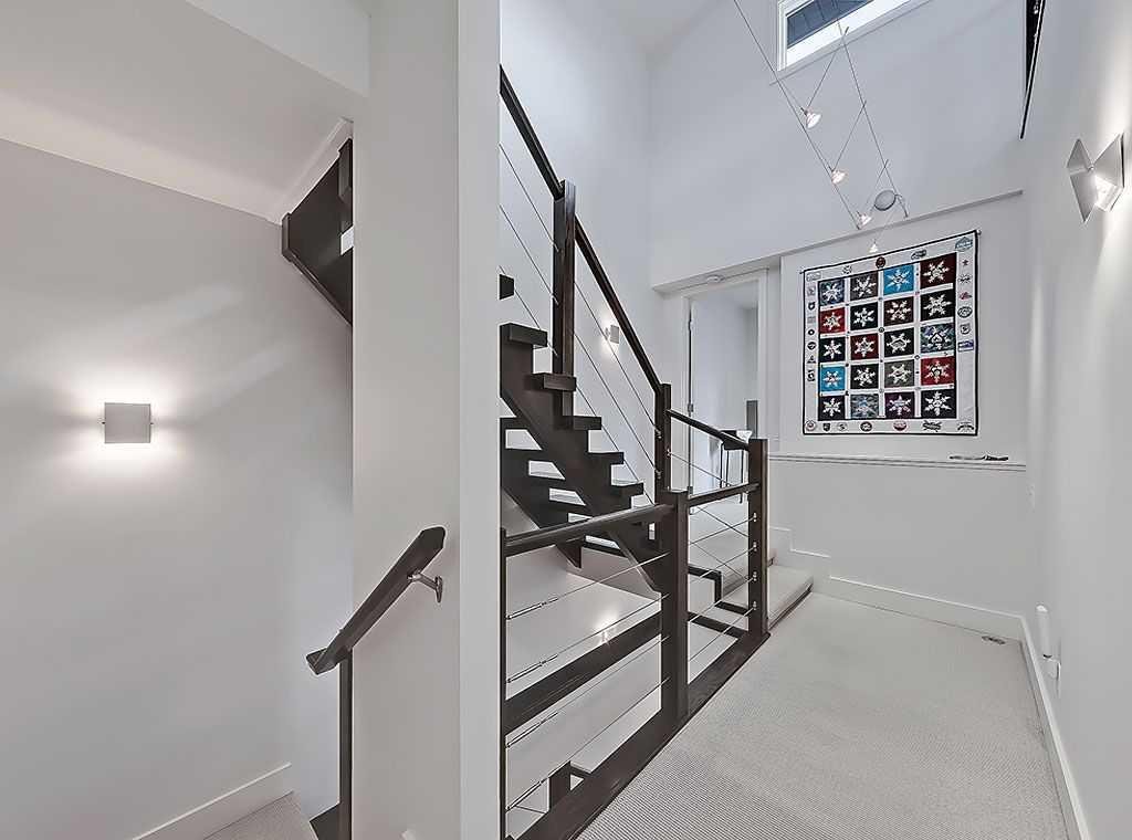 The MAIN LEVEL’s layout balances open-plan flow with rooms defined by level changes and feature elements that create cozy, inviting spaces.  This intimate design is complimented by 9-foot flat ceilings, rich Tigerwood floors, large windows, and an open staircase featuring skylight that floods the home with natural light.  The heart of the home is an entertainer’s dream – a sleek kitchen with custom cabinetry, a massive 8’ quartz island, full wall pantry, and top-tier Sub-Zero and AEG stainless appliances. Opposite the island is a built in desk, offering lots of area for guests to “hang out”, or as a work surface. The spacious great room features a two-sided gas fireplace and built-in media wall and seamlessly connects to the tiled mudroom and the Zen-like backyard retreat.