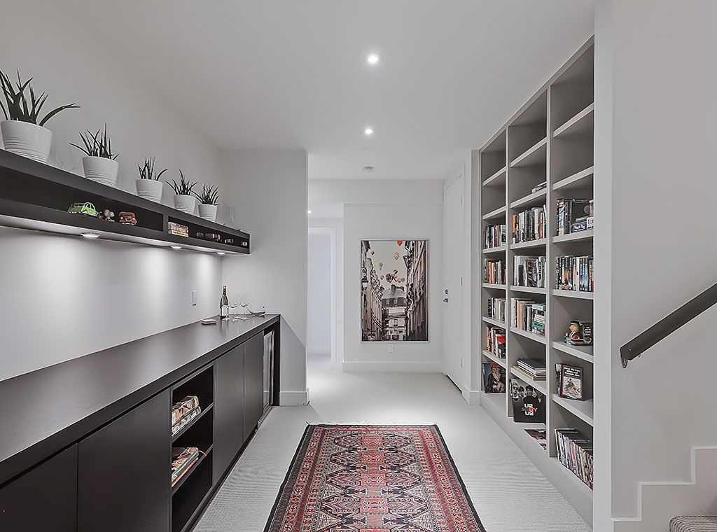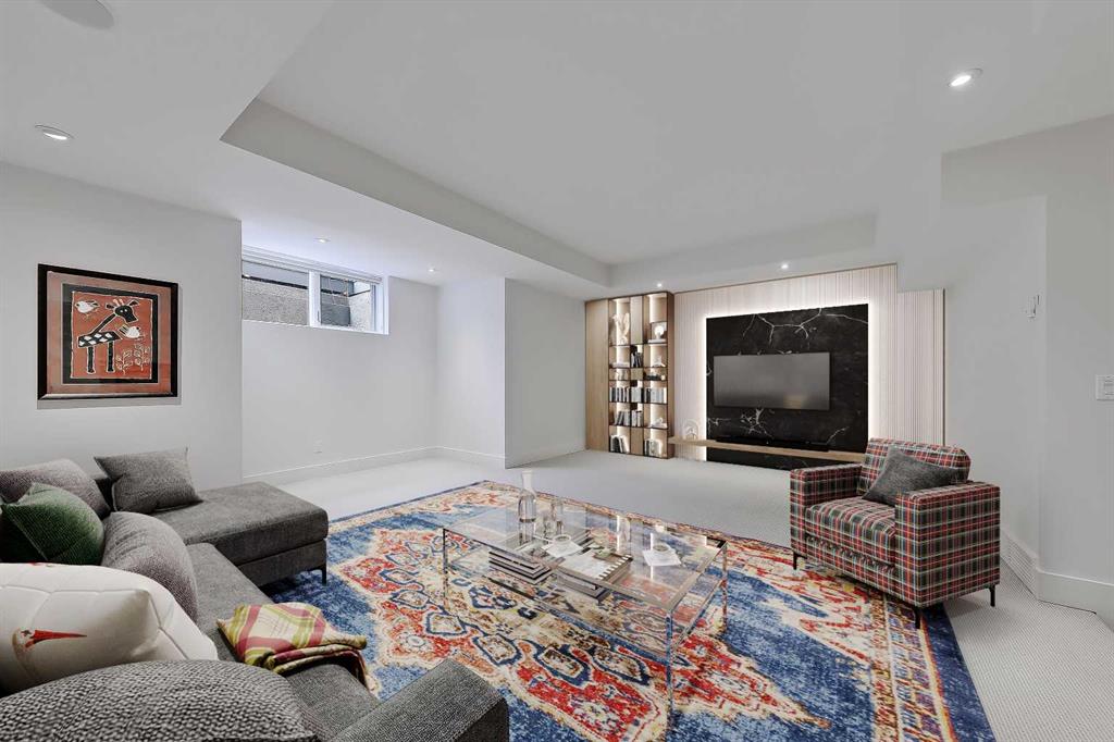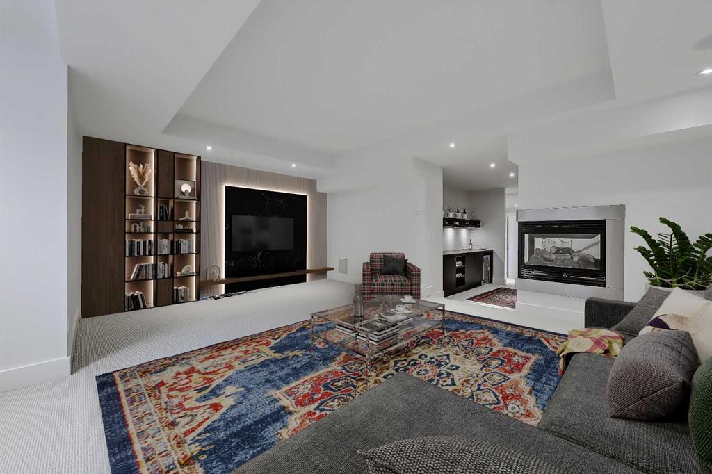 The fully finished BASEMENT has 9’ ceilings and a large media/rec room with 5.1 surround sound/built-in speakers, a full bar area, ( mechanical room behind offers possibility for bar sink), guest bedroom, and 3 piece. bath with zoned in-floor heating throughout. House interior was  repainted end of 2024, and new roof 2020. Double high velocity furnaces, provide more efficient heat/air distribution, and soft “flex”  ducting reduces noise and dust.