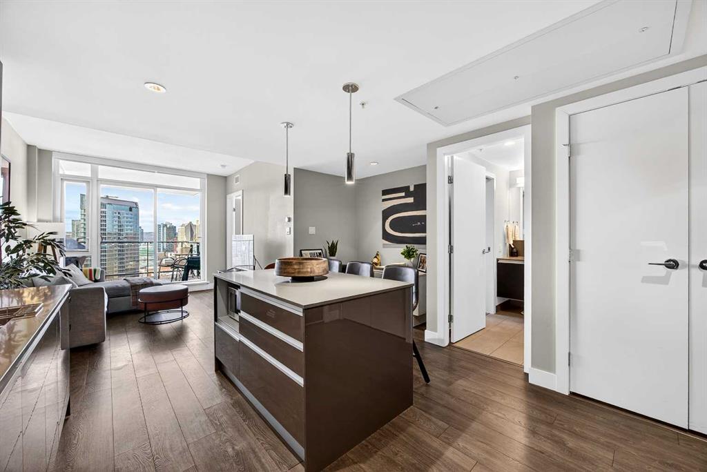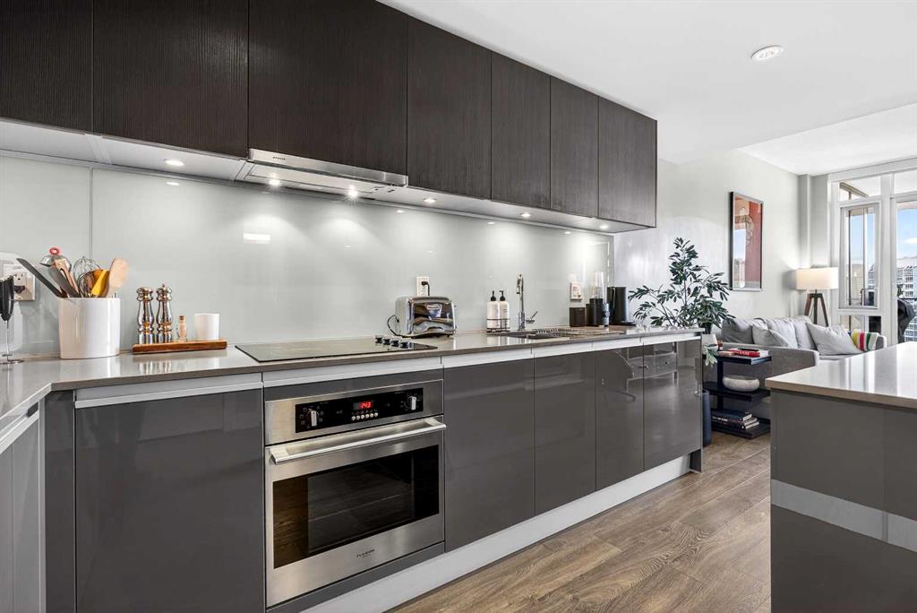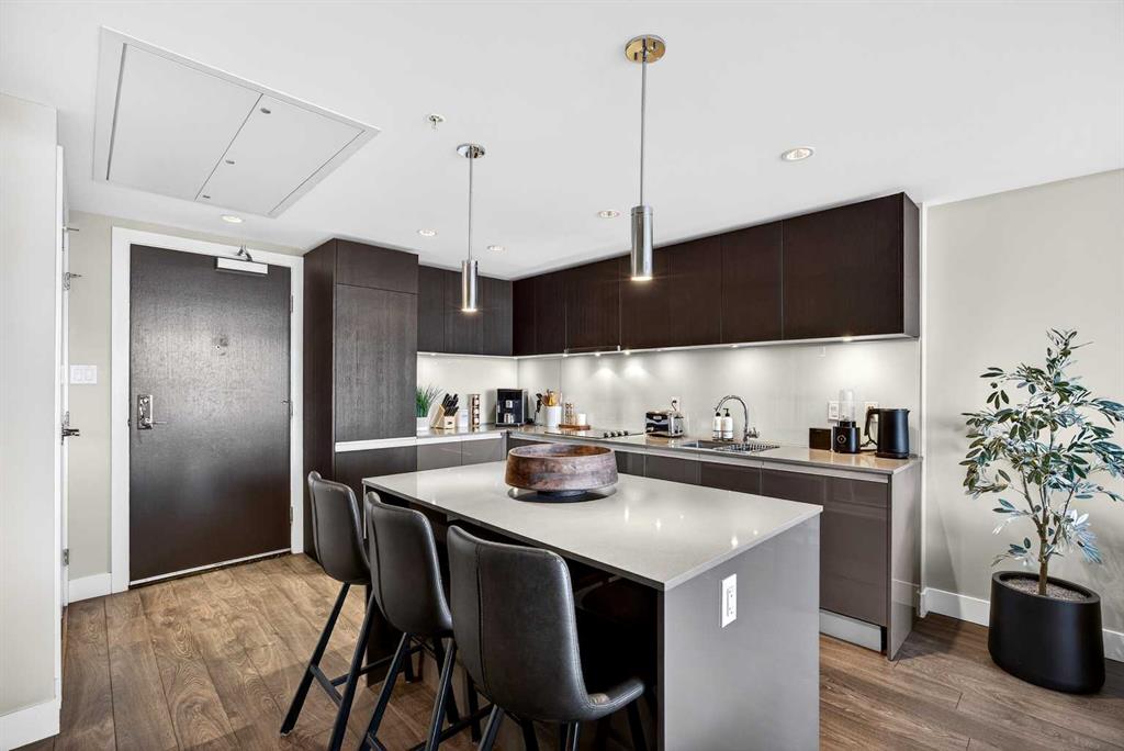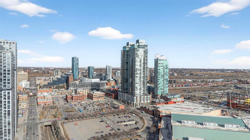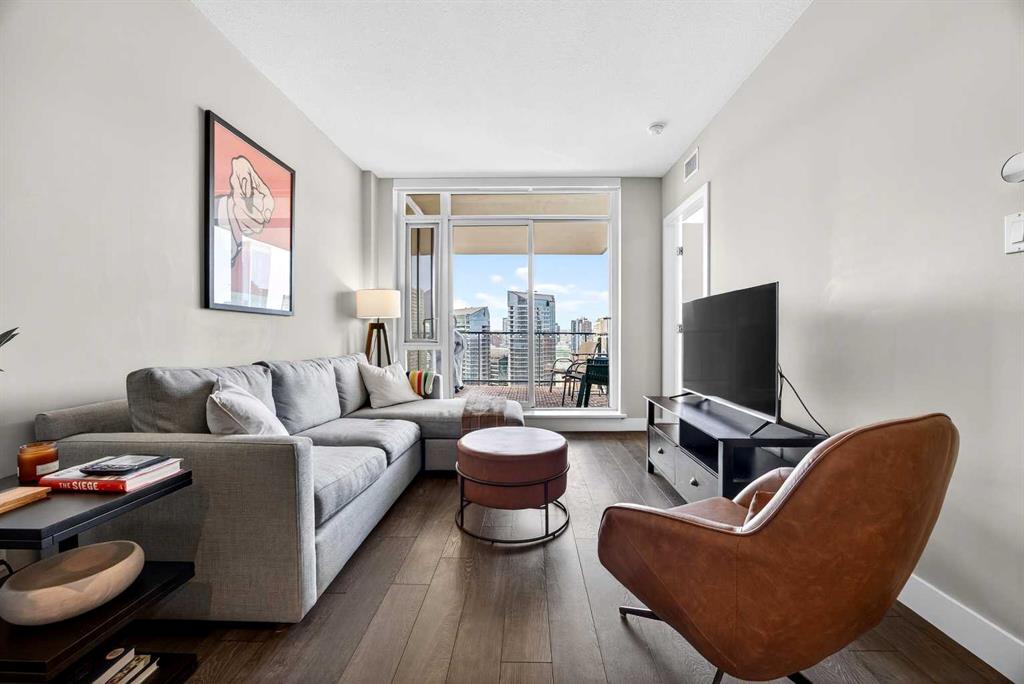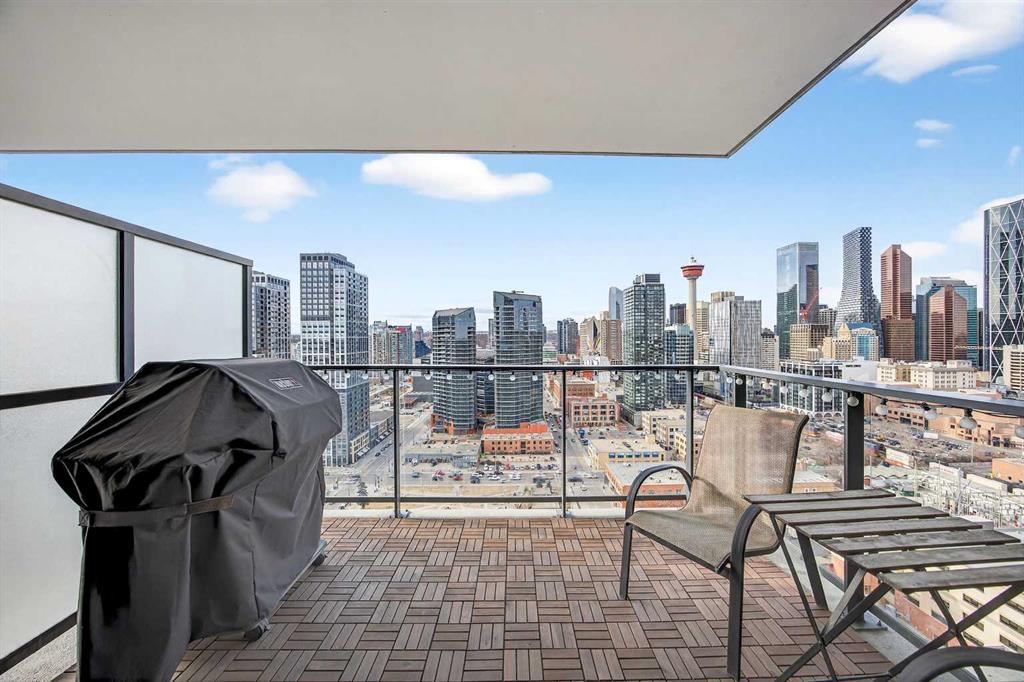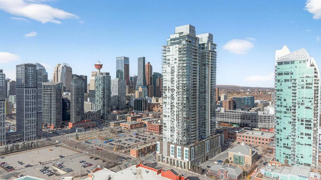 DOWNTOWN & MOUNTAIN VIEWS l HIGH FLOOR l BEST 1 Bed + 1 Bath Floor-Plan Available | Over 520 Sq. Ft. | Floor-to-Ceiling Windows | Titled Underground Parking | Premium Amenities | Prime Beltline Location l **Welcome to The Guardian, one of Calgary’s most well located high-rises in the heart of the Beltline. This bright and efficiently designed 1-bedroom, 1-bathroom condo offers over 500 sq. ft. of modern living space, ideal for professionals, first-time buyers, or investors seeking exceptional downtown value. The open-concept layout features sleek laminate flooring and expansive floor-to-ceiling windows showcasing impressive skyline and Stampede Park views. The contemporary kitchen is finished with modern cabinetry, quartz countertops, stainless steel appliances, and a central island perfect for casual dining or entertaining. The living area extends to a private balcony with a gas BBQ line — an ideal space to relax and enjoy the city lights. The spacious bedroom offers abundant natural light, a walk-through closet, and convenient access to a modern 4-piece bath. In-suite laundry and titled underground parking add everyday ease. Residents of The Guardian enjoy exceptional amenities, including a fully equipped fitness center, owner’s lounge and social room, concierge service, workshop, and secure bike storage. Located just steps from the Stampede Grounds, the Saddledome, 17th Ave, and Calgary’s best dining and entertainment, and all of the future action downtown – this is refined urban living in an unbeatable location.