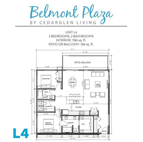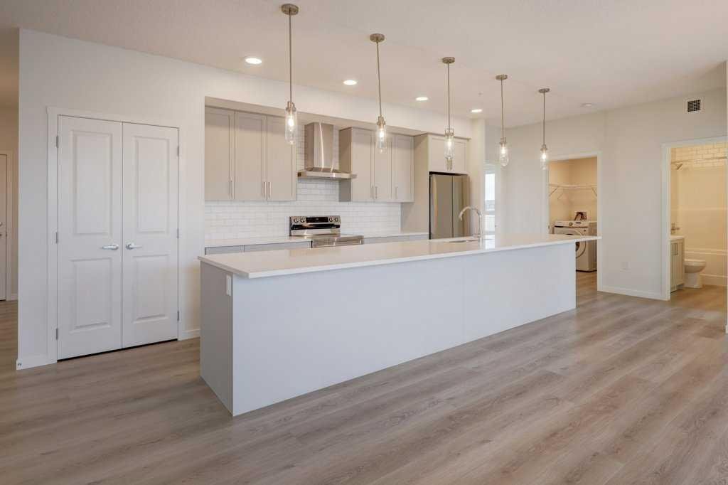 Introducing BELMONT PLAZA, a highly sought-after development in BELMONT, Calgary. BUILT BY CEDARGLEN LIVING, WINNER OF THE CustomerInsight BUILDER OF CHOICE AWARD, 5 YEARS RUNNING! BRAND NEW CORNER UNIT, “L4” floor plan with high-spec features. You will feel right at home in this well thought-out 1090.45 RMS sq.ft. (1165 sq.ft. builder size) 2 bed, 2 bath home with open plan, 9′ ceilings, LVP flooring through-out (upgraded, no carpet), Low E triple glazed windows, electric baseboard heating, BBQ gas line on the patio, A/C Rough in, and Fresh Air System (ERV). The kitchen is spectacular with full height TWO TONE cabinets, extended island upgrade, quartz counters, undermount sink, S/S appliances, including chimney hood fan, built in microwave, and pantry. The extended island is stunning and transitions into the spacious living & dining area, perfect for entertaining. The spacious primary bedroom has a large bright window, sizeable walk-in closet and 4 pc ensuite with extra bank of drawers & full height tile upgrade. 1 additional bedroom located across the unit for noise reduction/privacy and 4pc bathroom (also with upgraded full height tile) located nearby. Laundry & storage closet is thoughtfully planned, definitely a must see (washer/dryer included). Highlights include: upgraded lighting package, sound reducing membrane to reduce sound transmission between floors, clear glass railing to balconies and 1 titled underground parking stall included. Steps away from shopping, restaurants and so much more. Belmont offers a vibrant neighbourhood that’s extremely well-connected through Calgary’s major arteries. Community living with inspired design. PET & RENTAL FRIENDLY COMPLEX.