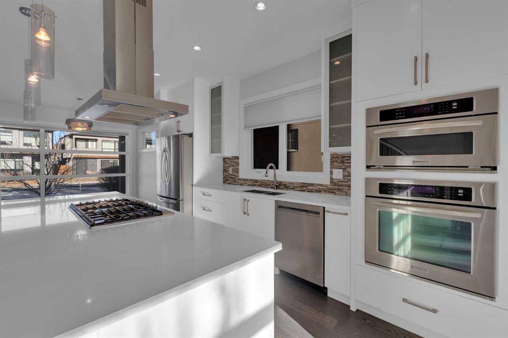 Welcome to Richmond/Knob Hill! This beautifully finished home offers 4 bedrooms, 3.5 bathrooms, a thoughtful layout, and a fully developed basement—truly a standout property. The bright, open-concept main floor features 9-foot ceilings, hardwood floors, and oversized windows that fill the space with natural light. The tiled front entry includes a spacious closet with French doors and custom organizers (no wire shelving in this house!), leading into a generous living room perfect for entertaining or settling in for a movie night. The chef-inspired kitchen boasts quartz countertops, a large island, ceiling-height cabinetry, a gas cooktop, built-in wall oven and microwave, and a pantry with custom shelving. It flows seamlessly into the dining area, which comfortably seats eight and is anchored by a gas fireplace with built-ins and a south-facing window. A discreetly positioned 2-piece powder room and a mud room with French door closet and additional built-ins complete the main level. Upstairs, an extra-wide staircase and skylight create an inviting transition to the second floor, where you’ll find 9-foot ceilings and an ideal layout. The private primary suite overlooks the backyard and includes a spacious 5-piece ensuite with dual vanities, a deep soaker tub, an oversized shower, and a dreamy walk-in closet with extensive built-ins. Two additional large bedrooms sit at the opposite end of the home, each with built-in closets, large windows, and a shared balcony complete with soffit lighting. A 4-piece bathroom with quartz countertop and a dedicated laundry room with soft-close cabinetry complete this level. The basement feels anything but below-grade, thanks to large windows and cozy in-floor heat. The rec room offers a great space for family time and includes a well-appointed wet bar. A fourth bedroom with two windows and a huge walk-in closet sits next to a full 4-piece bathroom. Additional highlights include a linen closet, ample storage, and an exceptionally tidy utility room. Outside, the sunny south facing backyard features a lovely deck and leads to a detached double garage (insulated and drywalled). *LOCATION – 5 minute walk to Richmond Elementary, 3 kms to Mount Royal University, 10 blocks to Marda Loop, easy access to all major commuter routes and only a 10 minute drive into downtown. *BONUS – central vac rough-in, sump pump, freshly painted, professionally cleaned and move-in ready!