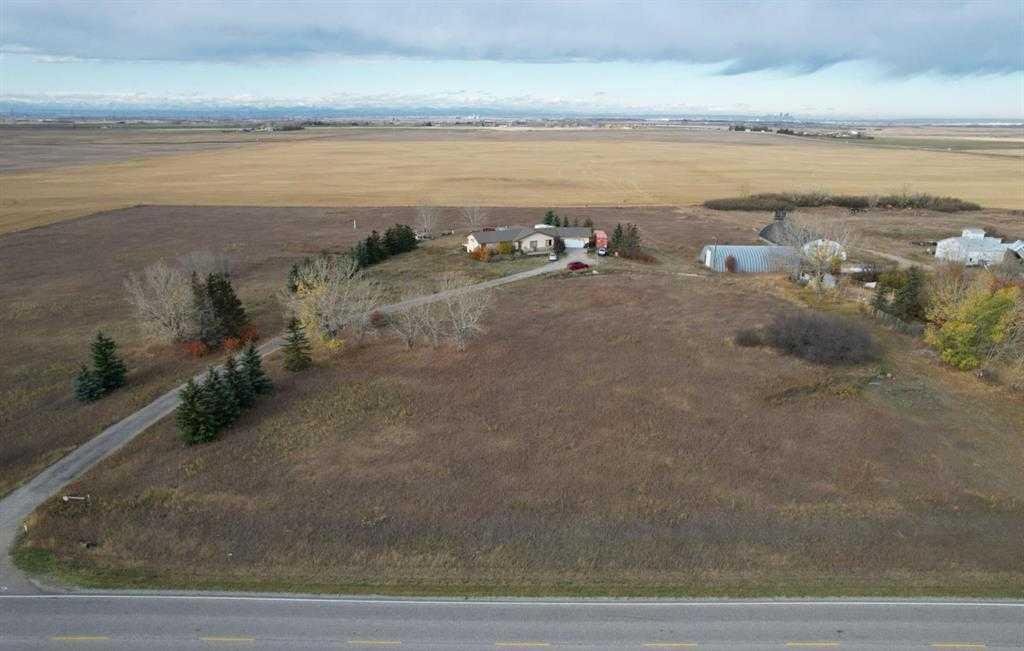 Prime Investment Opportunity! Rare 11.54-acre revenue property at the high-visibility corner of Glenmore Trail & Hwy 791, generating $9,300/month in rental income. The property features 2 detached homes (large bungalow & 2-storey), each with double garages and separate gas & electric meters. Additional income-producing buildings include 2 large Quonsets, barn, and multiple sheds. Mature trees provide privacy and separate entrances one for each home. The parcel offers 233 meters of frontage on Hwy 791 and approx. 200m depth, with beautiful mountain and Calgary skyline views. Ideally located only 25 minutes to Downtown Calgary, 4 minutes to Calgary city limits, and only a 4 minute drive to the Painted Sky Commercial in Langdon. Excellent holding property with strong cash flow and future development potential.