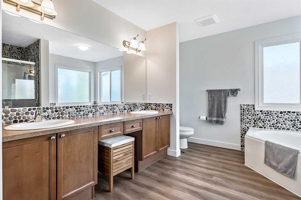 Inside, the open-concept main floor features 9 ft ceilings, a unique open stairwell, and new Vinyl plank flooring. The Classy kitchen is beautifully appointed with granite countertops, solid wood cabinetry and custom Rock backsplash creating a warm and inviting space for family gatherings. The formal dining room off the front entrance provides the perfect setting for entertaining guests. Upstairs, the primary suite is a true retreat, offering a private 5-piece ensuite with a jetted soaker tub, oversized tiled shower with bench seat, and dual sinks. Enjoy quiet moments in the seating nook overlooking the golf course. Three additional bedrooms, all generously sized, complete the upper level. Step outside to a large ground-level deck that spans the full width of the home — ideal for outdoor dining and summer barbecues . The property is fully landscaped front and back and located on a quiet cul-de-sac, ensuring privacy and tranquility. The basement provides endless possibilities to design your perfect space. This is a superb home ideal for your family!
