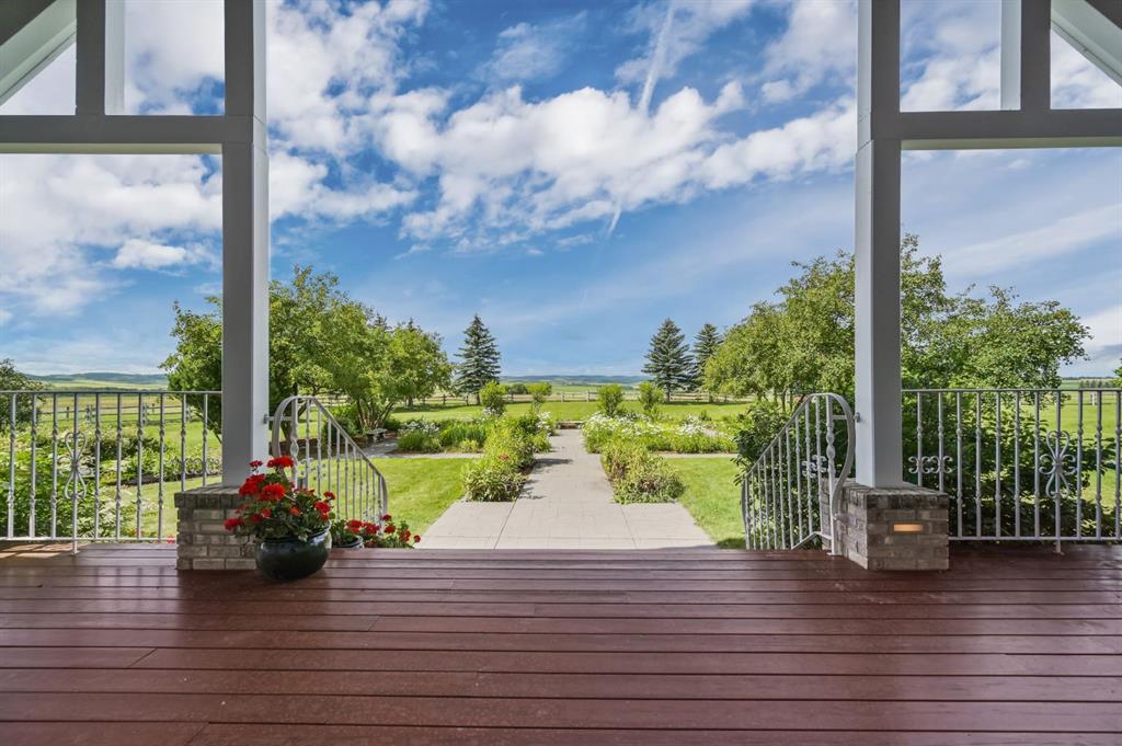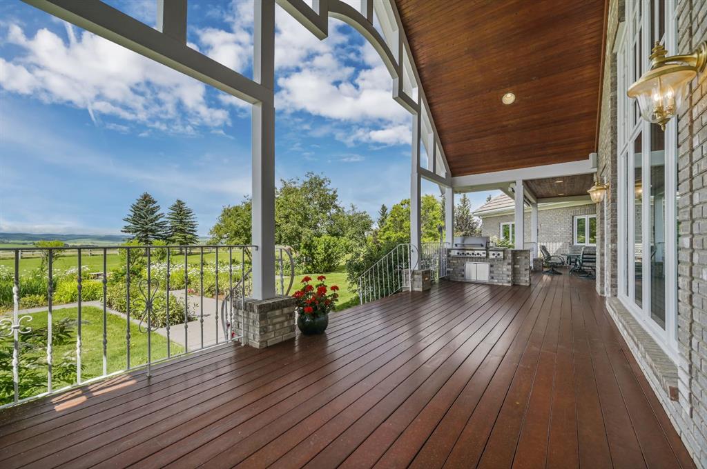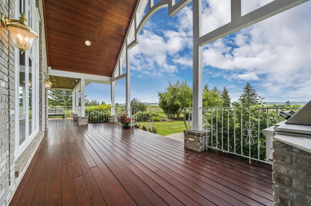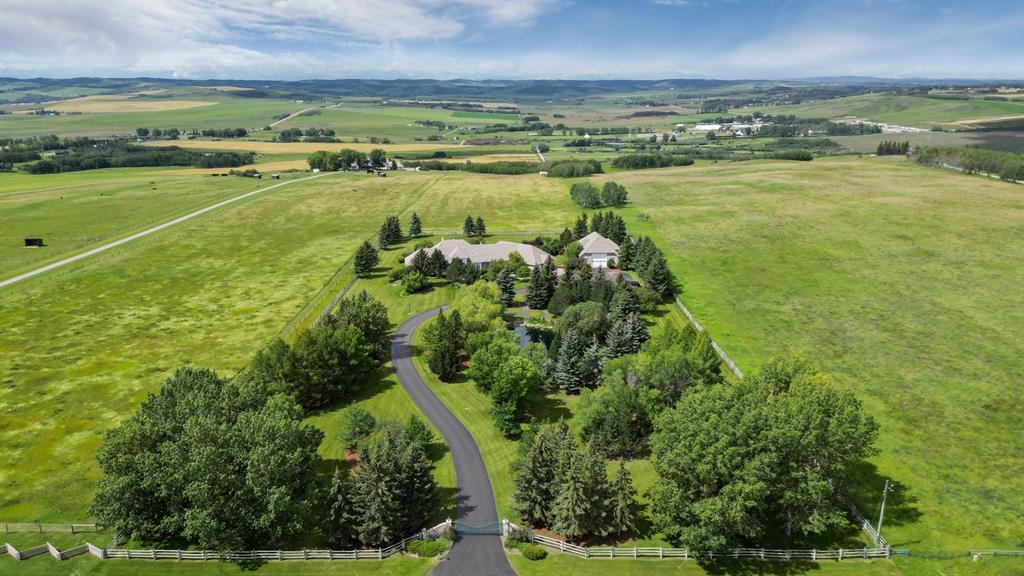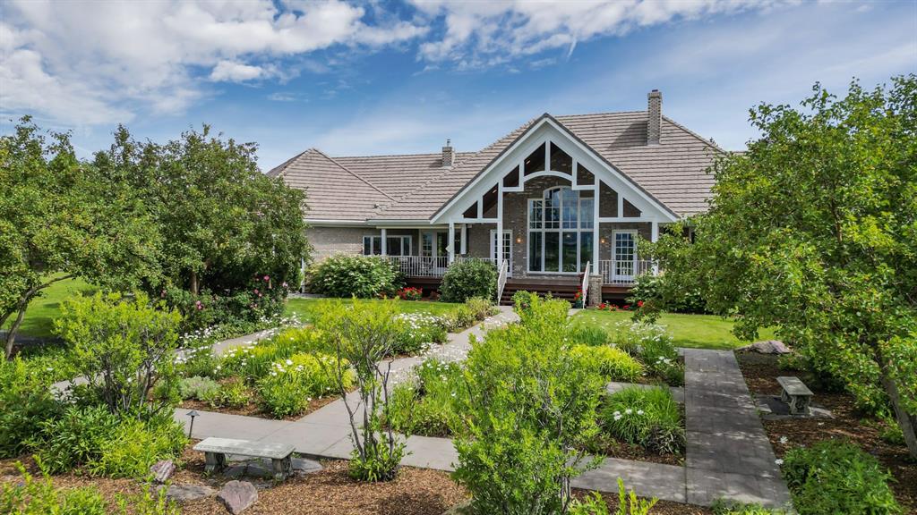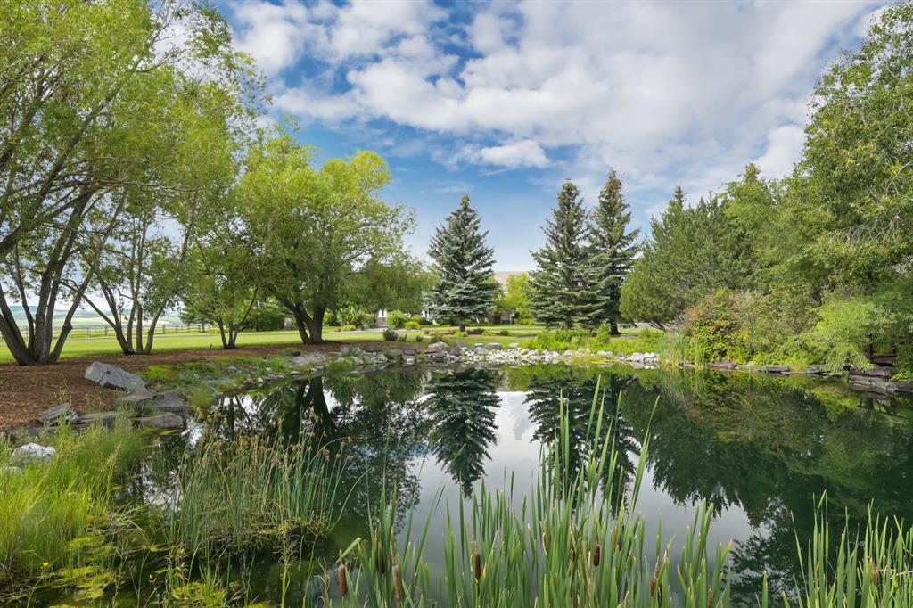 Set on 4.94 acres in the scenic beauty of Rural Foothills County, this impeccably maintained bungalow offers over 9,500 square feet of living space—providing the peace and privacy of a country estate just a short drive from Calgary’s downtown core. From the moment you arrive, the stately brick exterior, durable clay tile roof, and manicured landscaping hint at the exceptional quality within. A serene pond with a cascading waterfall sets a tranquil tone, while a beautifully landscaped courtyard adds to the property’s charm. Inside, a grand marble-floored entryway opens into the expansive living room, where a wood-burning fireplace and large west-facing windows frame spectacular mountain views. Rich hardwood floors flow throughout the main level, complementing the timeless design. The chef’s kitchen, crafted by Empire Kitchen and Bath, features Gaggenau and Sub-Zero appliances, custom cabinetry, and generous prep space. A den and an office with custom built-ins offer quiet retreats, while the massive primary bedroom boasts a walk-in closet and a spa-inspired ensuite with a soaker tub. Two additional bedrooms and a well-appointed mud/laundry room off the heated triple-car garage complete the main level. Outdoor living is elevated with a massive west-facing deck, complete with a built-in BBQ that steps down into a beautifully landscaped garden with stone walkway. The lower level includes a fully built-out legal nanny suite with kitchen, living room, and bedroom, thoughtfully tucked away for privacy. Additional spaces include a games room, billiards room, recreation area, exercise space, full wet bar, a fourth bedroom, and two more wood-burning fireplaces. An extraordinary 2,300 square feet RV garage/workshop offers endless possibilities for collectors, hobbyists, or large-scale projects. Blending elegance, functionality, and an enviable location, this estate is just minutes from Calgary’s city limits, Strathcona-Tweedsmuir School, the Calgary Polo Club, and Spruce Meadows—delivering a rare combination of luxury, privacy, and convenience.