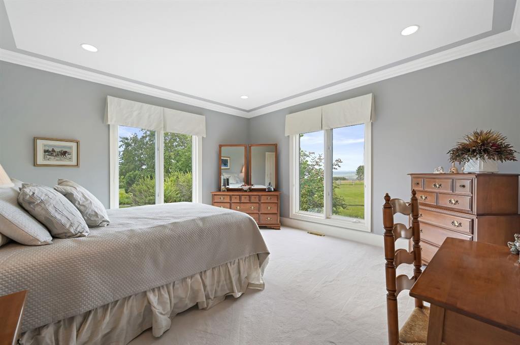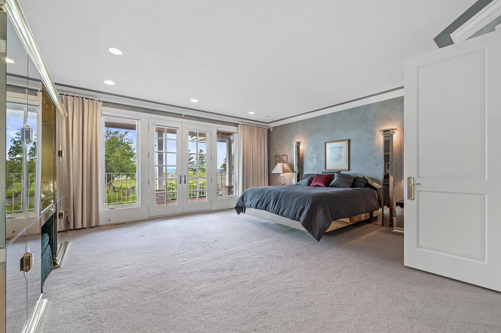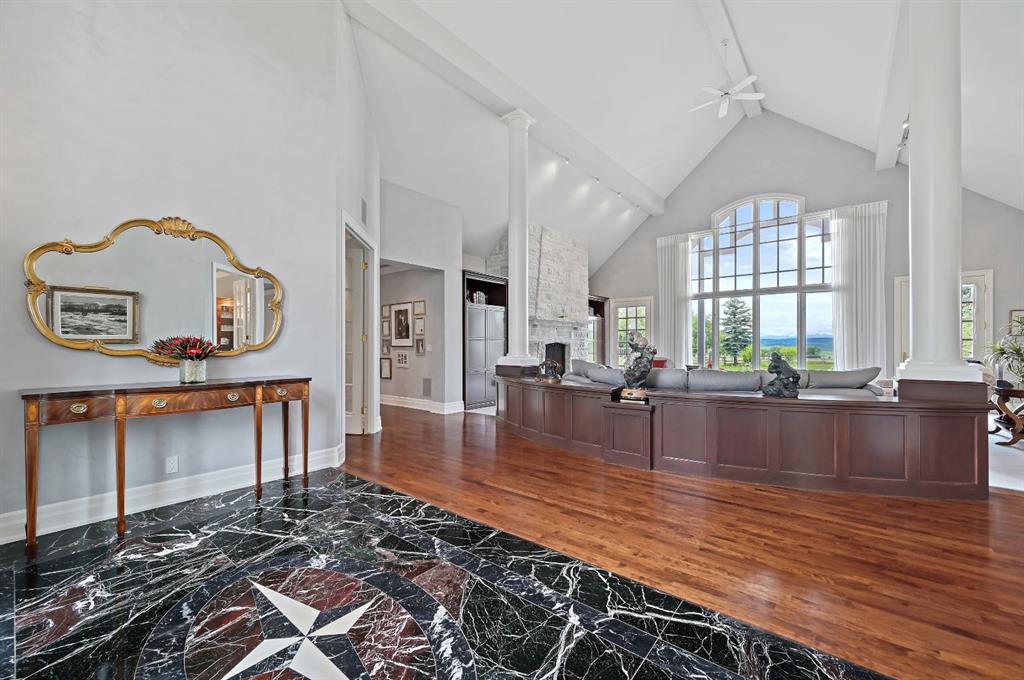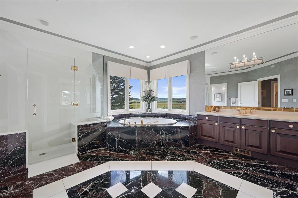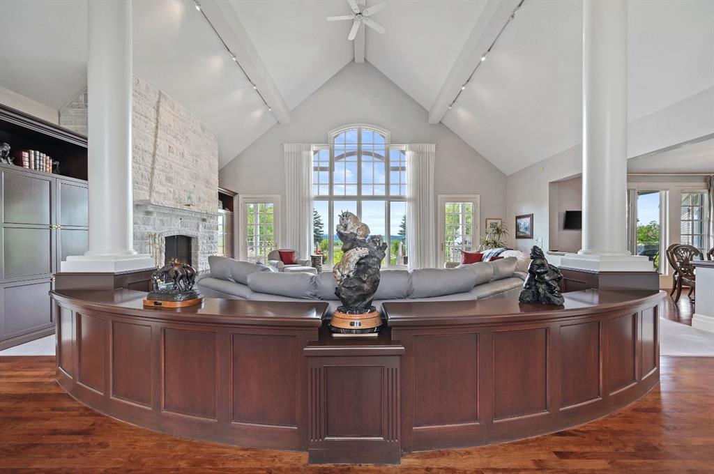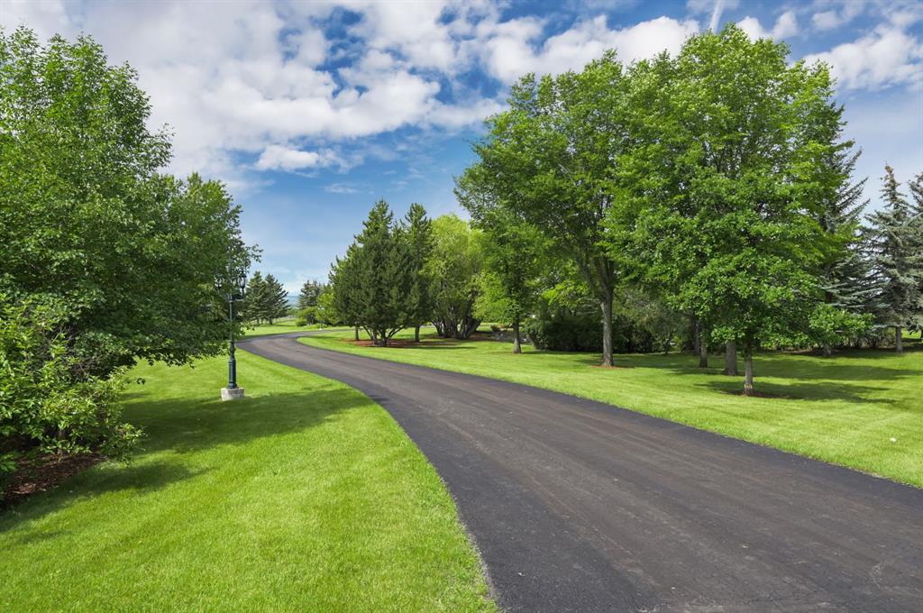Set on 4.94 acres in the scenic beauty of Rural Foothills County, this impeccably maintained bungalow offers over 9,500 square feet of living space—providing the peace and privacy of a country estate just a short drive from Calgary’s downtown core. From the moment you arrive, the stately brick exterior, durable clay tile roof, and manicured landscaping hint at the exceptional quality within. A serene pond with a cascading waterfall sets a tranquil tone, while a beautifully landscaped courtyard adds to the property’s charm. Inside, a grand marble-floored entryway opens into the expansive living room, where a wood-burning fireplace and large west-facing windows frame spectacular mountain views. Rich hardwood floors flow throughout the main level, complementing the timeless design. The chef’s kitchen, crafted by Empire Kitchen and Bath, features Gaggenau and Sub-Zero appliances, custom cabinetry, and generous prep space. A den and an office with custom built-ins offer quiet retreats, while the massive primary bedroom boasts a walk-in closet and a spa-inspired ensuite with a soaker tub. Two additional bedrooms and a well-appointed mud/laundry room off the heated triple-car garage complete the main level. Outdoor living is elevated with a massive west-facing deck, complete with a built-in BBQ that steps down into a beautifully landscaped garden with stone walkway. The lower level includes a fully built-out legal nanny suite with kitchen, living room, and bedroom, thoughtfully tucked away for privacy. Additional spaces include a games room, billiards room, recreation area, exercise space, full wet bar, a fourth bedroom, and two more wood-burning fireplaces. An extraordinary 2,300 square feet RV garage/workshop offers endless possibilities for collectors, hobbyists, or large-scale projects. Blending elegance, functionality, and an enviable location, this estate is just minutes from Calgary’s city limits, Strathcona-Tweedsmuir School, the Calgary Polo Club, and Spruce Meadows—delivering a rare combination of luxury, privacy, and convenience.