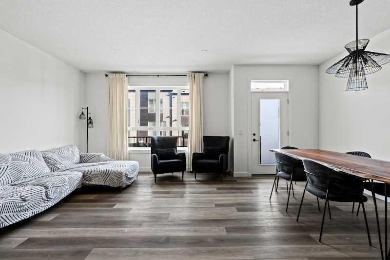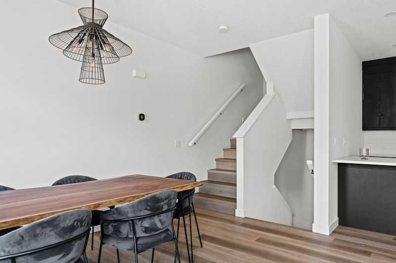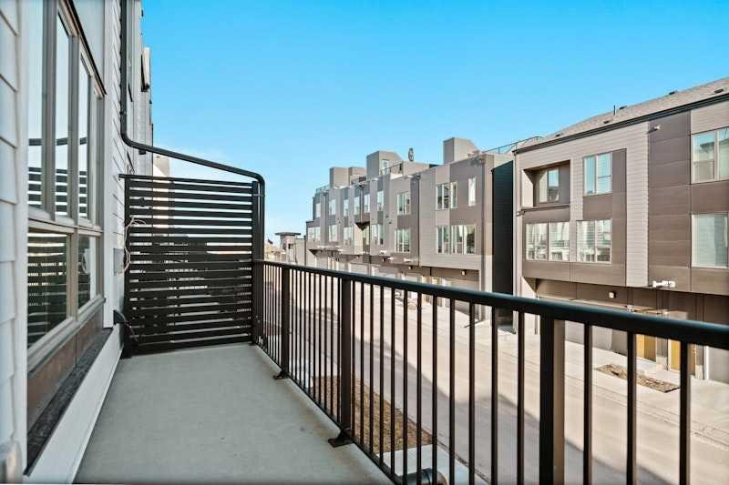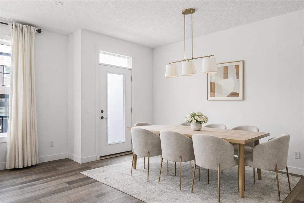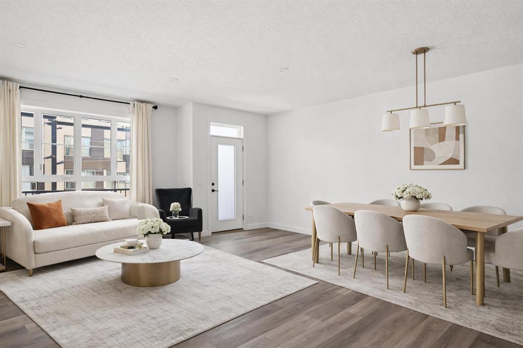 Welcome home to this beautifully maintained townhome in Crown Park, Calgary’s newest inner-city community. Offering over 1,400 sq. ft. of thoughtfully designed living space, this home features 2 bedrooms, 2.5 bathrooms, a private single attached garage, and a convenient driveway for additional parking. This well-appointed 3-storey townhome showcases an open-concept floor plan designed for both everyday living and entertaining. The layout places the kitchen between the living room and dining area, creating a seamless flow throughout the main level, ideal for entertaining or for families with children. The kitchen is finished with full-height soft-close cabinetry, quartz countertops, a large pantry, and a stainless-steel appliance package that includes an electric range, chimney hood fan, and built-in microwave. Just off the dining area is access to a spacious private balcony spanning the entire width of the home, perfect for outdoor relaxation or hosting guests. Luxury vinyl plank flooring runs throughout the main level, while large windows and 9-foot ceilings enhance the bright, inviting atmosphere. The same luxury vinyl plank flooring continues up the stairs and throughout the upper level, offering a carpet-free interior that is both pet-friendly and easy to maintain. Upstairs, the primary bedroom features a walk-through wardrobe and private ensuite complete with a walk-in shower. A second generously sized bedroom, an additional full bathroom, and convenient upper-level laundry complete the upper floor. The main entry level includes a welcoming foyer with a coat closet and access to a discreetly located 2-piece powder room for guests. Situated in the highly desirable Crown Park community, this home offers an exceptional location near Shaganappi Golf Course, walking trails along the Bow River, transit access, and a wide array of nearby dining, shopping, and entertainment amenities. Perfect for professionals, couples, or downsizers seeking low-maintenance living in a prime inner-city setting.