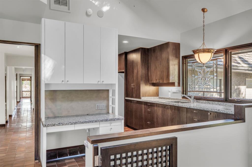 mountains. The upper level offers even more flexibility: a lofted family room with a Spanish-style wood-burning fireplace, a bright skylit den, a hobby