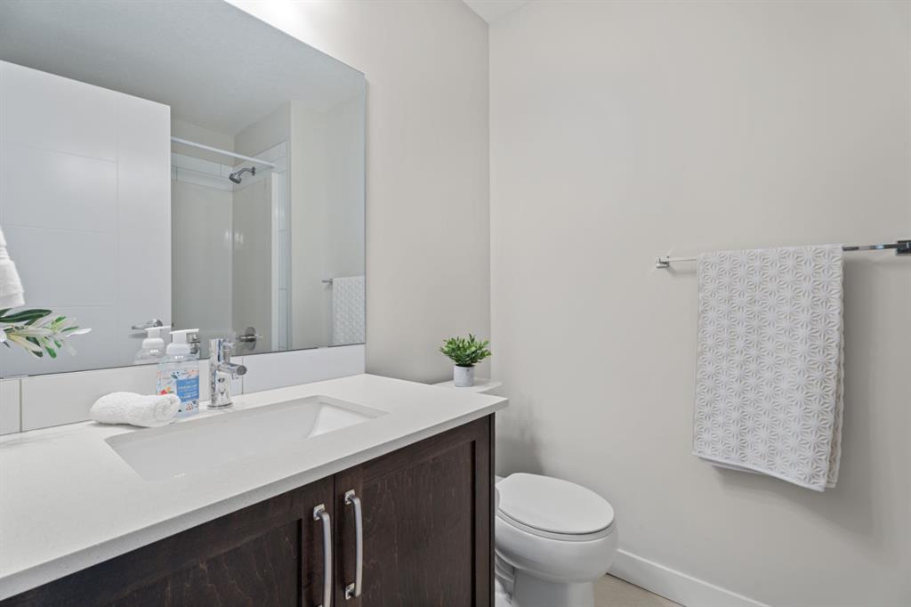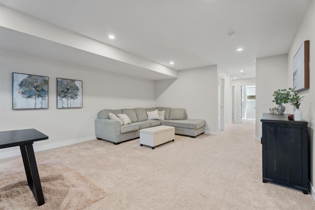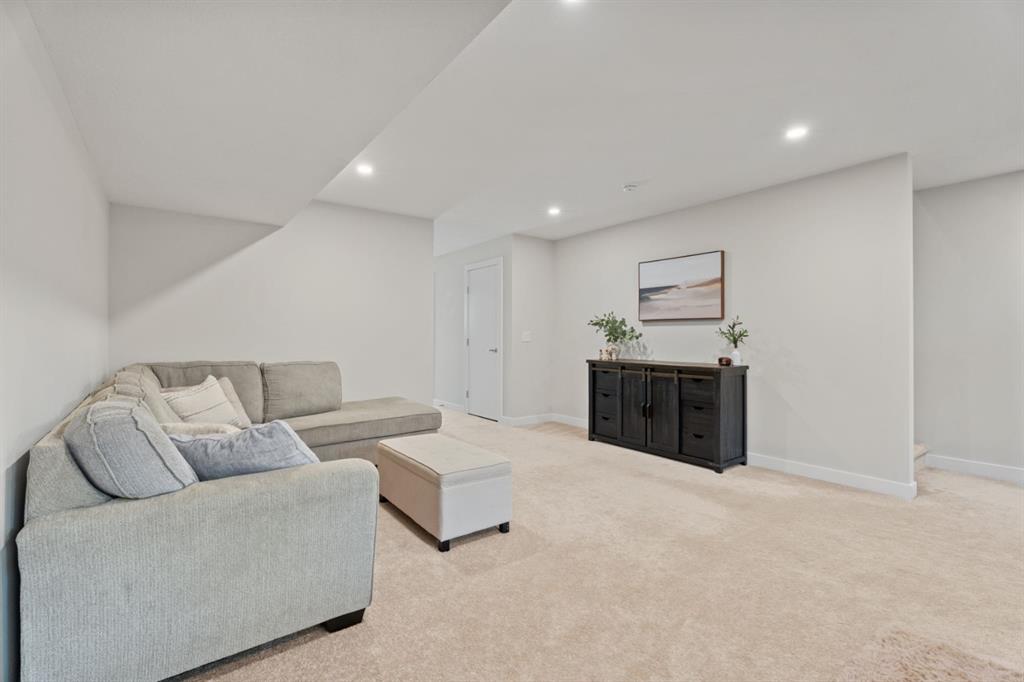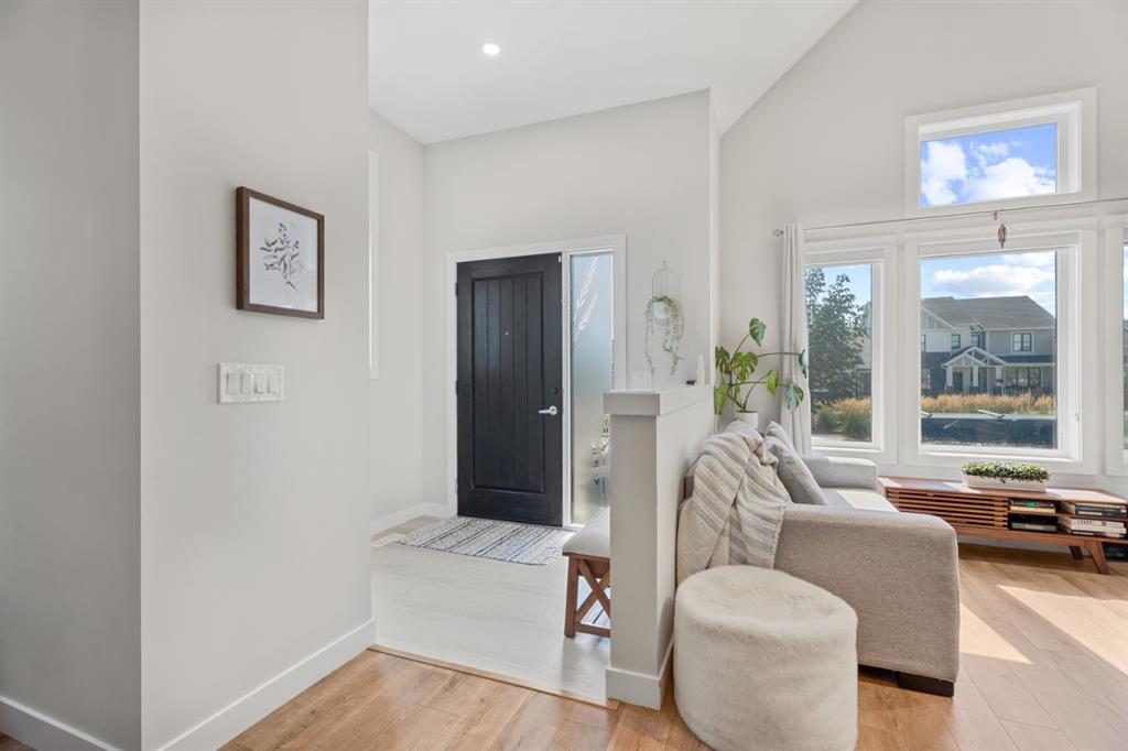 This upgraded END UNIT bungalow combines modern design, superior finishes, and a convenient location. Perfectly set in the middle of the street, away from the traffic circle and main road, you’ll enjoy a quieter setting with plenty of street parking and easy access to nearby walking paths. Inside, soaring VAULTED and cathedral ceilings paired with oversized windows create an incredible sense of light and space. The fabulous floor plan is open yet functional, featuring luxury vinyl plank flooring, a spacious living room, and a full sized dining area that’s bathed in natural light with the additional windows (end unit). The kitchen is a showpiece with a gas stove, upgraded hood fan, ceiling height soft close cabinetry, a PANTRY, quartz countertops, and an island. The primary suite is a true retreat with 13’ ceilings that add space for even the largest furniture pieces. A generous walk-in closet and ensuite with quartz counters & dual vanity complete the space. A main floor powder room and laundry add convenience, while the back entrance includes a built in bench with ample storage. Classic iron railings lead to the fully finished basement which is fabulous- featuring a huge family room, two oversized bedrooms, and a full bathroom. Large windows bring in plenty of sunshine, making the space feel bright and welcoming. You will notice all the extra features throughout, this home feels brand new and with a Built Green certification. Comfort features like a water softener and air conditioning are already in place, ensuring ease of living year round. The private backyard is maintenance free with low upkeep landscaping, perfect for people on the go, down sizers, or snowbirds. The detached DOUBLE garage is insulated and drywalled, providing excellent storage and functionality. And with absolutely NO CONDO FEES, you’ll love the freedom of ownership without extra costs. This stylish, move in ready home delivers modern upgrades, a fabulous floor plan, and a highly desirable location close to walking paths and amenities and quick access to Calgary. Check out the virtual tour!