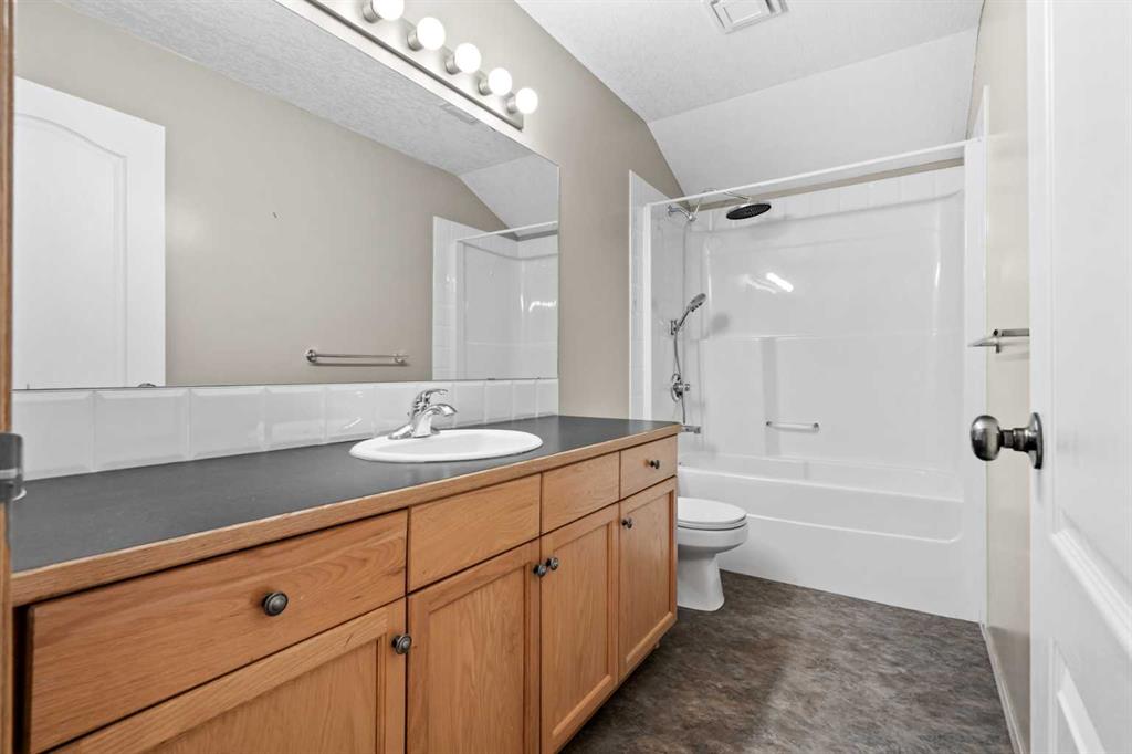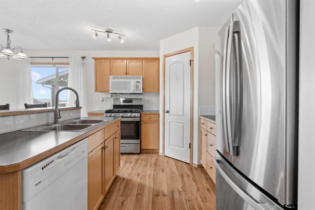 From the moment you arrive, you’ll appreciate the inviting curb appeal and practical layout designed for everyday living. Step inside to a bright, open foyer with large windows that flood the space with natural light. The functional main floor features a well-appointed kitchen complete with a central island, pantry, ample cabinetry, and standard appliances. Just off the kitchen is the dining area, perfectly positioned for family meals and entertaining. At the back of the home, the spacious living room showcases a large south-facing window that captures stunning mountain views and fills the space with sunshine.