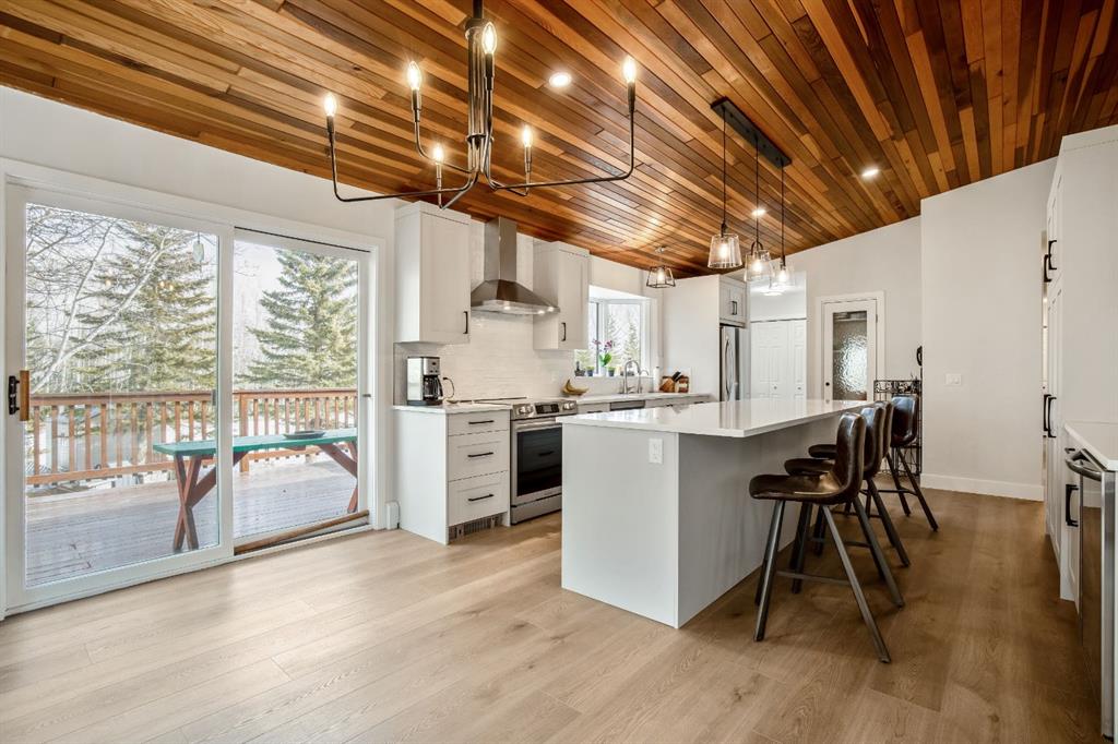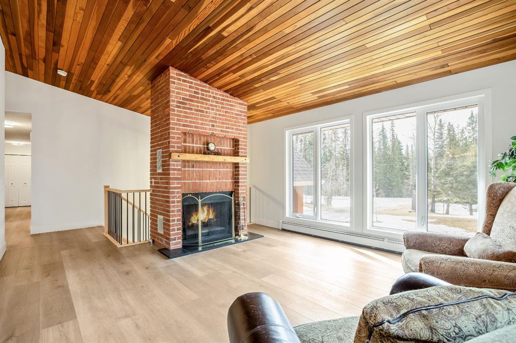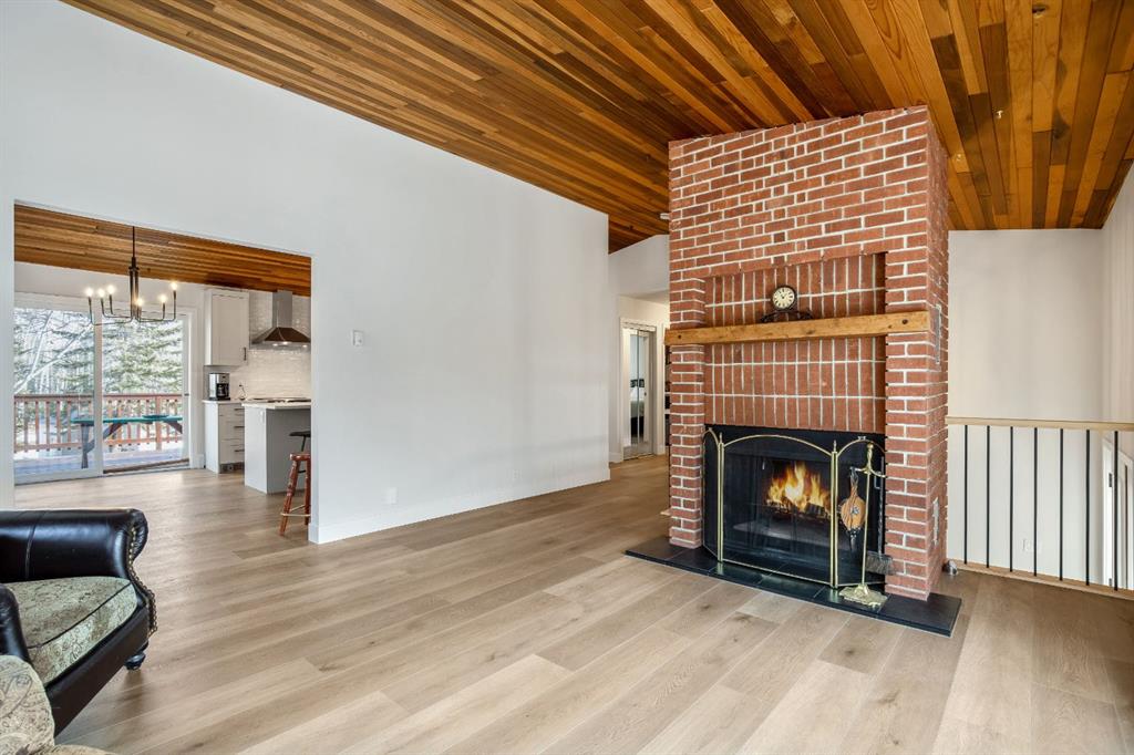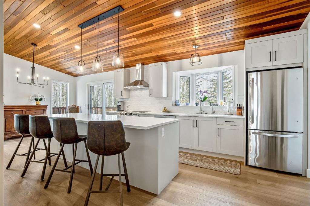 OPEN HOUSE – SUNDAY JANUARY 25 – 1 pm to 3 pm. Bright and sunny professionally renovated home in West Bragg Creek located mid way between the Hamlet and the Bragg Creek trail system. All you need to do is unpack your furniture and start enjoying country life. Major renovations include a stunning Legacy kitchen with shiny quartz counters, electric slide in range featuring convection bake, no preheat, steam bake and Air Fry to make cooking a breeze. New flooring throughout, upstairs windows are triple glazed and upstairs bathrooms refinished. Three bedrooms upstairs, brick fireplace in living room, family room with large windows on lower level. Hot water heating with 5 zones ensures each room meets your living temperature ideals. Underdrive garage is heated. Park like yard is perfect for kids and dogs. Children’s slide and swings, gas BBQ on deck, fire pit with seating and a large dog run. Everything you need to start your rural life – all yard furniture and even the ride on lawn tractor to help maintain your yard. No water or septic concerns here! Mountain View Park has its own water and sewer system.