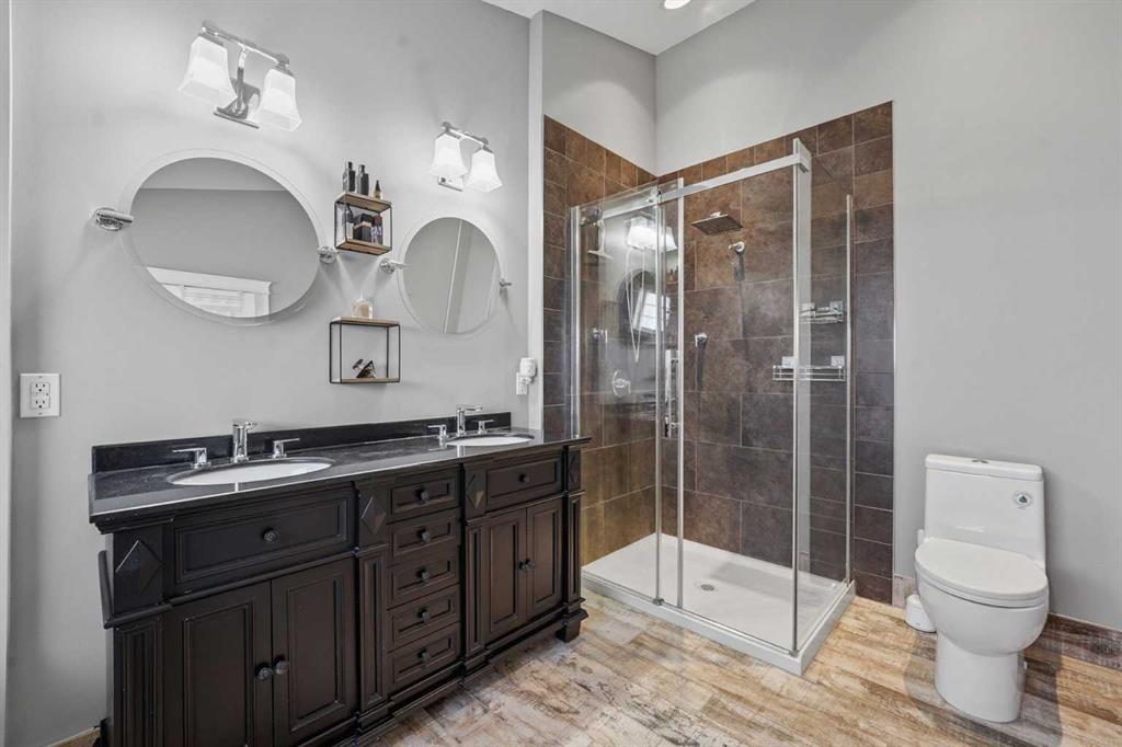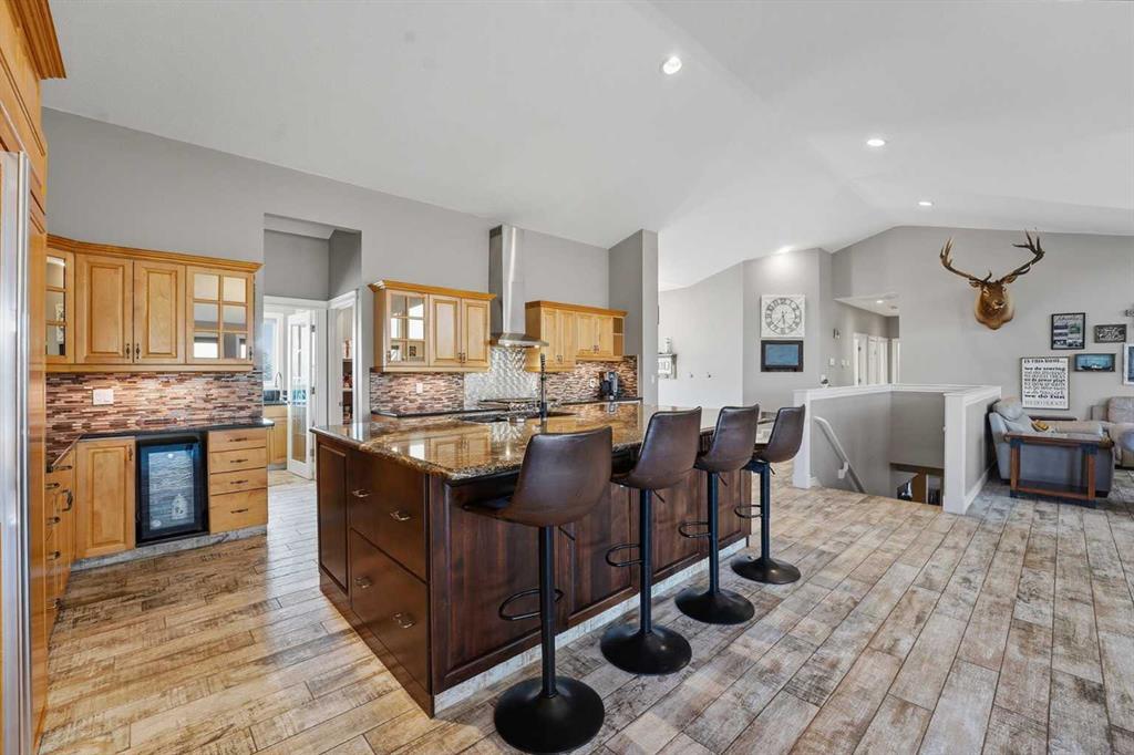 Soaring 13′ vaulted ceilings elevate every main floor room , while the open-concept design showcases a chef-inspired kitchen with 2 dishwashers, 2 wine fridges, a hammer copper sink, gas range, tonnes of in-island storage & an abundance of natural light everywhere! The main living area has wide planked tile floor which is made to mimic hardwood with the durability of tile for kids and animals – and the windows have a solar shield to aid with keeping the heat out on warm summer days. This home has two amazing “at home office” options you must see – one with outside access! The fully developed walkout basement with 9FT CEILINGS & in-floor heat features a spacious recreation area, bar, 2 additional large bedrooms, an awesome office, 4 piece bathroom with STEAM SHOWER and in addition – a gym/flex room! Checkout the floor plan & room measurements to truly understand how FUNCTIONAL this home is. Noteworthy upgrades & features include hot water on demand, new carpet, IN-FLOOR heat, 220V in garage, in ground sprinkler system taken care by the community association. The landscaping is DONE from one end to the other on an oasis of lush trees & grass to enjoy year round! Bring your ATV, your golf cart and your RV – you’ve got inside storage & outside space to spare!