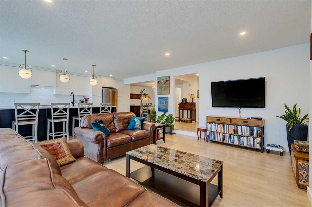 Beautifully renovated end unit townhome, over 2056 sq ft of living space, and backing directly onto a golf course— offering privacy, views, and a serene lifestyle. Inside, the main floor has been thoughtfully updated with modern finishes including all new light fixtures and luxury vinyl plank flooring. A front office with elegant French doors provides a quiet workspace while allowing natural light to stream through. The open-concept kitchen and living room make entertaining a pleasure, with a stunning wall of windows inviting in natural light and showcasing your exclusive outdoor retreat overlooking the golf course. The kitchen has black and white cabinetry with Quartz countertops, a large island with seating for four, abundant counter and cupboard space, and stainless-steel appliances. The living room is very spacious and features a Bluetooth-enabled electric fireplace that can also act as a speaker! A formal dining room, separate laundry room, a half bath, and access to the attached double car garage complete this level. Upstairs, you’ll find three generously sized bedrooms. The primary retreat is exceptionally spacious and includes access to a private balcony with views of the greenspace. The spa like ensuite offers a deep standalone tub, double sinks, separate shower, and a walk-in closet with organizers. A second beautifully renovated full bathroom serves the additional bedrooms, which also enjoy views of the golf course. The basement offers one finished room with the remainder ready for your personal touch. Outdoor living is where this home truly shines — enjoy a private patio facing the golf course with no neighbours behind, plus additional green space beside the unit. Don’t be surprised when the deer come for a visit! The furnace, hot water tank and electrical were updated in 2022, and the A/C is a couple years old. The exterior has been freshly painted. The location can’t be beat: a quiet street and backing onto Canyon Meadows Golf Course!