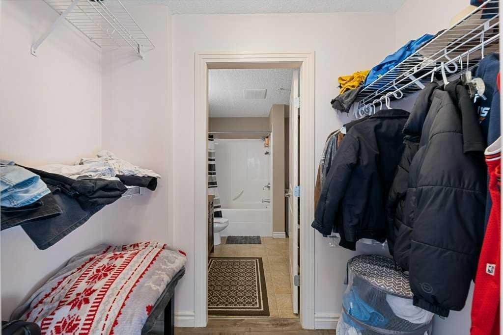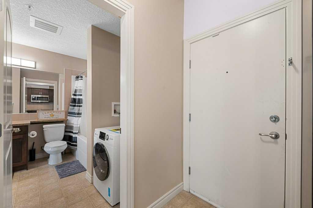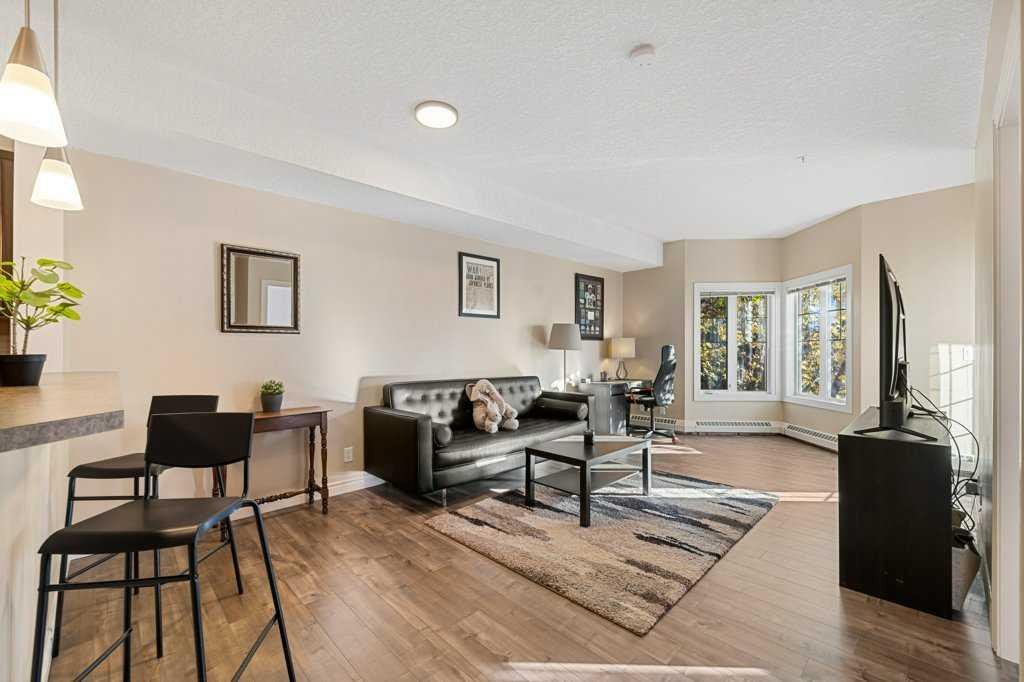 Set on the second floor of Building 60 at Red Haus, this bright, south-facing one-bedroom overlooks a beautiful courtyard and feels instantly welcoming. Laminate flooring flows through the living room and bedroom, while the kitchen shines with maple cabinetry and a raised breakfast bar. The open-concept living/dining area is flooded with natural light and includes a versatile flex nook—perfect for a desk, bookcase, or hutch. The spacious bedroom offers a walk-through closet to a 4-piece bathroom, and the in-suite laundry features a newer washer/dryer. Step out to the private balcony for morning coffee or evening downtime.