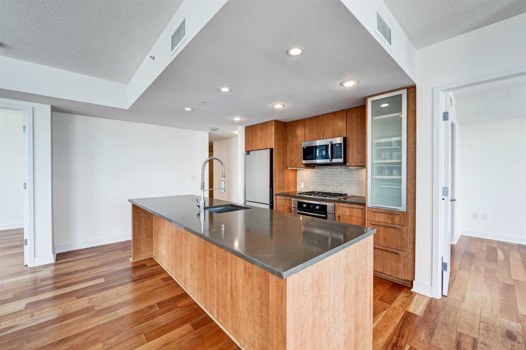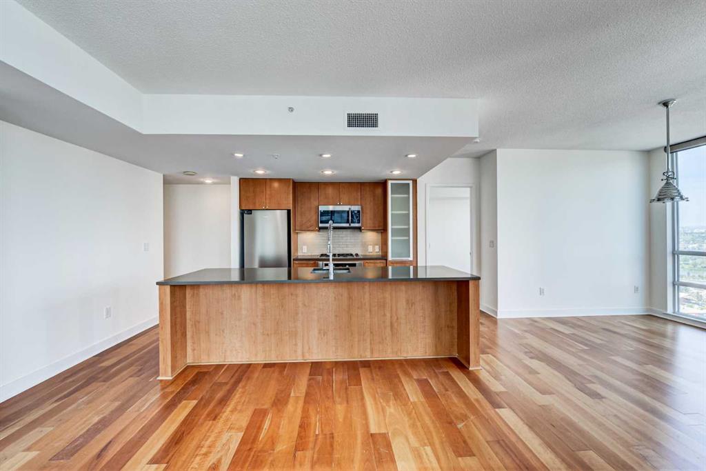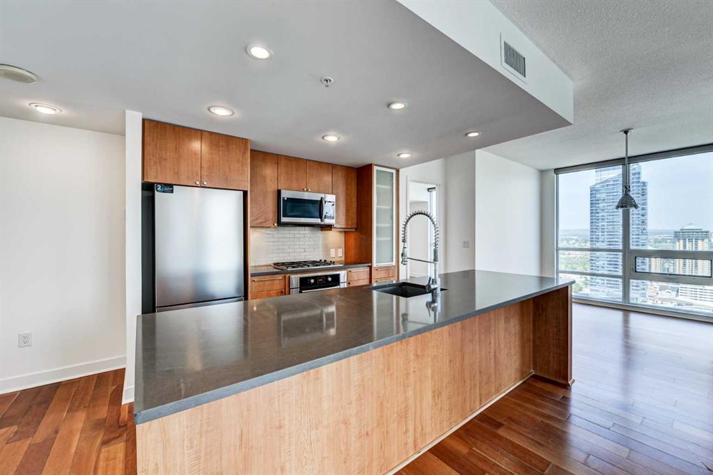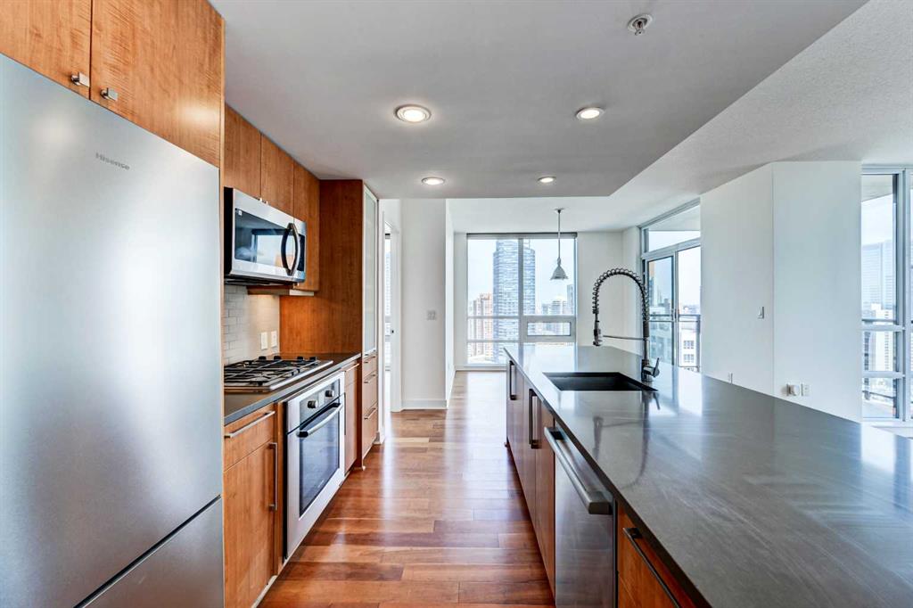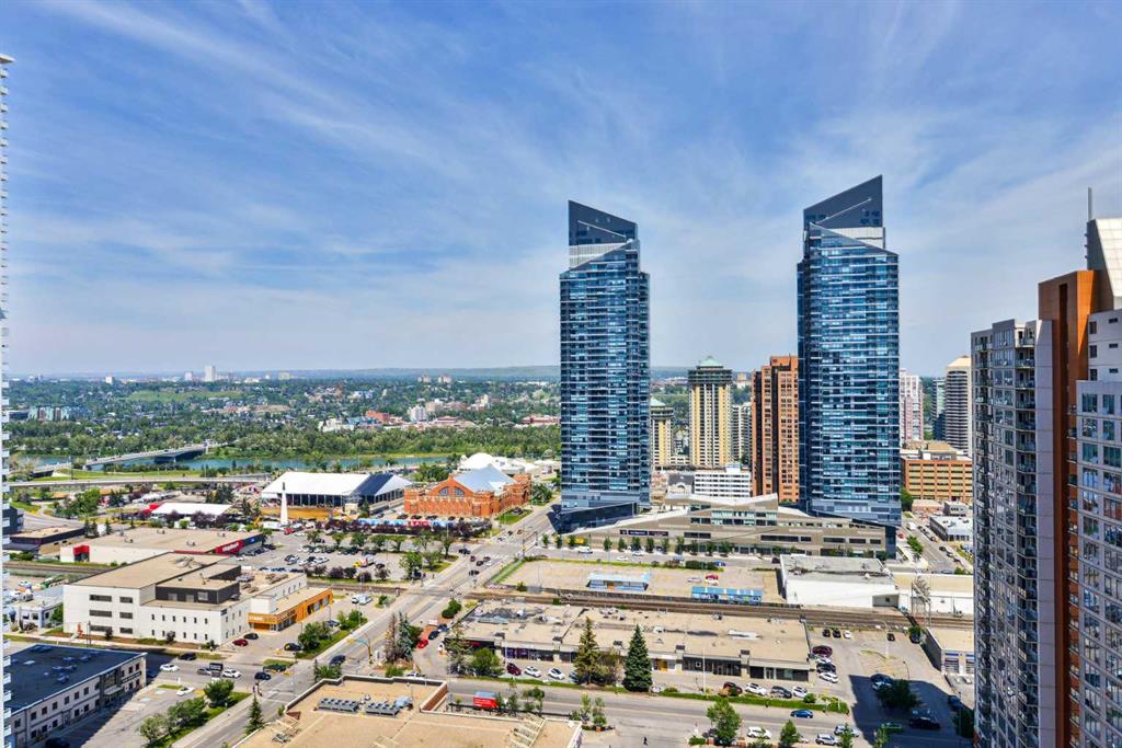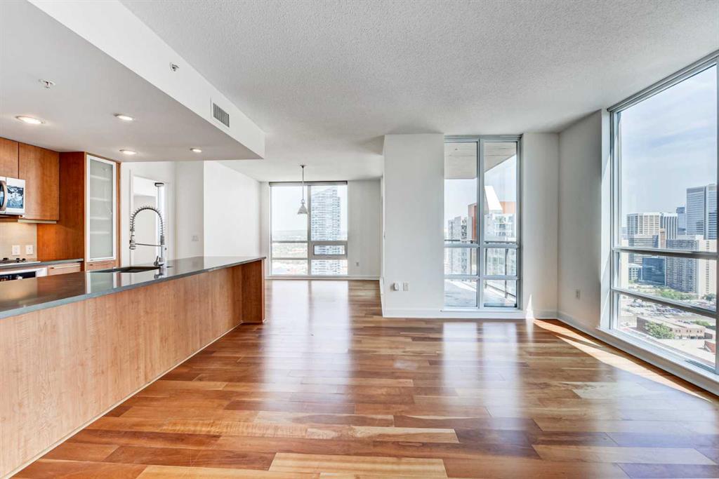 Experience elevated urban living in this stunning sub-penthouse unit on the 24th floor of the Nova Building, featuring one of the most spectacular panoramic NE corner views in the city. This highly coveted floor plan offers 2 bedrooms + den, 2 full bathrooms, titled underground parking, and 2 storage lockers, providing exceptional comfort and convenience. Recently updated throughout, this move-in-ready home has been freshly painted, including ceilings, with new doors and baseboards adding a crisp, modern finish. The open-concept layout features floor-to-ceiling windows, flooding the space with natural light and showcasing the breathtaking skyline. Interior details include luxury wide-plank laminate hardwood flooring, quartz countertops, a massive kitchen island, and brand-new, never-used stainless steel appliances including a fridge, microwave/hood fan, and dishwasher. Perfect for entertaining or day-to-day living, the seamless flow between the kitchen, dining, and living areas makes this home both functional and inviting. The generously sized primary suite offers a true retreat with a spacious walk-through closet leading to a spa-inspired ensuite featuring dual vanities, a soaker tub, and a separate glass shower. The Nova offers premium amenities, including a fully equipped fitness centre, sauna, residents’ lounge/party room, and landscaped courtyard. Located in the heart of the Beltline, you’re just steps to 17th Avenue’s vibrant dining, shopping, and nightlife, with Co-op grocery store right across the street for ultimate convenience. Don’t miss this opportunity to own one of the best units in the building.