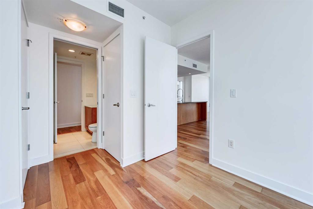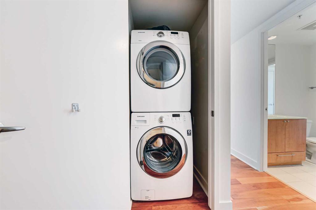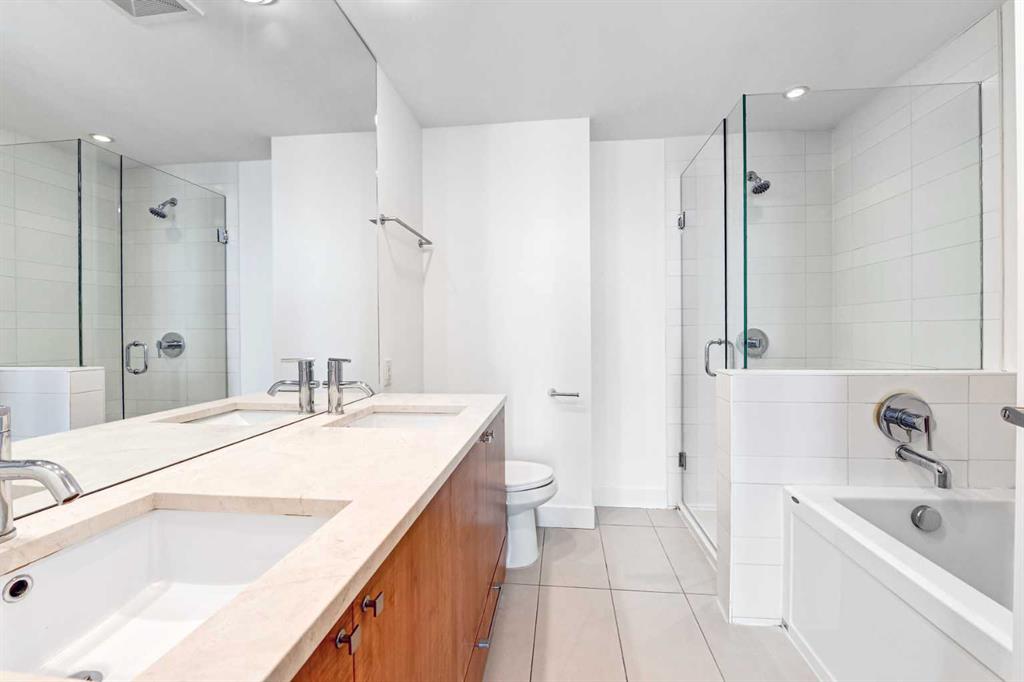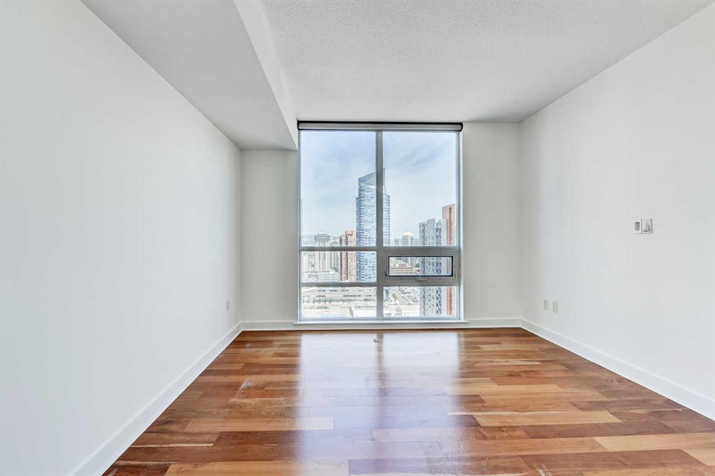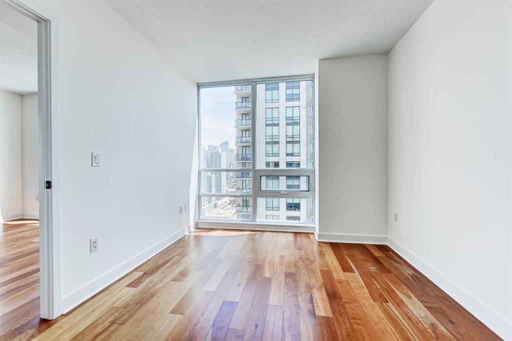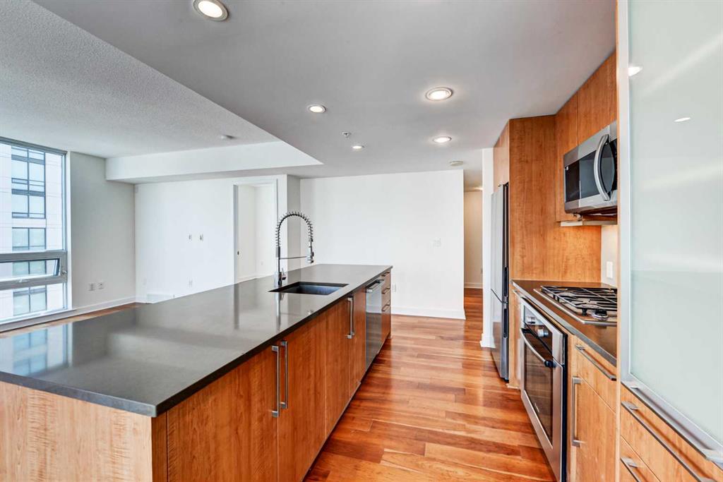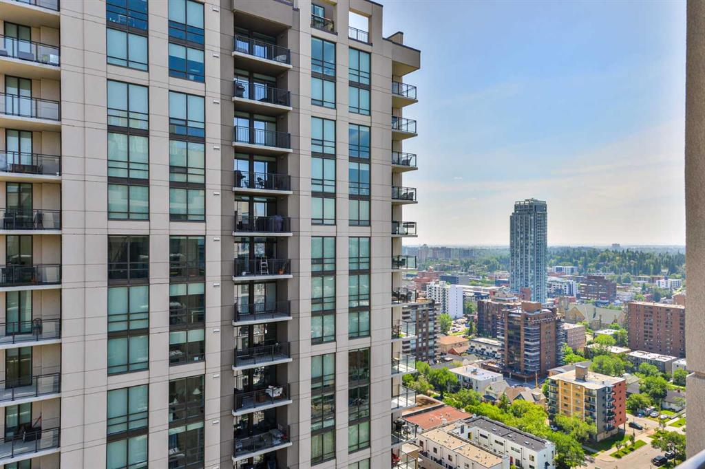 Experience elevated urban living in this stunning sub-penthouse unit on the 24th floor of the Nova Building, featuring one of the most spectacular panoramic NE corner views in the city. This highly coveted floor plan offers 2 bedrooms + den, 2 full bathrooms, titled underground parking, and 2 storage lockers, providing exceptional comfort and convenience. Recently updated throughout, this move-in-ready home has been freshly painted, including ceilings, with new doors and baseboards adding a crisp, modern finish. The open-concept layout features floor-to-ceiling windows, flooding the space with natural light and showcasing the breathtaking skyline. Interior details include luxury wide-plank laminate hardwood flooring, quartz countertops, a massive kitchen island, and brand-new, never-used stainless steel appliances including a fridge, microwave/hood fan, and dishwasher. Perfect for entertaining or day-to-day living, the seamless flow between the kitchen, dining, and living areas makes this home both functional and inviting. The generously sized primary suite offers a true retreat with a spacious walk-through closet leading to a spa-inspired ensuite featuring dual vanities, a soaker tub, and a separate glass shower. The Nova offers premium amenities, including a fully equipped fitness centre, sauna, residents’ lounge/party room, and landscaped courtyard. Located in the heart of the Beltline, you’re just steps to 17th Avenue’s vibrant dining, shopping, and nightlife, with Co-op grocery store right across the street for ultimate convenience. Don’t miss this opportunity to own one of the best units in the building.