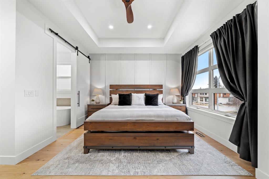 Ascending the gorgeous open-riser staircase, the upper level continues with hardwood flooring throughout. Here you’ll find two generous secondary bedrooms with custom built-in closet systems, a spacious laundry room, a well-appointed four-piece bathroom, and a serene primary retreat. The primary suite features soaring ceilings, a designer feature wall, and a spa-inspired ensuite complete with heated tile floors, dual vanities, a steam shower, and a deep soaker tub—your own private escape at the end of the day.