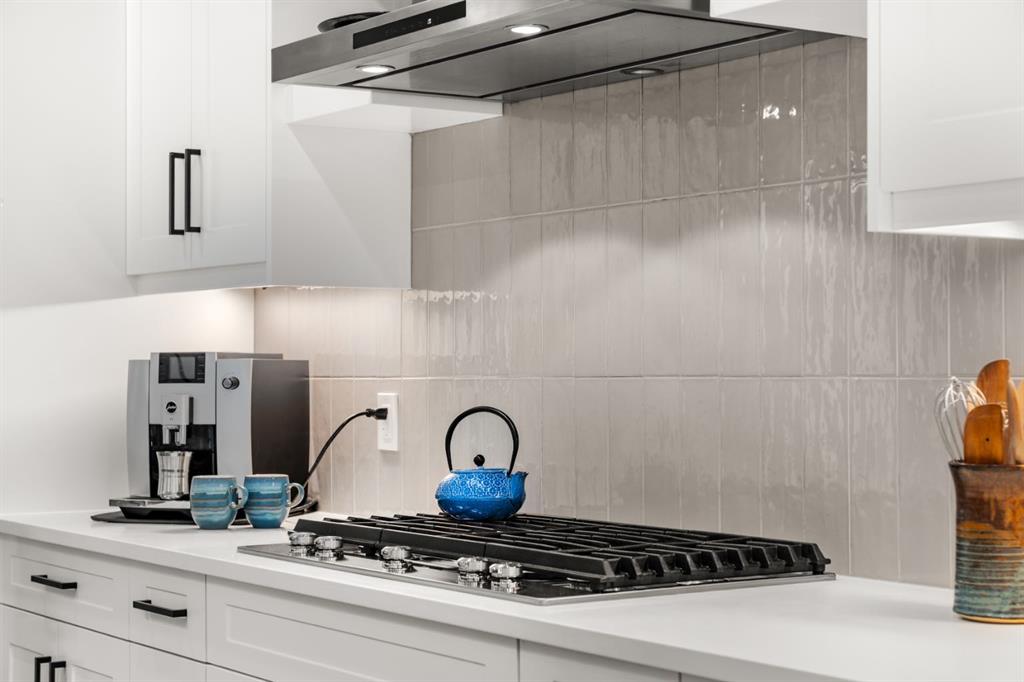 The main level is designed for both entertaining and relaxed daily living, featuring 10-ft painted ceilings, wide-plank engineered hardwood flooring, and extensive custom built-ins throughout. The heart of the home is the stunning kitchen, highlighted by ceiling-height white cabinetry with glass accents, under-cabinet lighting, and an incredible oversized quartz island—perfect for gathering, hosting, or casual family meals. High-end stainless steel appliances, including a gas cooktop, complete the space, while the dining area is elevated by a striking decorative feature wall. The living room is filled with warm afternoon light from west-facing windows and anchored by a beautifully tiled fireplace, creating an inviting and refined atmosphere.