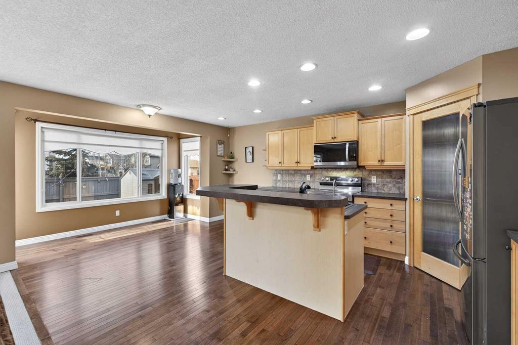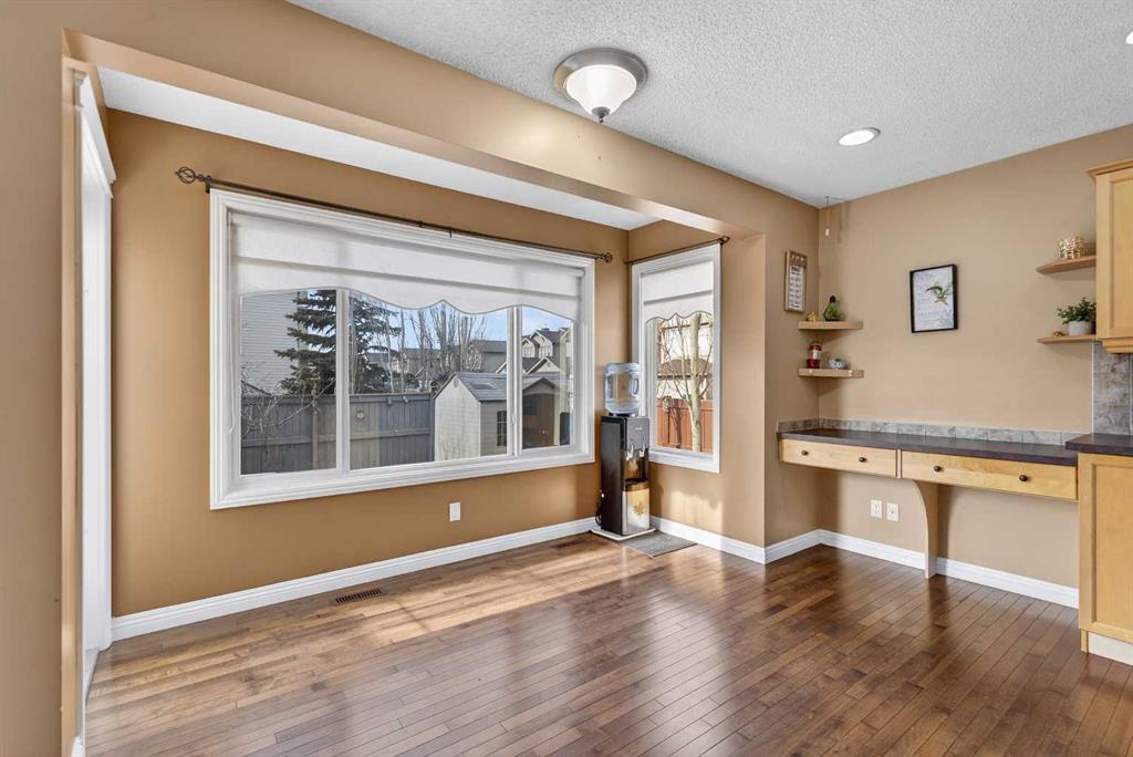 The main level features hardwood flooring and an open-concept design anchored by a living room with gas fireplace and custom built-in entertainment unit. A formal dining area provides flexibility for entertaining, workspace, or additional living use. The kitchen is equipped with ample cabinetry, a breakfast nook, and direct access to a west-facing deck overlooking the private backyard. A two-piece bathroom and a laundry area with garage access complete the main floor.
