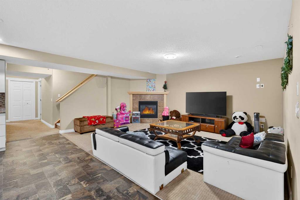 The professionally finished basement provides added versatility, featuring a recreation room, family room with corner fireplace, a fourth bedroom, four-piece bathroom, and a second kitchen. The basement is developed as an illegal suite and may be suitable for extended family living or supplemental income, subject to municipal approval.