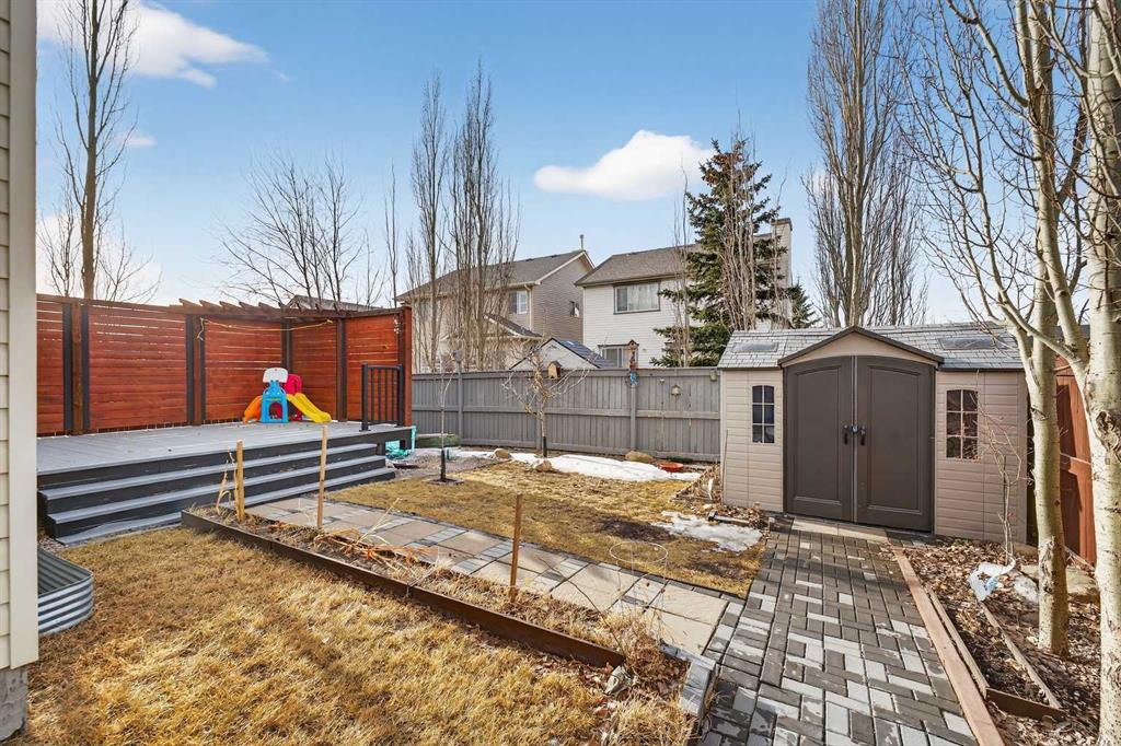 The west-facing backyard is fully fenced and landscaped, offering a spacious deck with privacy screen, rock accents, and a storage shed—ideal for outdoor living and entertaining. The heated double attached garage includes its own furnace for year-round comfort and functionality.