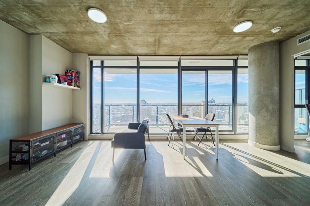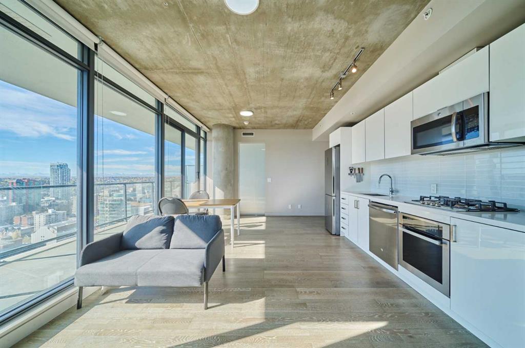 Investors calling! welcome to this newly built south facing appartment unit located in the heart of downtown calgary. convenient to do everything in your daily life. this amazing two bed, 1 bath unit located on the 24th floor of the 6th and tenth building, The views here are spectacular, with both unobstructed South-West visibility of the mountains and fulsome city skyline to the east. As impressive as the panoramic sightseeing, the condo is equally as stunning and incredibly functional. You’ll immediately notice the mix of industrial and modern finishes, the warm hardwood floors, and the floor to ceiling windows flooding the space with natural light. The kitchen features high gloss cabinetry, quartz counters, subway tile backsplash, built-in stainless steel appliances and built in gas range and oven. The highlights of the primary bedroom are full views Calgary tower and downtown skyline, and a loft-like feel with concrete walls and ceiling finish. The closet is outfitted with custom wardrobes to optimize space and functionality. The 4 piece bathroom has a neutral and calm colour palette paired with bright hardware- it standouts to other units with upgraded, custom shower glass doors. The good sized second bedroom also features wardrobe organizers, floor to ceiling windows, and full sight of the Rocky Mountains. This second bedroom is versatile and can also be utilized as an amazing work from home space. The sliding glass door is dually functional as a private barrier and whiteboard. In-suite full-sized laundry, titled underground parking, and separate titled storage space complete the package. The building amenities are top notch and include an executive concierge, overnight weekend security, a luxurious owners lounge, fitness room, plunge pool with a large common area deck, bike storage and visitor parking. 6th & Tenth is located in the lively Beltline community and close to all the downtown business, shopping & eating districts. Whether this is an investment property (Air BnB Allowed!) or a primary residence, you don’t want to miss this opportunity to own this sleek city condo!