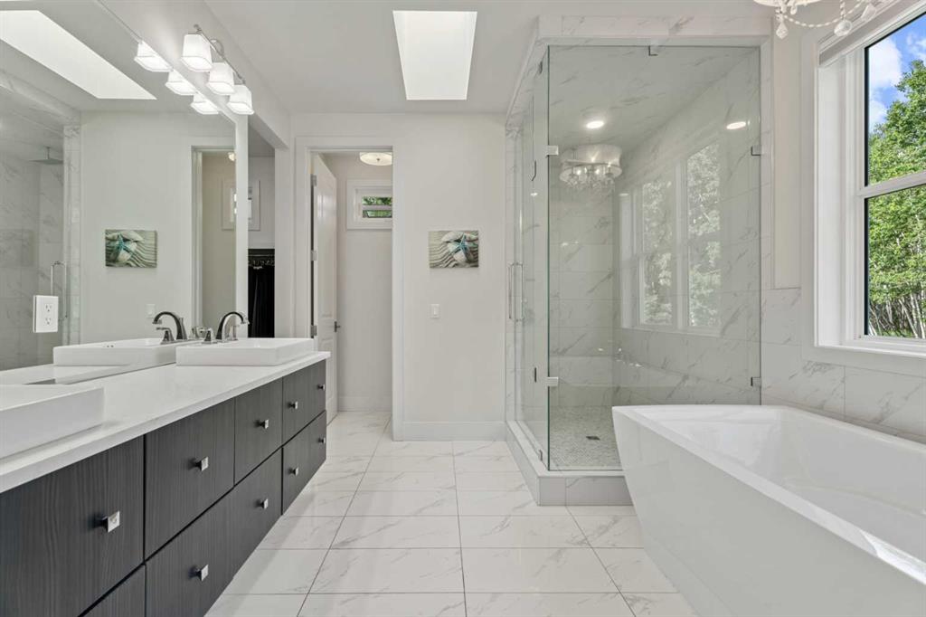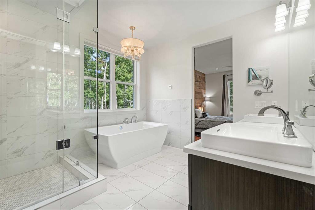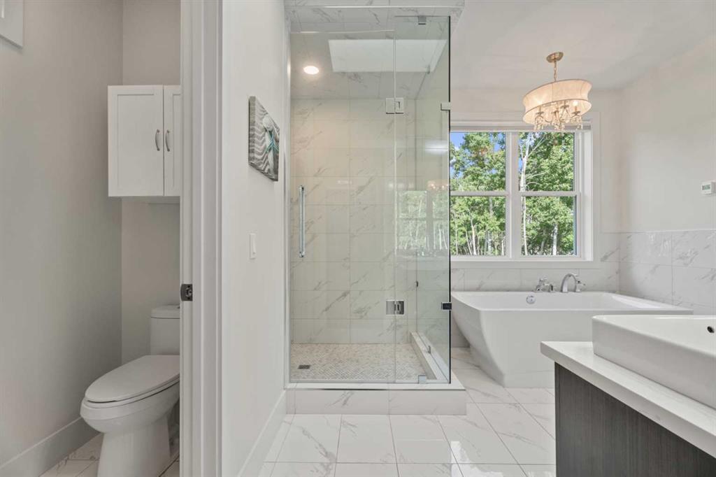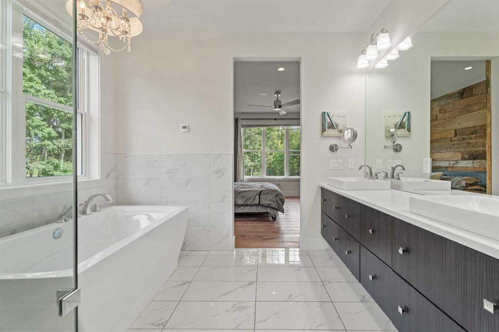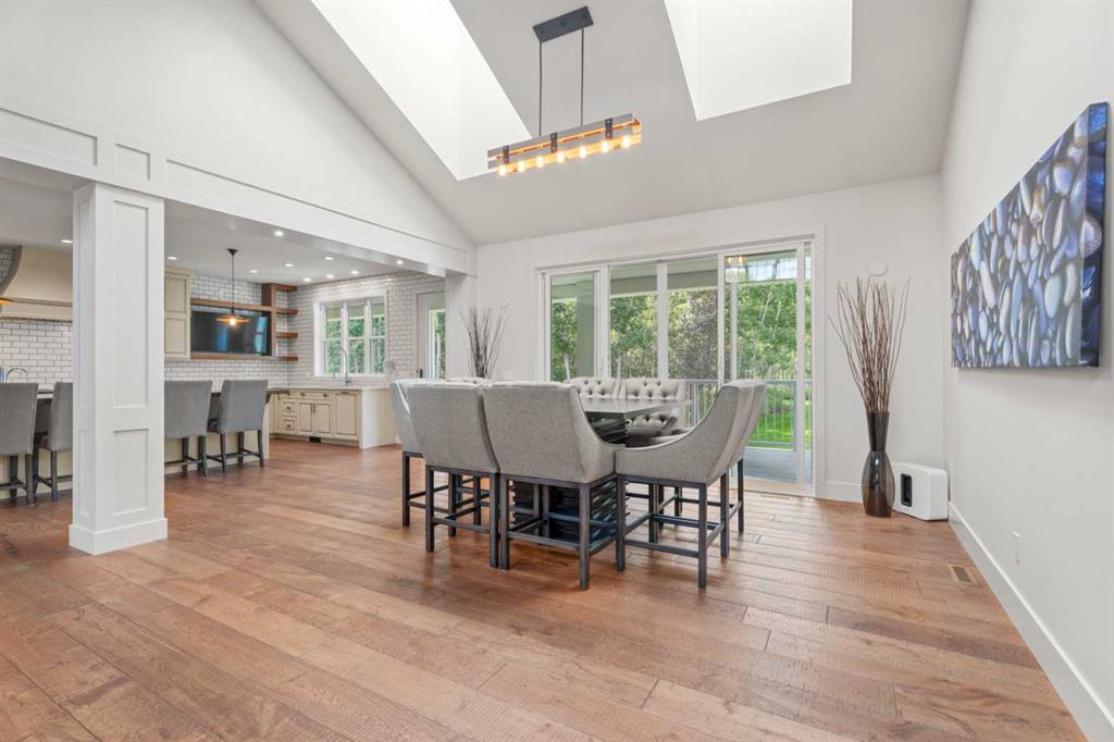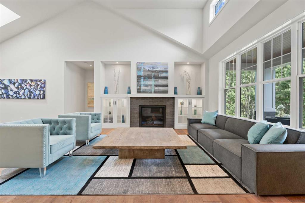 Car enthusiasts!! Set on 5.14 acres of stunning treed and open landscape, just minutes from Calgary and Okotoks, this exceptional custom-built modern farmhouse offers a rare balance of architectural refinement, privacy, and natural beauty. Designed for those who appreciate craftsmanship and quiet luxury, the home presents as a private estate—serene, elegant, and timeless. A paved, curved driveway leads to a gated entrance, introducing a picturesque setting of green space and mature trees. Inside, 17-foot vaulted ceilings and expansive windows fill the main living spaces with natural light, creating an immediate sense of openness and calm. The living room is anchored by a refined gas fireplace and custom built-ins, offering a warm and inviting atmosphere for both everyday living and intimate gatherings.