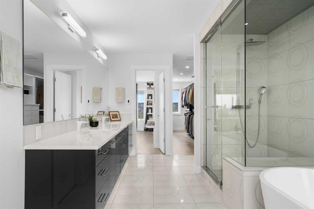 Upstairs, the 2nd floor offers a bonus room, two bedrooms (one with private ensuite), a 4-piece bath, and a full laundry room with sink and cabinetry. The entire 3rd floor is a private primary retreat with a large bedroom with blackout blinds, private balcony with views, a dream walk-in closet with custom organizers and drawers, and a spa-like ensuite with heated floors, dual vanity, soaker tub, and custom glass steam shower with rain head and bench.