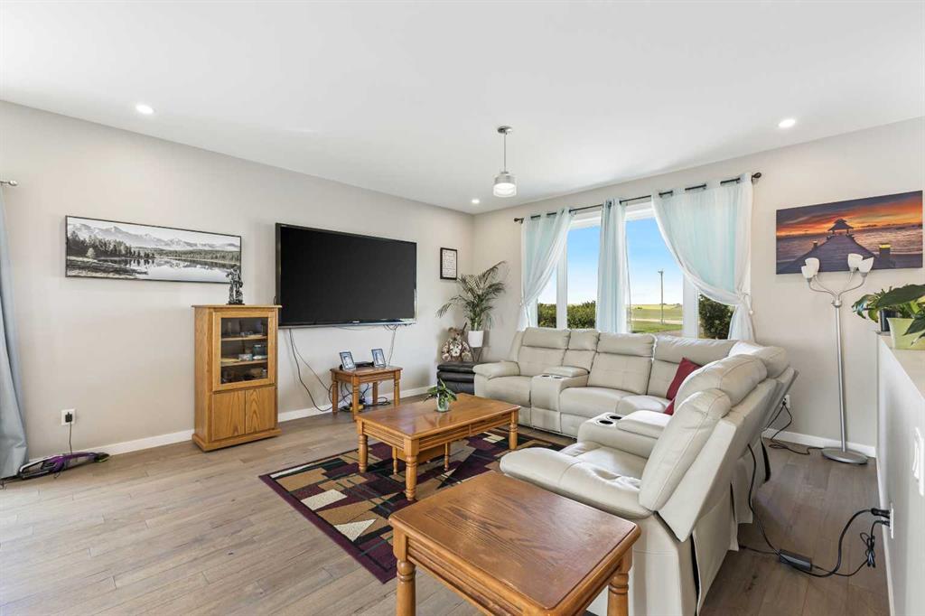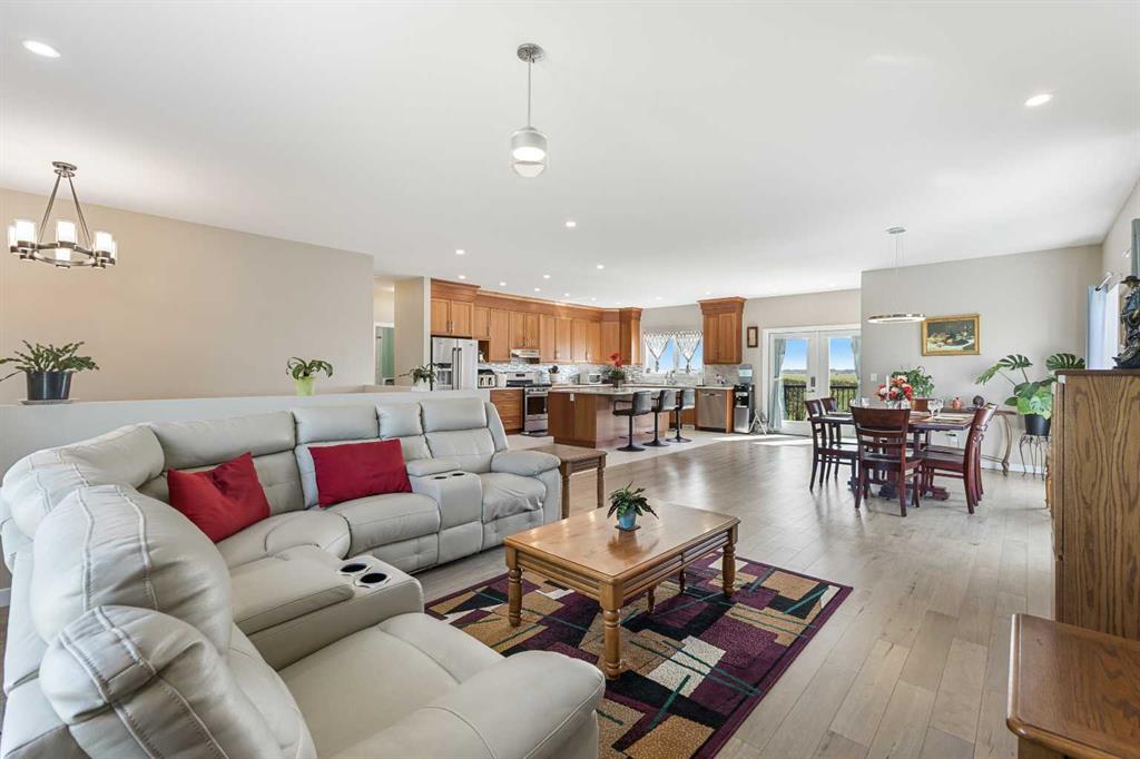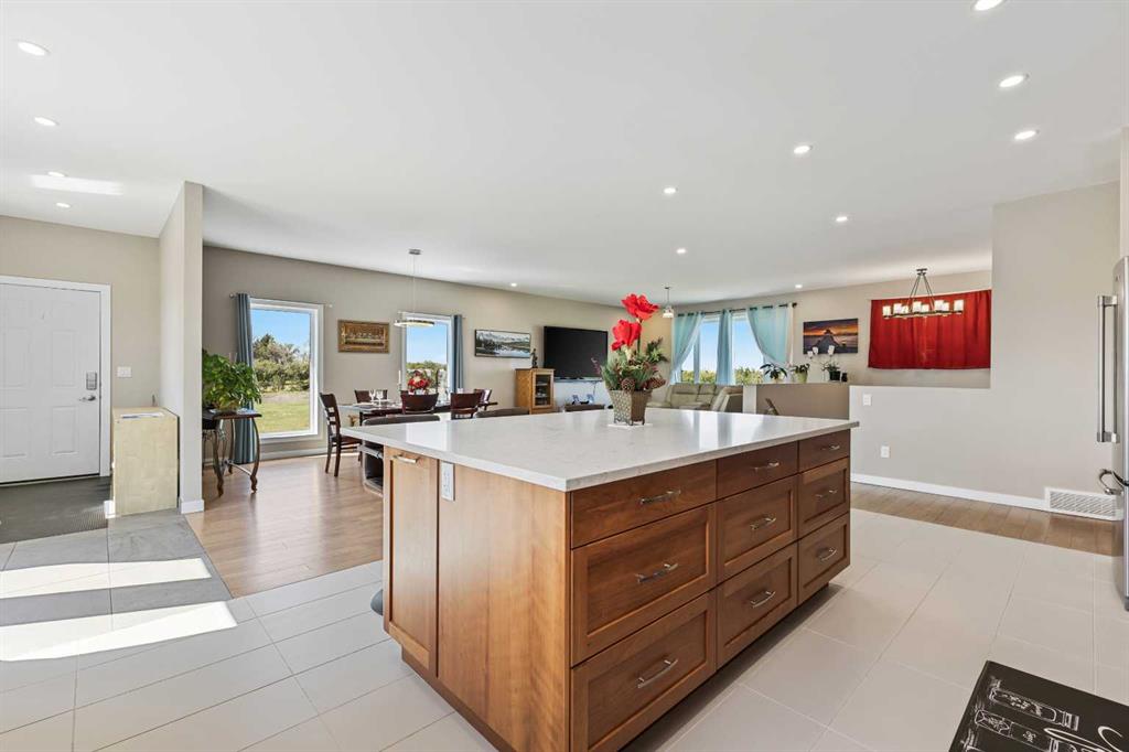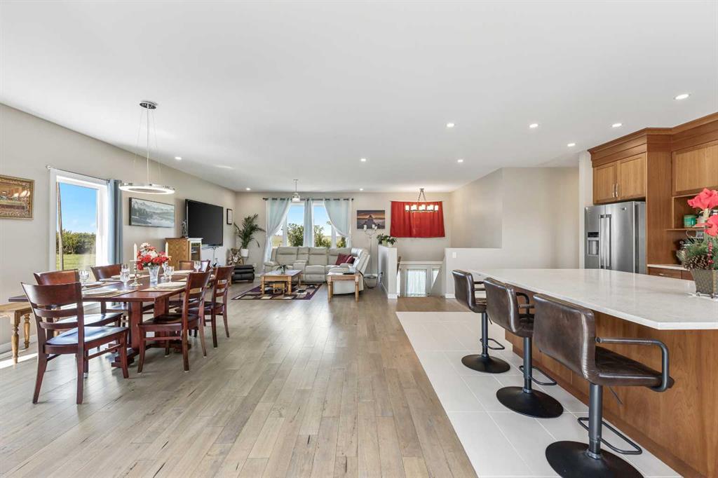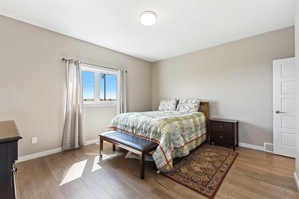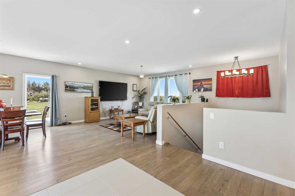 **Welcome to your spacious acreage just minutes from Strathmore!** Enjoy the perfect balance of country serenity and city convenience with quick access to all amenities and an easy commute to Calgary via Highway 1. Set on 5 acres with paved access and no gravel roads, this impressive property offers breathtaking west-facing mountain views on clear days. The well designed, air-conditioned bi-level home offers over 3,760 sq. ft of developed living space, featuring five bedrooms (plus two potential rooms you could convert to extra bedrooms) and three full bathrooms. The primary suite is a true retreat with a large walk-in closet and a beautifully appointed ensuite with dual vanities. Recent upgrades include hardwood floors and a custom gourmet kitchen with quartz countertops, ample cabinetry, and a large island—ideal for entertaining. The bright dining and living areas are framed by west-facing windows that capture stunning sunsets. The fully developed basement boasts in-floor heating, and includes a large family room, three additional bedrooms, a full bathroom, a laundry room, and a versatile flex/storage space. The home is equipped with triple-glazed windows, Hardie board siding, a Dura Deck, two sump pumps, a boiler, a forced air system, and in-floor heating throughout. Central air conditioning keeps the home comfortable year-round. Outside, the 45′ x 40′ heated shop is a showstopper. It includes 220V power, 12-foot and 18-foot doors, and space to accommodate up to nine vehicles, making it perfect for car enthusiasts, contractors, or hobbyists. This is more than just a home—it’s a lifestyle. Schedule your private viewing with your favourite real estate professional today.