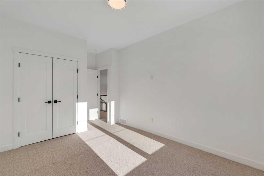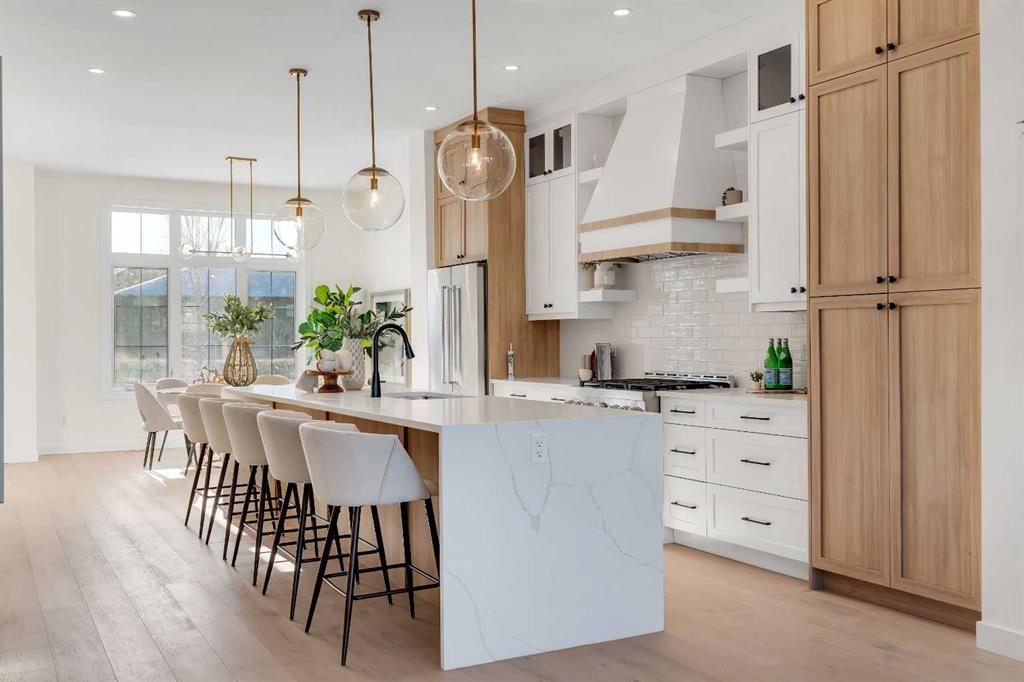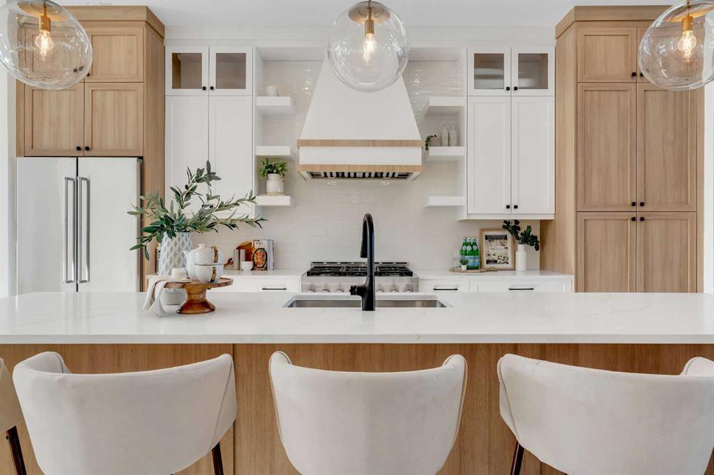 Welcome to this beautiful, brand-new semi-detached home in the sought-after community of Killarney. Featuring a fully finished walk-up basement and a double detached garage, this home blends a functional layout with stylish, high-quality finishes that are both modern and comfortable. Step inside to a bright, open-concept main floor highlighted by wide-plank hardwood flooring throughout. The front foyer includes a practical built-in with vertical shiplap detailing, offering both charm and everyday organization. The kitchen is the true centerpiece of the home, anchored by a large waterfall quartz island with seating. Stainless steel appliances — including a gas range — pair perfectly with the two-tone cabinetry in warm wood and crisp white for a timeless, contemporary feel. The kitchen flows seamlessly into the dining area and living room, where wall-to-wall sliding glass doors flood the space with natural light and provide easy access to the backyard. A standout feature here is the gas fireplace, finished with beautiful dark floral tile that adds personality without overpowering the space. A convenient two-piece powder room completes the main level. Upstairs, you’ll find three generously sized bedrooms along with a dedicated upper-floor laundry room. The primary suite is a relaxing retreat, complete with a tray ceiling and a walk-in closet. The spa-inspired five-piece ensuite offers a dual vanity, glass-enclosed shower, and a freestanding soaker tub — perfect for unwinding at the end of the day. The fully finished lower level features a walk-up entrance that brings in additional light and provides direct backyard access. This level includes a spacious rec room with a built-in wet bar, wine storage, sink, and floating shelves — ideal for entertaining. A fourth bedroom and a full four-piece bathroom make this space perfect for guests, a roommate, or older children wanting more privacy. Situated on a quiet street, this home offers an unbeatable location close to everything Killarney has to offer. You’re within walking distance of the Killarney Aquatic Centre, Shaganappi Point C-Train station, and the shops and restaurants along 17th Avenue. This is an excellent opportunity to own a move-in-ready home in one of Calgary’s most desirable inner-city neighbourhoods.