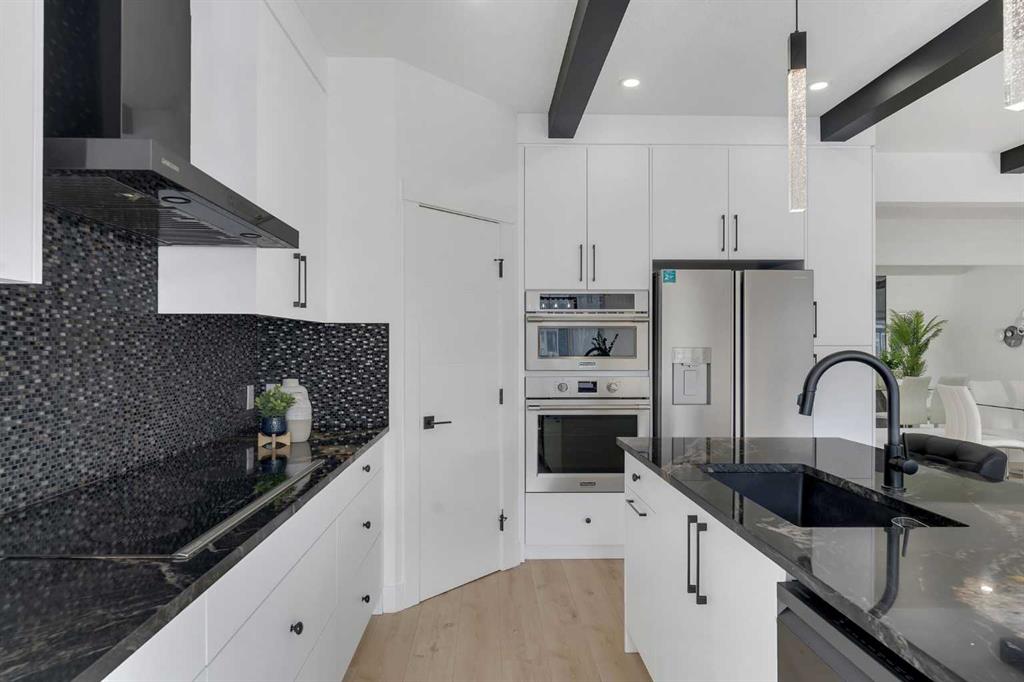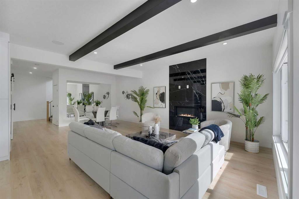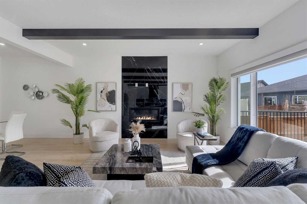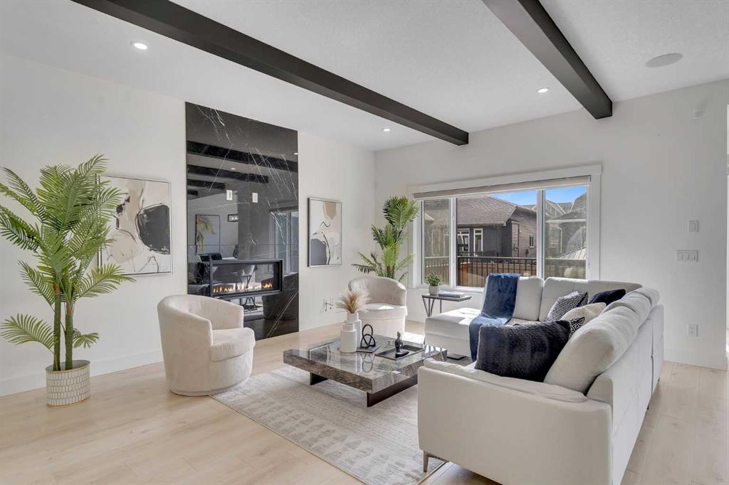 The chef-inspired kitchen is beautifully upgraded with built-in appliances, a chimney-style hood fan, ceiling-height cabinetry, and sleek black hardware throughout. The living room showcases a striking feature fireplace with bold black tile detailing, adding warmth and sophistication. Large windows across the main floor allow for an abundance of natural light, while the elegant spindle railing enhances the overall design.