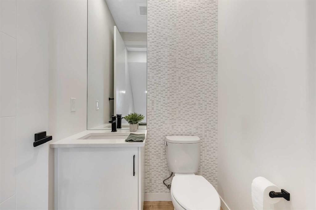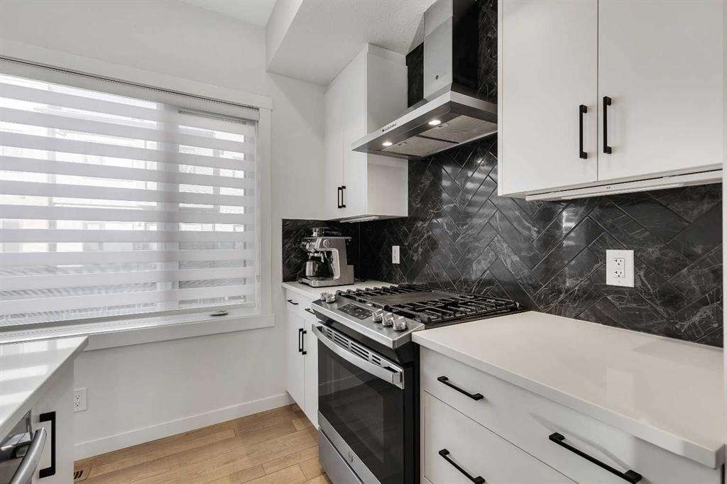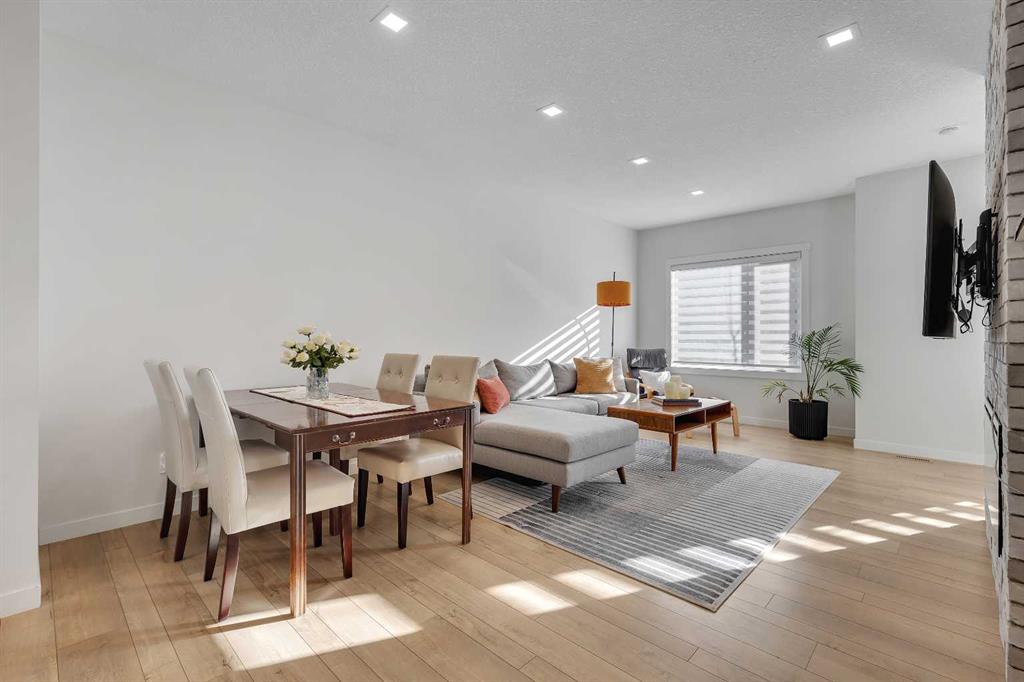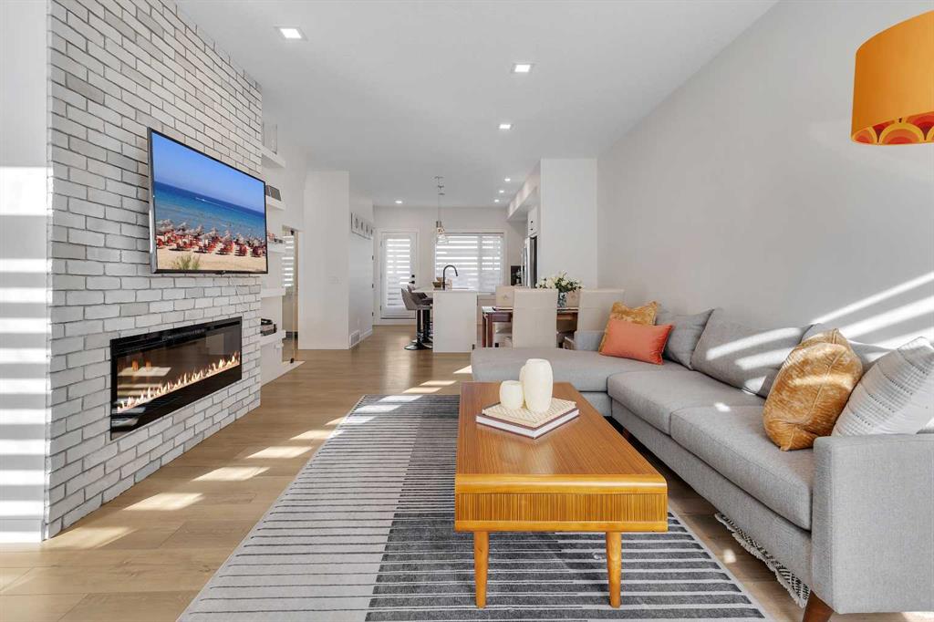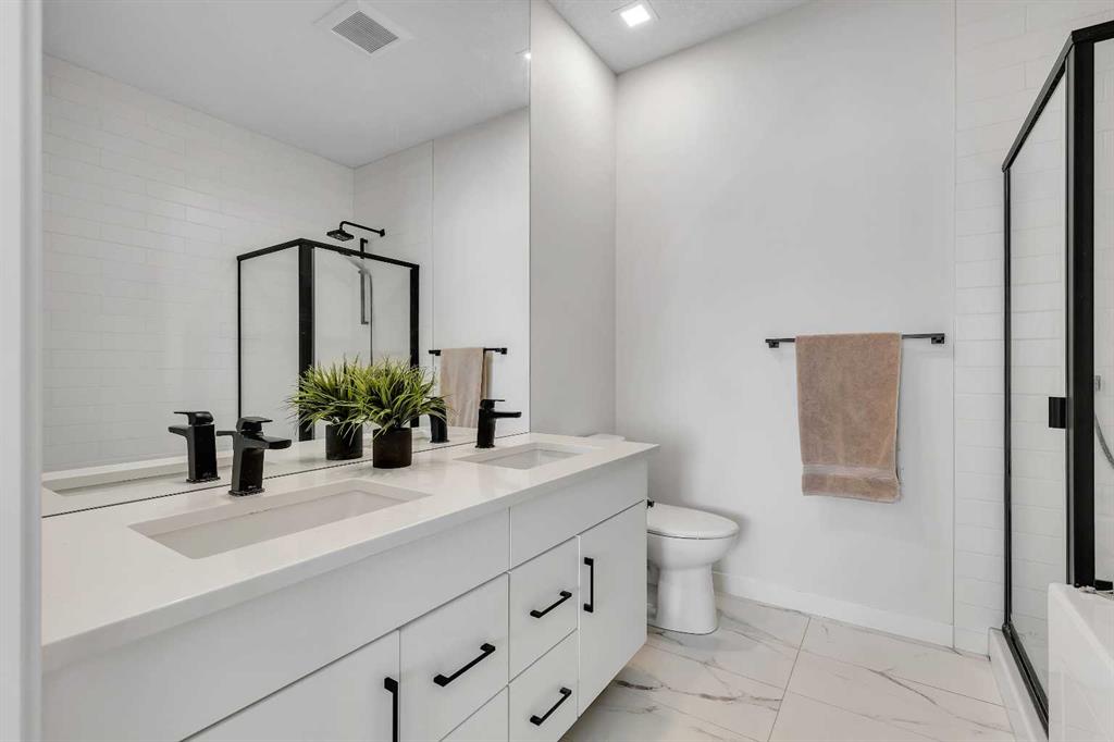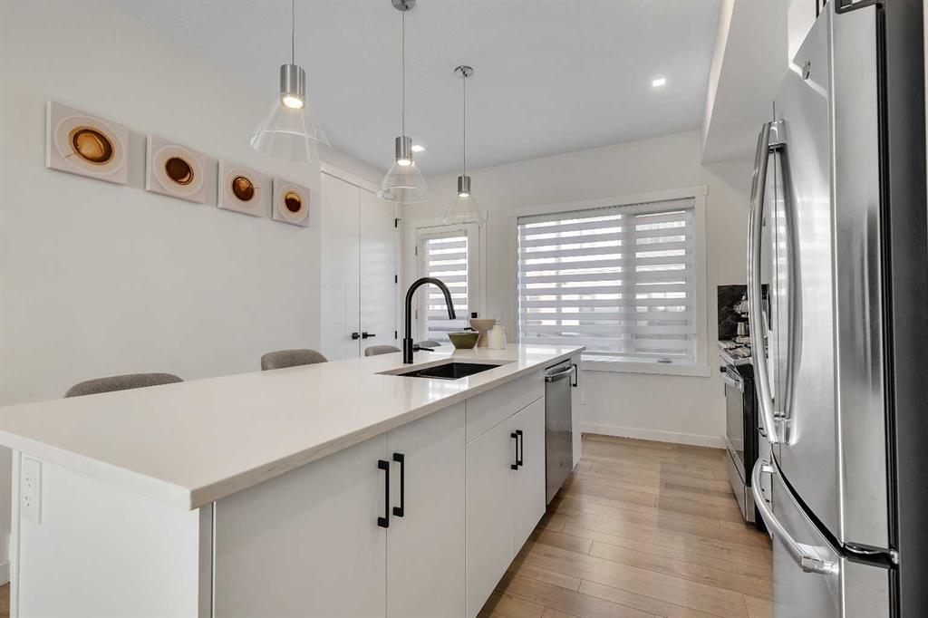 Welcome to Artis in Greenwich — a luxury townhome collection located in one of Calgary’s newest master-planned community. Greenwich spans 59 acres in NW Calgary and blends brownstone architecture with boutique urban living. Home to the Calgary Farmers’ Market West, the community offers an impressive selection of cafés, restaurants, walking paths, parks, and stunning views of WinSport and the Rocky Mountains. This townhome features 1,562 sq ft of thoughtfully designed living space, including a double-primary bedroom layout, a ground-level flex room with a full bathroom, in-floor heating, and a double attached garage. The ground level offers 268 sq ft with a spacious foyer, a versatile flex room currently used as a gym, a 3-piece bathroom, and direct access to the garage. The main level provides 637 sq ft of open-concept living with a bright kitchen, dining area, and living room. The upgraded kitchen package includes sleek white cabinetry with black hardware, stainless steel appliances, gas stove and a designer hood fan. The striking black herringbone-patterned tile backsplash frames the stove area beautifully, creating a focal point balancing the lighter elements of the kitchen. A large island with undermount sink and sleek chrome faucet creates a comfortable seating area to enjoy quick meals or is the perfect gathering spot. From kitchen, step onto the deck equipped with a gas BBQ line. The laundry room is just off the kitchen. The living room is warm and inviting with south-facing windows, an electric fireplace with brick surround, and access to a second balcony which is south facing and overlooks the central courtyard. Upstairs, you’ll find and additional 657 sq ft with two spacious primary bedrooms, each with its own ensuite — one a 5-piece and the other a 4-piece. Additional upgrades include glass panels on stairwells, undermount sinks with full-height tile and mirrors in the bathrooms, upgraded lighting and window coverings, and air conditioning. The double attached garage includes 2 wall heaters and opens up to a off-street double parking pad. The exterior showcases timeless brownstone styling with James Hardie siding, full brick accents, and stucco finishes, offering durability and low-maintenance living. Greenwich’s location is exceptional — just 20 minutes to downtown, quick access north or south, and under an hour to Canmore and Banff. With parks, playgrounds, and the Farmers’ Market within walking distance, this is urban-inspired living at its best. The sellers have been fortunate to have an excellent tenant in place, who is willing to remain should the buyer wish to purchase the property as an investment.