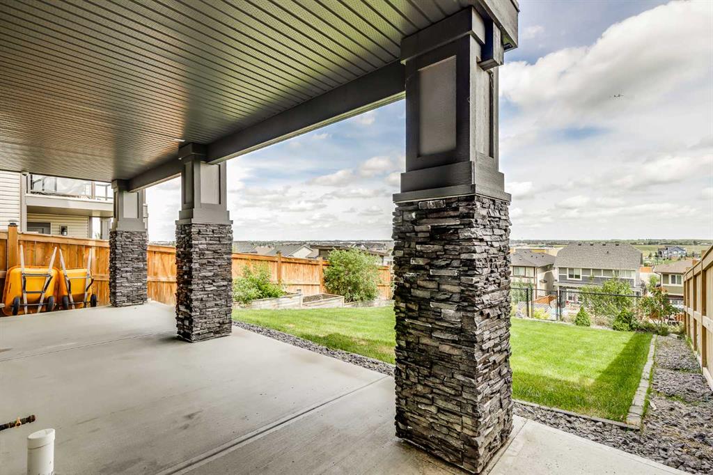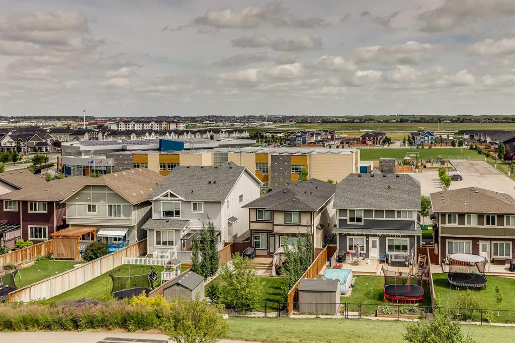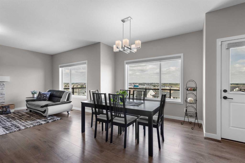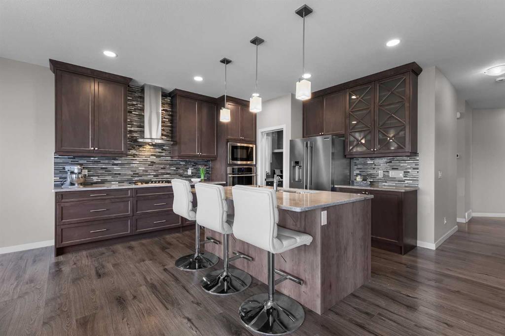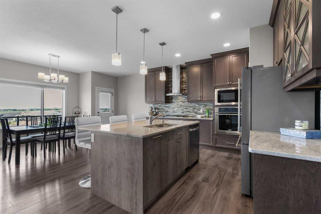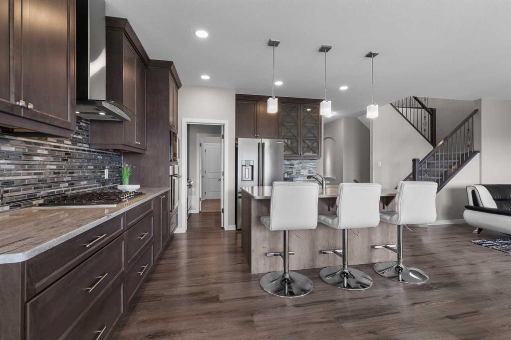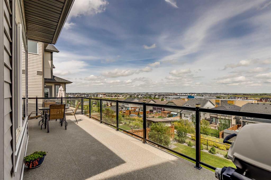 Beautifully appointed & ideally located, this 6-bedroom walkout home with a LEGAL suite, dream garage & premium upgrades delivers upscale comfort, functional design & long-term versatility. Backing onto a scenic pathway leading to Northcott Prairie School & a peaceful pond, this home blends family-friendly convenience with elevated style. Smart lights & switches are installed throughout, with cameras & door sensors on all entry points. Wide plank flooring, curved staircase & railings, bullnose corners, a soft neutral palette & expansive windows create a warm, welcoming atmosphere. The open layout encourages connection, from quiet evenings by the gas fireplace to lively gatherings in the oversized dining area. The modern kitchen inspires culinary creativity with full-height cabinetry, glass backsplash, gas cooktop, built-in wall oven, under-cabinet lighting rough-in & a statement island for casual meals. A walk-through butler’s pantry adds efficiency with a second gas stove, prep sink & extra storage. Two spotlight-lit alcoves add stylish display options. Step outside to the full-width upper deck with glass railings, gas & water lines & take in tranquil views. A private den provides a quiet space for work or study. Upstairs, a spacious bonus room invites family downtime, while four large bedrooms ensure room for all. The elegant primary retreat includes a walk-in closet & spa-inspired ensuite with dual sinks, soaker tub & glass shower. A secondary bedroom with private 3-pc ensuite is perfect for guests or teens, while a shared 4-pc bath & upper laundry add daily ease. The finished walkout level adds incredible flexibility with a bright, open-concept legal suite featuring two bedrooms, a full kitchen with gas rough-in, professional metallic epoxy floors, under-cabinet lighting rough-in, separate laundry, 3-pc bath & private entry—ideal for multi-gen living or long-term guests. Outside, the yard features a covered lower patio with rough-in for a hot tub, both gas & water lines, garden beds & direct access to the pathway network. The charming front porch boosts curb appeal & makes a perfect morning coffee spot. The garage is a standout with gas line for future heater, hexagon LED lighting, pro-grade floor tiles, overhead storage & handy man door. Just a 5-min walk to school & 18-min stroll to shops, with easy access to QEII, CrossIron Mills & Calgary—this is a rare chance to live beautifully in a prime Airdrie location.