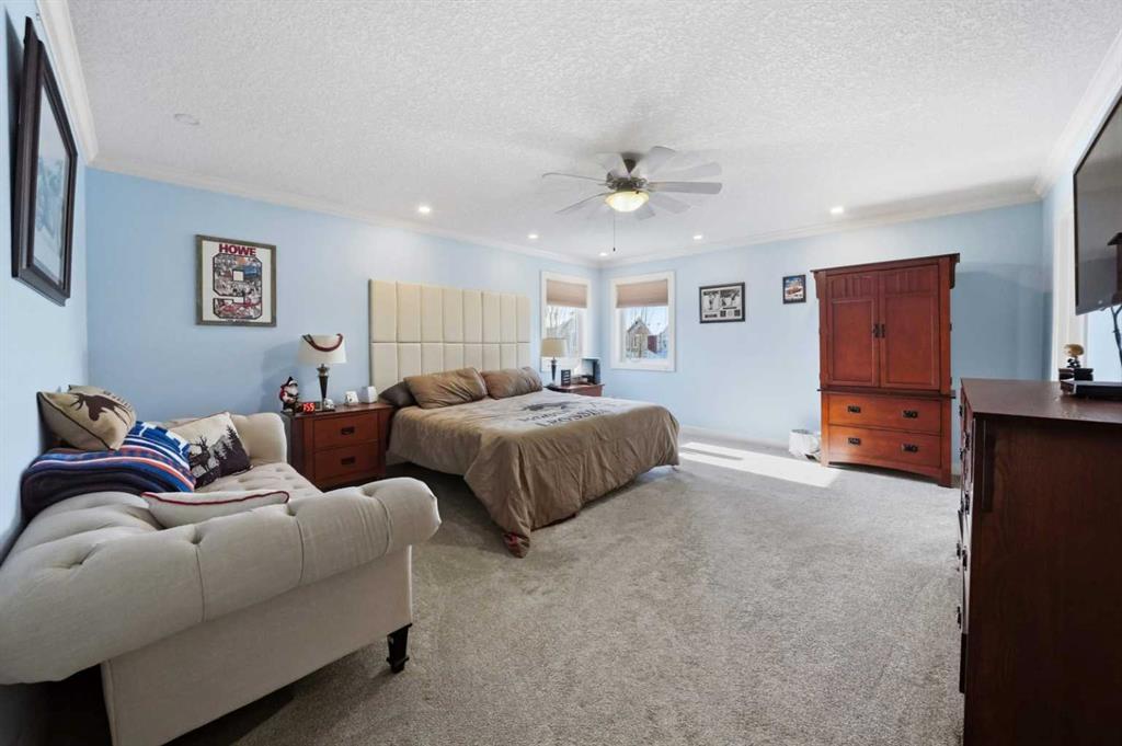Welcome to 247 Kingston Way SE — an exceptional executive home situated on a massive corner lot in the prestigious community of Kings Heights. Offering over 2,600 sq ft above grade plus a professionally developed basement, this rare 5-bedroom property combines luxury, space, and thoughtful upgrades with outstanding functionality for growing or multi-generational families. From the moment you step inside, you are greeted by soaring 9’ ceilings, expansive windows, and an abundance of natural light that fills the main level. The open-concept design is anchored by a stunning gourmet kitchen featuring granite countertops, high-end cabinetry, a convenient walk-through pantry, a huge island, and new stainless steel appliances including fridge, dishwasher, and stove. The kitchen flows seamlessly into the spacious dining area and inviting living room, highlighted by a cozy fireplace and custom built-ins — creating the perfect space for both everyday living and entertaining. A main floor den/home office offers privacy for remote work, while the bright sunroom provides additional flexible living space ideal for relaxing or hosting guests. Upstairs, the impressive primary retreat offers generous proportions, a walk-in closet with direct access to the ensuite, and a luxurious 5-piece ensuite designed for comfort and relaxation. Two additional large bedrooms share another 5-piece bath, plus laundry room, ensuring no one compromises on space. A vaulted bonus room with a second fireplace completes the upper level — perfect for movie nights or a quiet family retreat. The professionally developed basement expands your living space even further with two additional bedrooms, a full bathroom, a spacious recreation area, and ample storage. Significant recent upgrades include a new furnace, new 50-gallon hot water tank, new air conditioning unit (2023), new garage doors, and new carpet — providing peace of mind and modern comfort for years to come. The oversized triple attached heated garage is a true standout feature, offering incredible storage and functionality, including a unique rear overhead door providing direct access to the backyard. Outside, the west-facing yard is fully landscaped and designed for low maintenance, complete with a private deck, RV parking, storage shed, garden boxes and full fencing — ideal for entertaining, relaxing, or accommodating recreational vehicles. Located within walking distance to parks, scenic pathways, water features, new schools, shopping, and with convenient access out of town, this home offers executive living in one of Airdrie’s most desirable communities. A rare opportunity to own a move-in-ready estate property that delivers luxury, space, and lifestyle — all in one remarkable address.